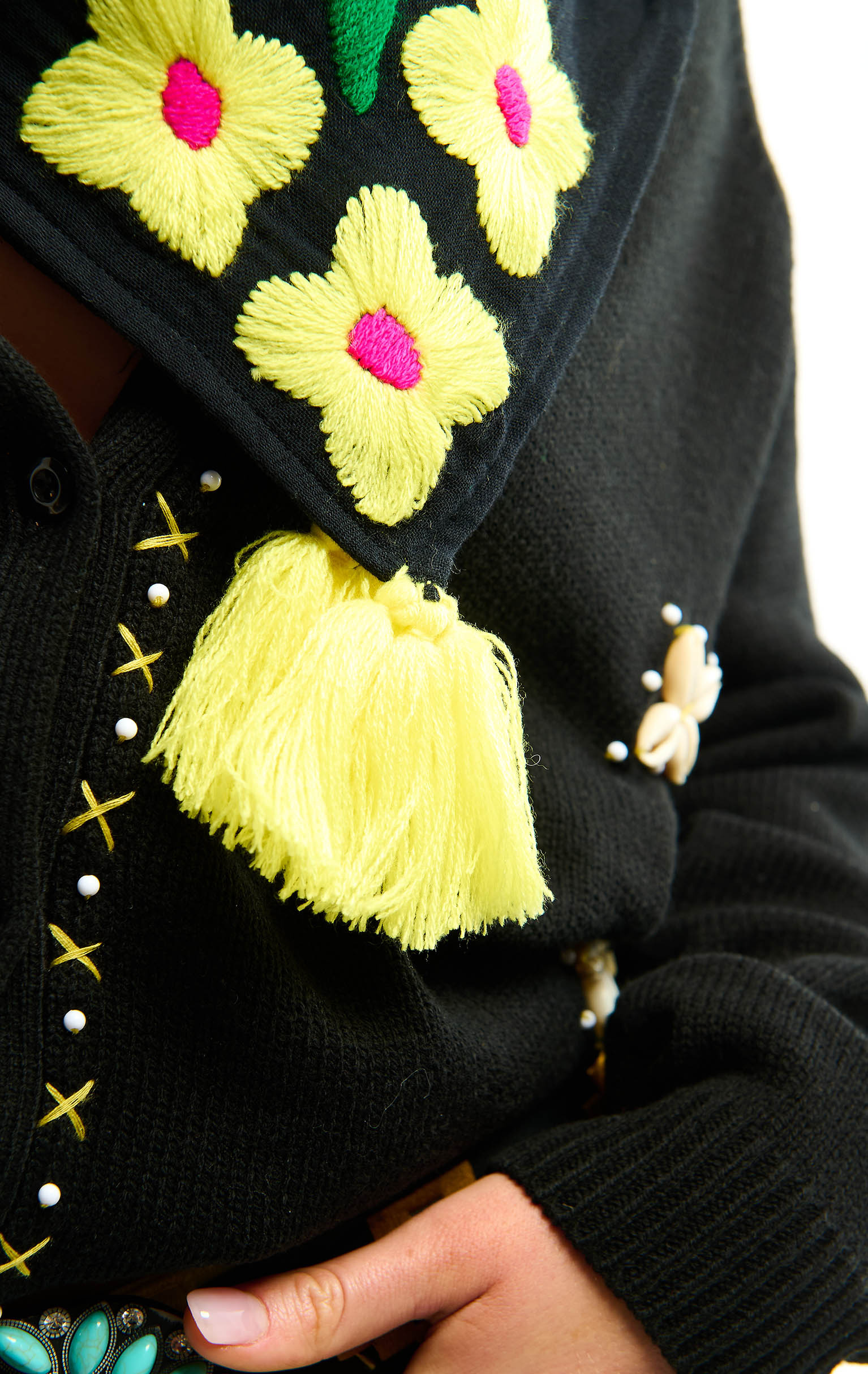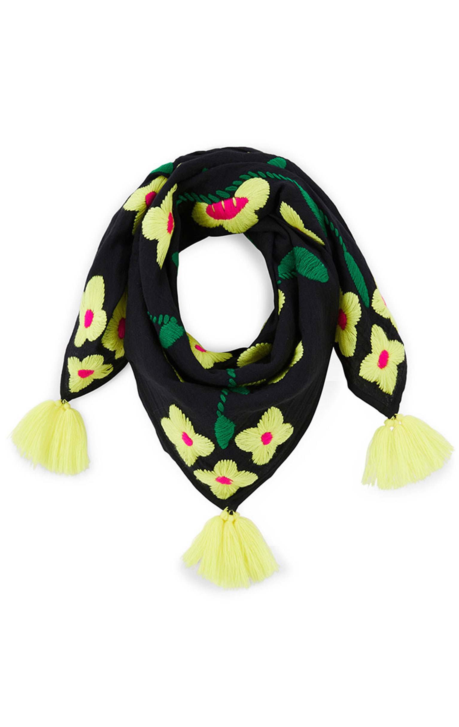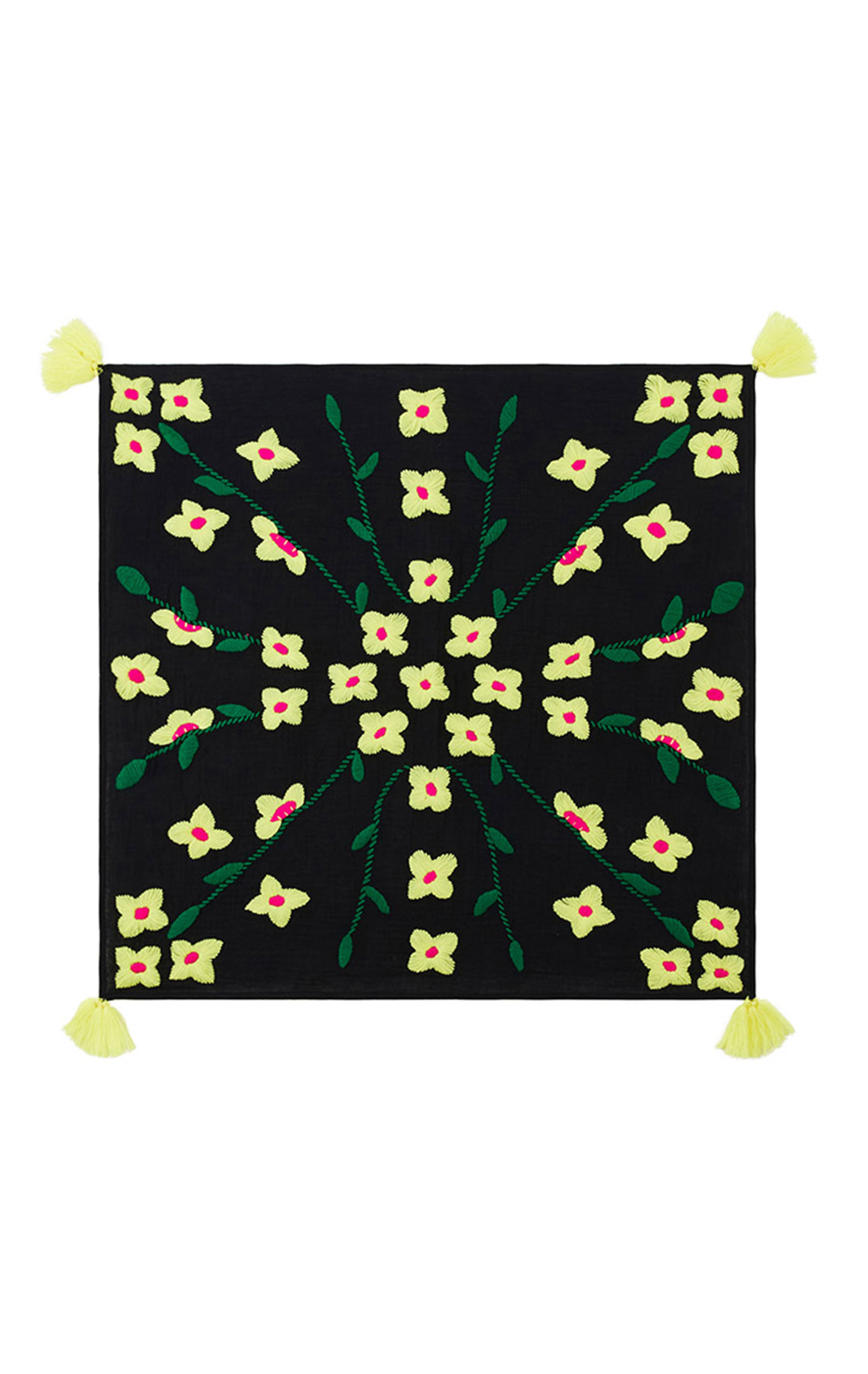 Square-shaped and adorned with generous tassels at each corner, it draws its spirit from the bohemian, retro and casual style of the 70s. Matching the KEYRA bra, it features the same color harmonies for a resolutely vintage and irresistible total look. Available in four colors, the black version is embellished with yellow and neon pink embroidered flowers.