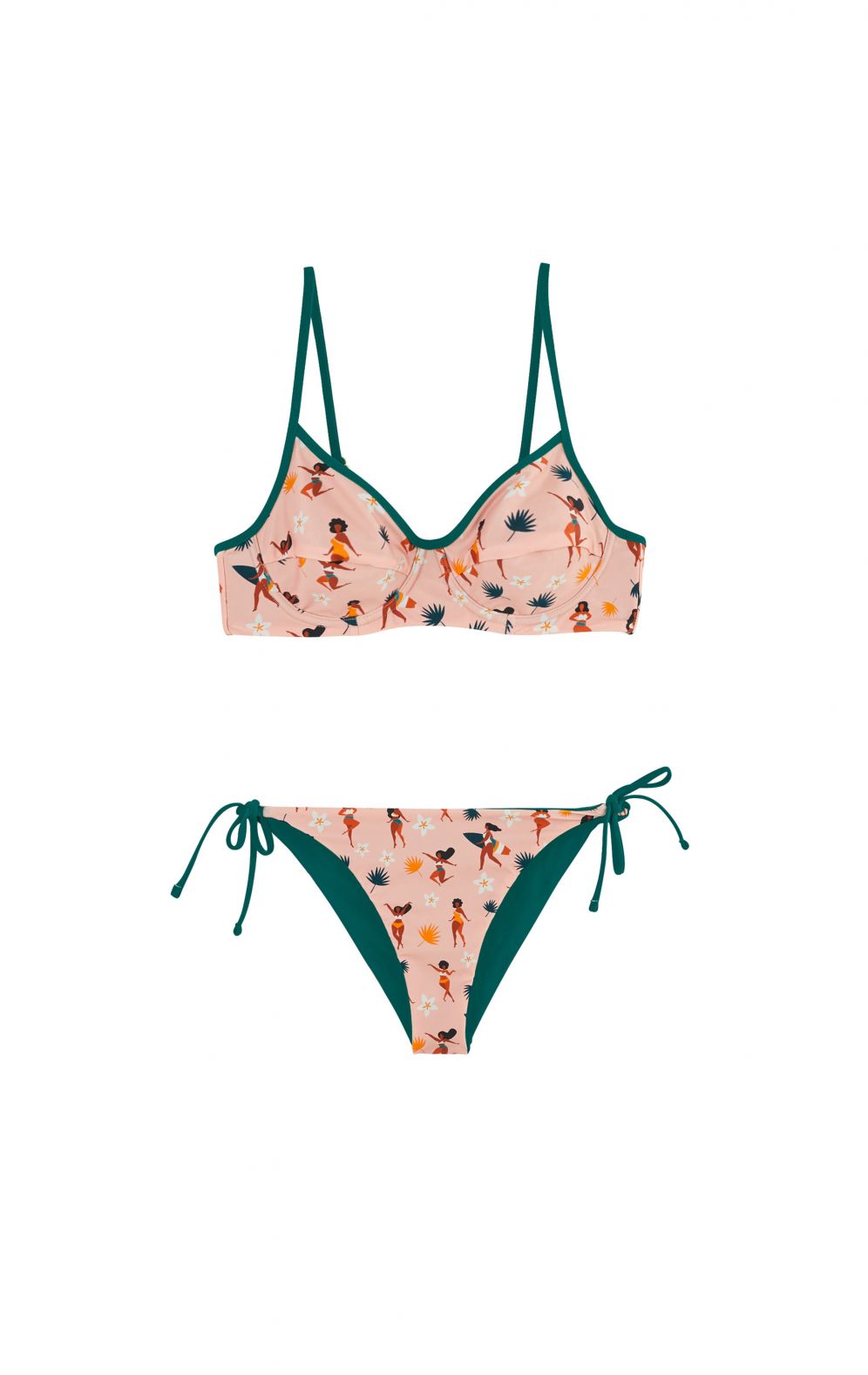 Le bikini, le modèle deux pièces : Une culotte unique aux détails de liens colorés, ni trop couvrante ni trop échancrée. L’ADN de Wild. Concernant les hauts, nous avons imaginé différentes formes pour convenir à chaque morphologie de femme :