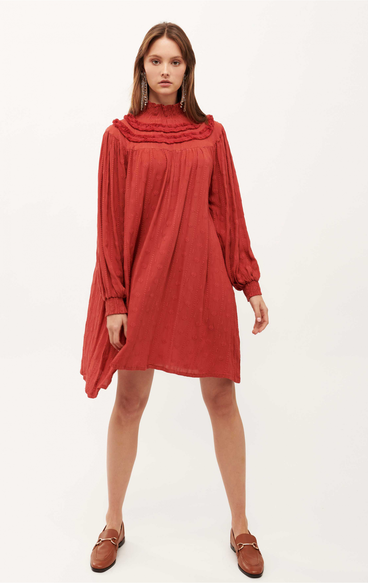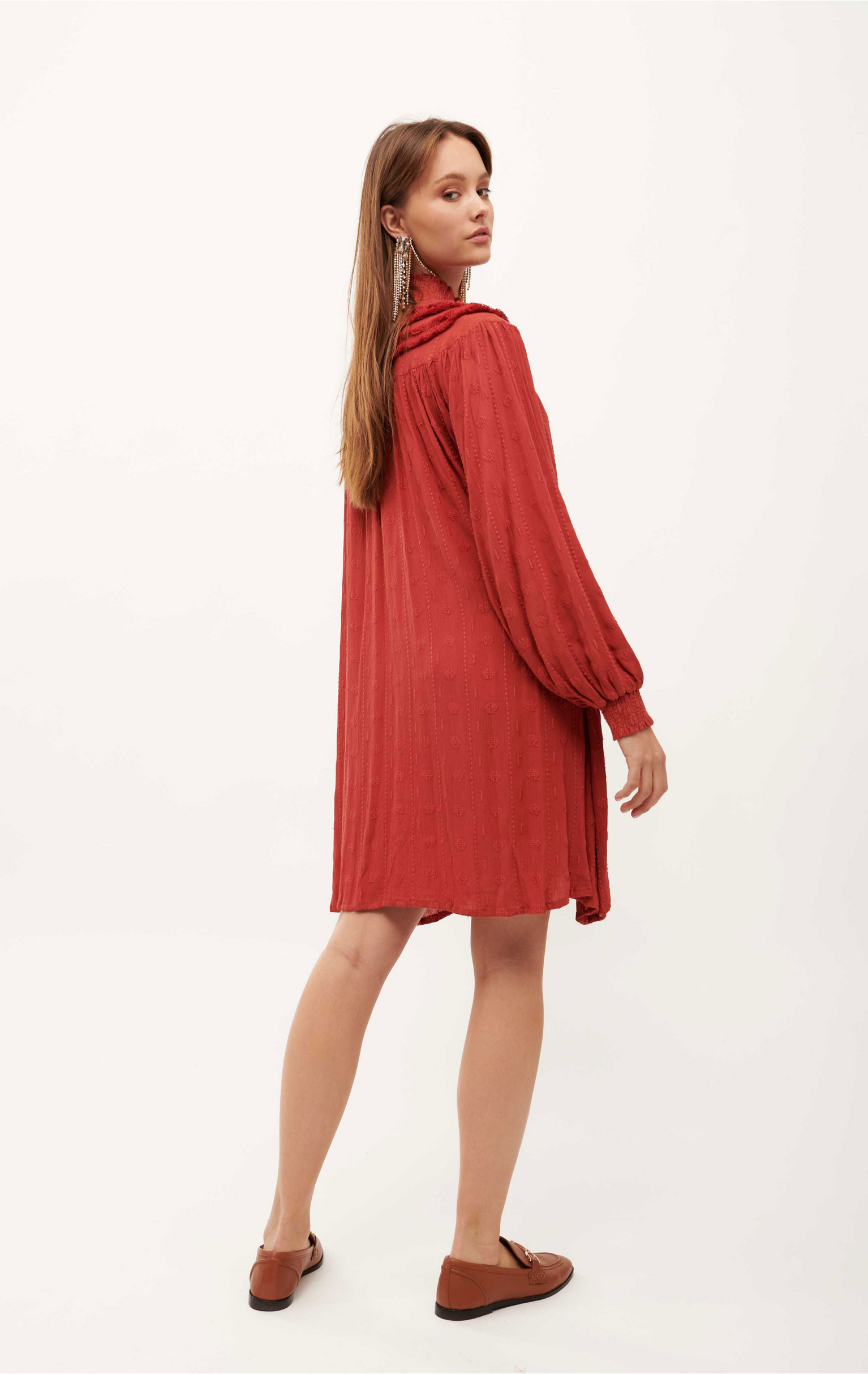 Robe courte babydoll en viscose brodée de couleur rouille bordeaux.