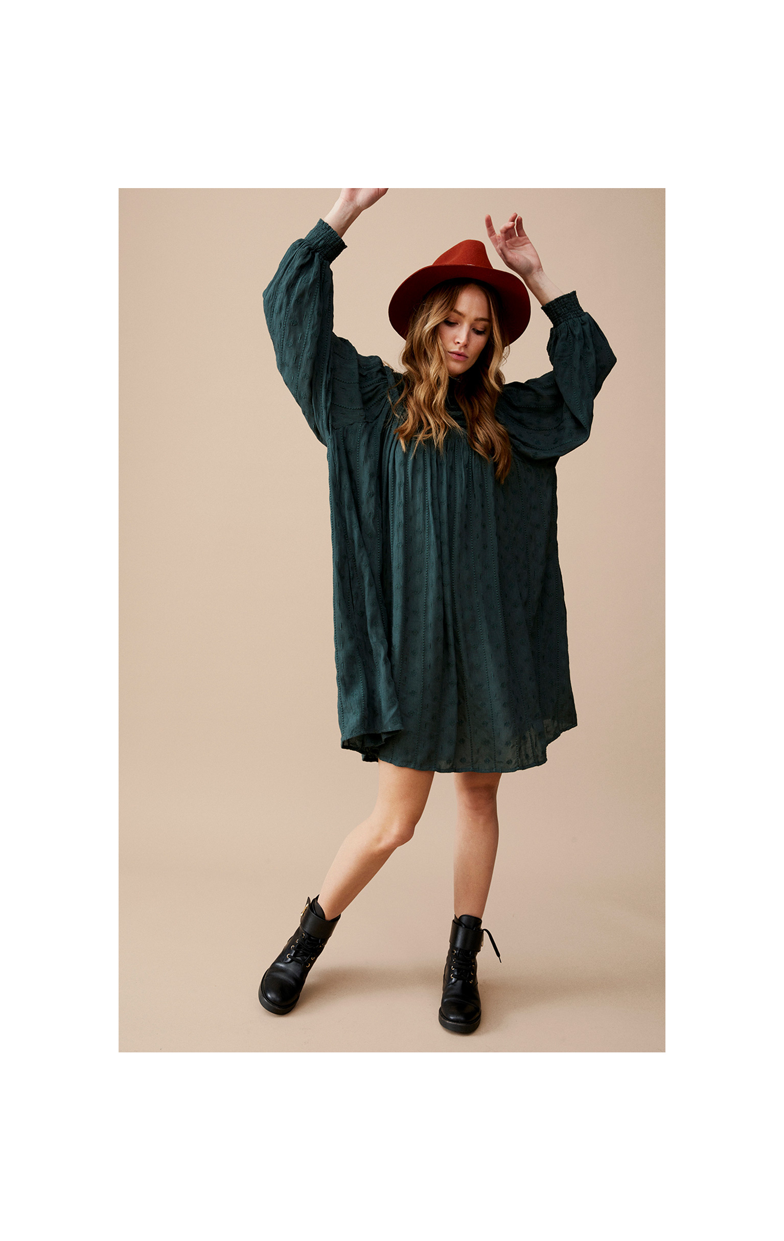Robe courte en viscose entièrement brodée de petits motifs point de croix. Son col victorien à smoke remonte légèrement sur le décolleté, et ses larges manches ballon se resserrent aux poignets. Sa coupe babydoll oversize et les poches sur les côtés lui donnent un look vintage far-west.