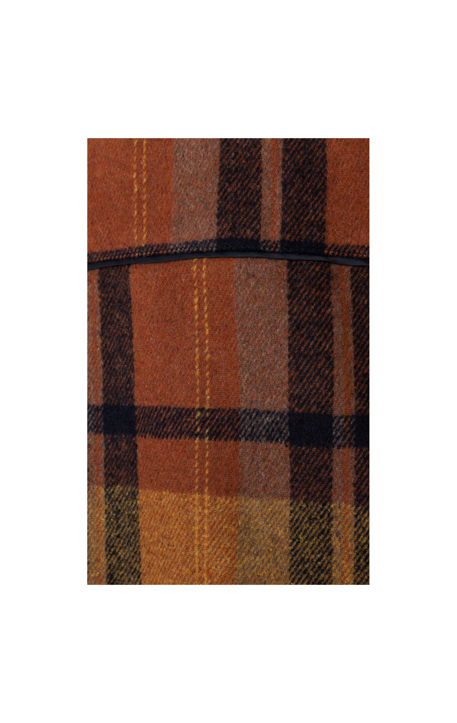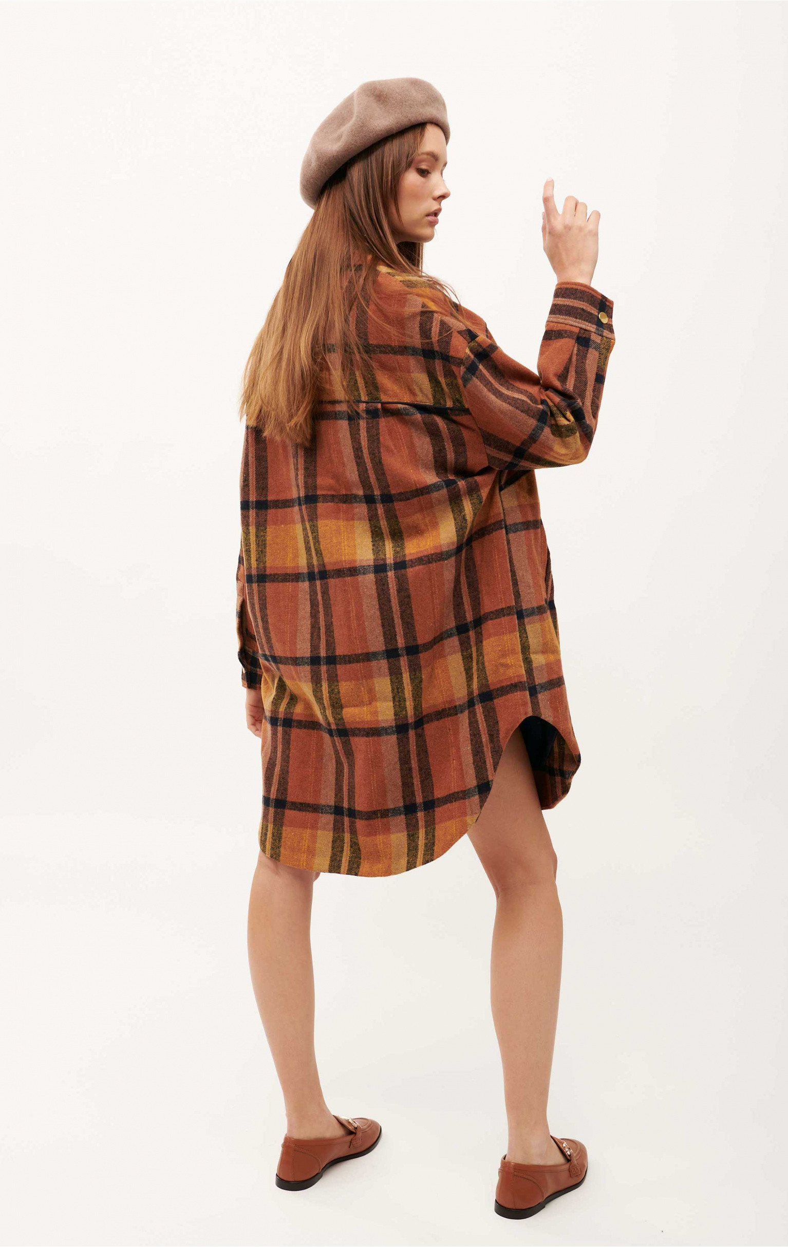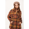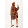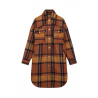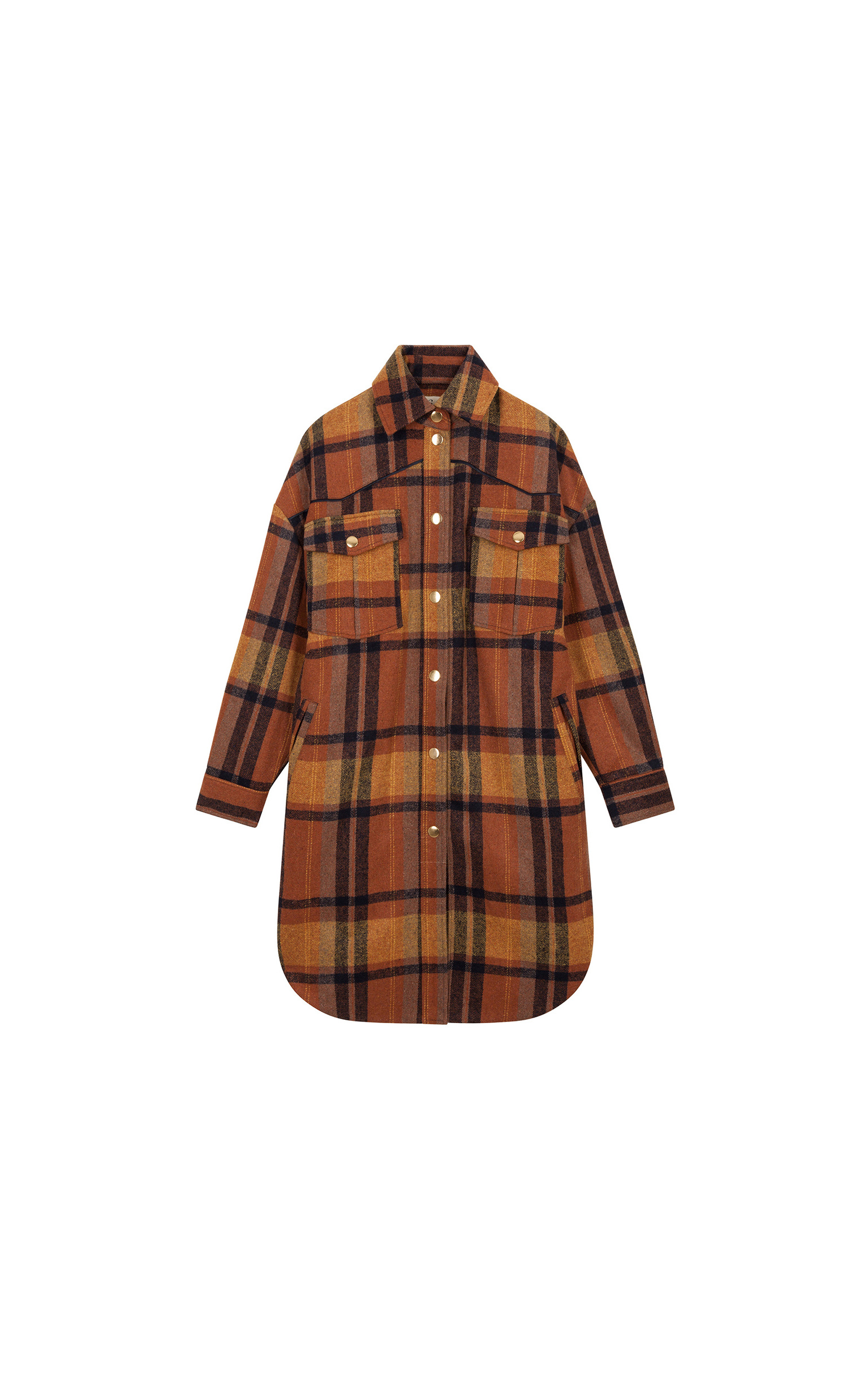 Manteau forme chemise en drap de laine décorée d'un tartan dans des tons hivernaux. Fermeture par boutons pression, et poches avant plaquées.
