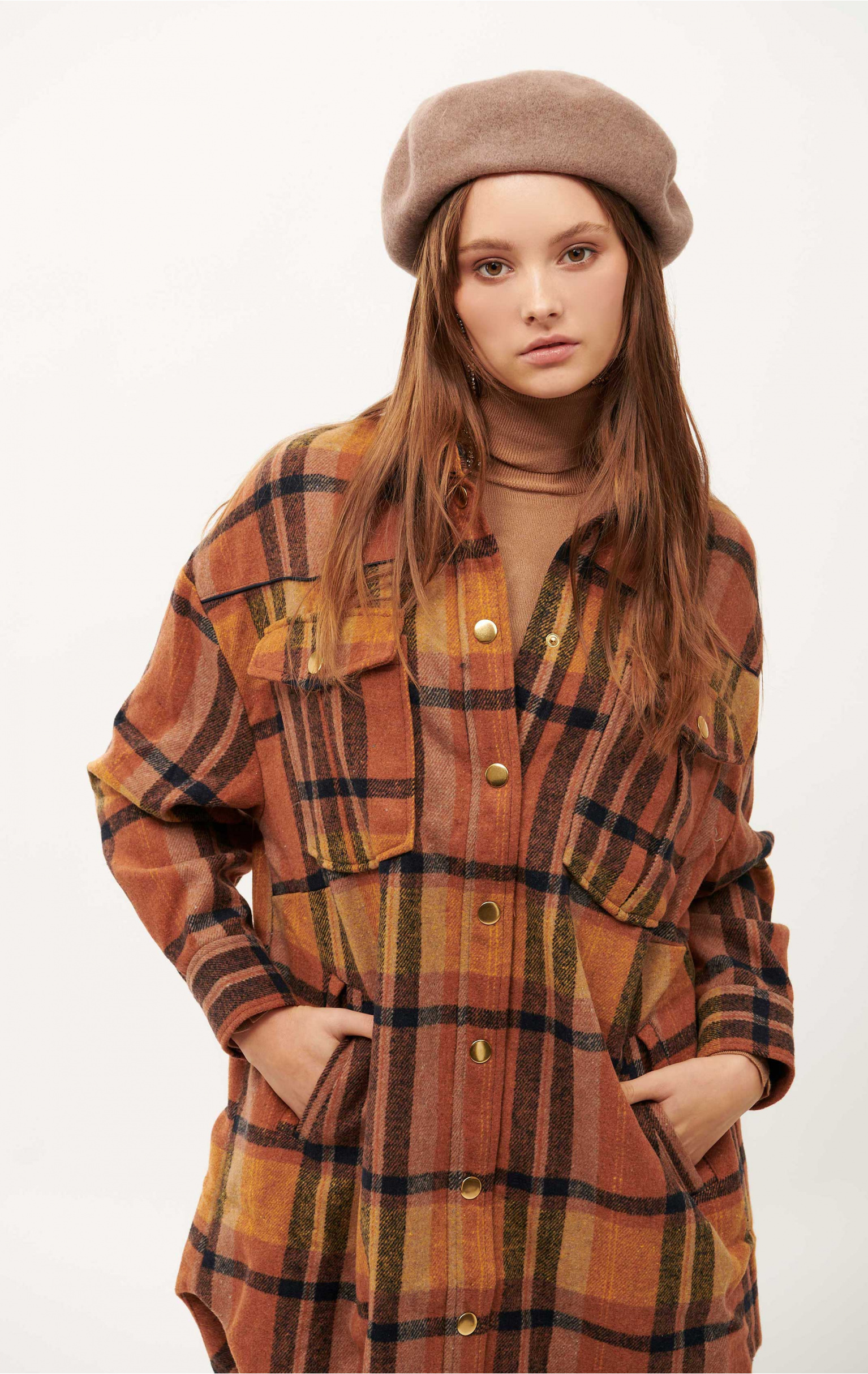 Manteau sur-chemise en drap de laine tartan camel, bleu marine et moutarde. Une pièce phare de cette saison pour un look cool chic. Cette veste dispose de poches plaquées sur le buste et se ferme par des boutons pression dorés.