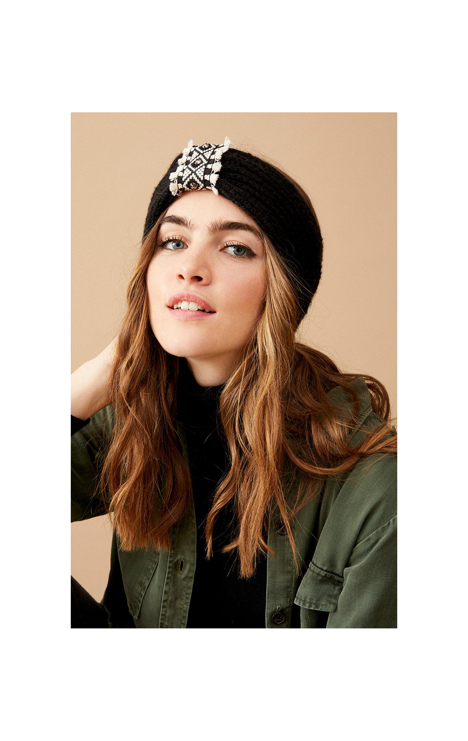 Bandeau en grosse maille noir avec ruban beige et noir sur le devant.