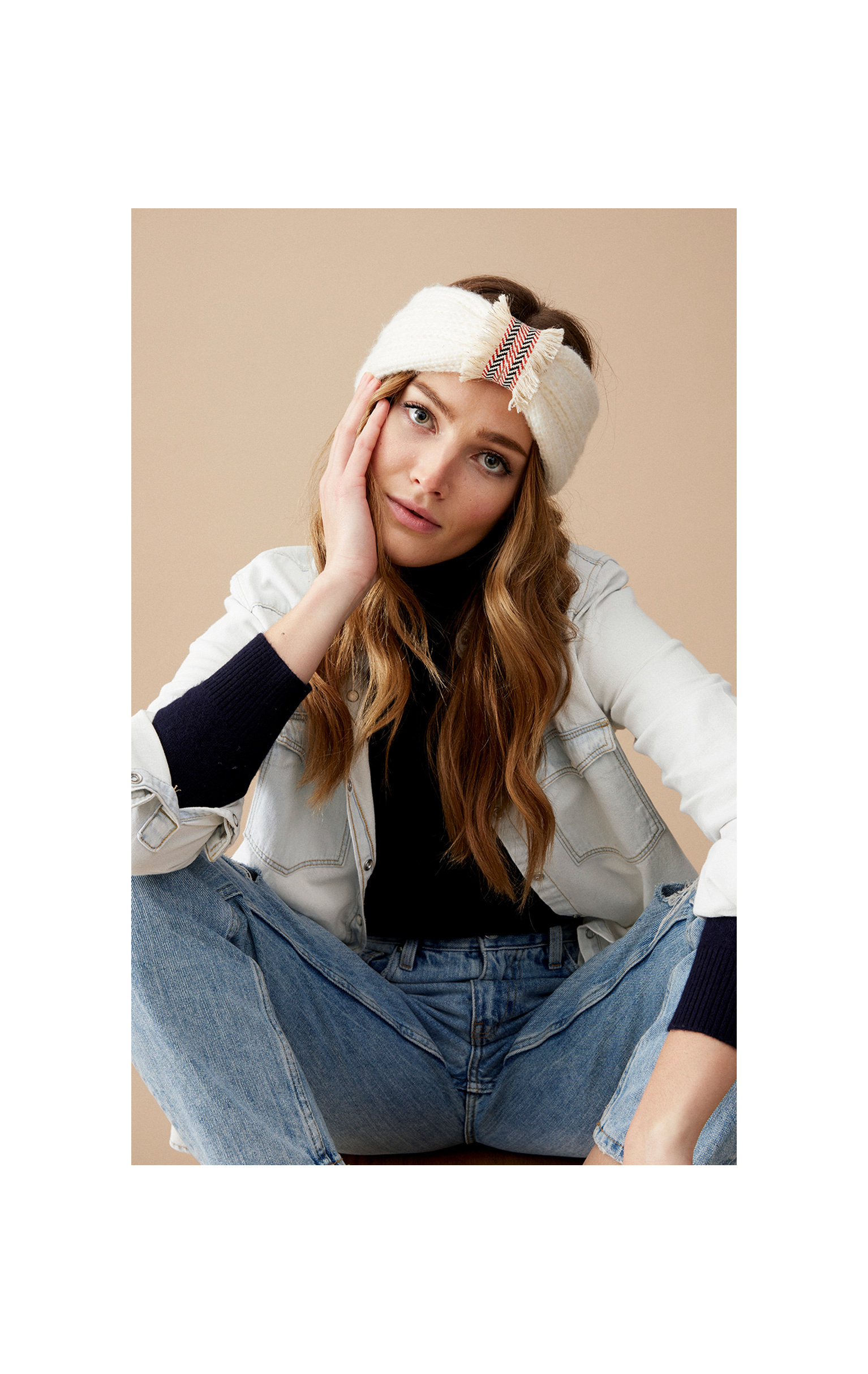 Headband en maille épaisse orné sur le devant par un ruban contrasté et décoré de petites franges.