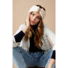 Bandeau en grosse maille blanc avec ruban sur le devant de couleur beige, noir et rouge, et fils lurex dorés.