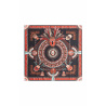 Mini-foulard représentant un cercle solaire entouré de masques africains grenat, chocolat, turquoise et rose sur fond noir.