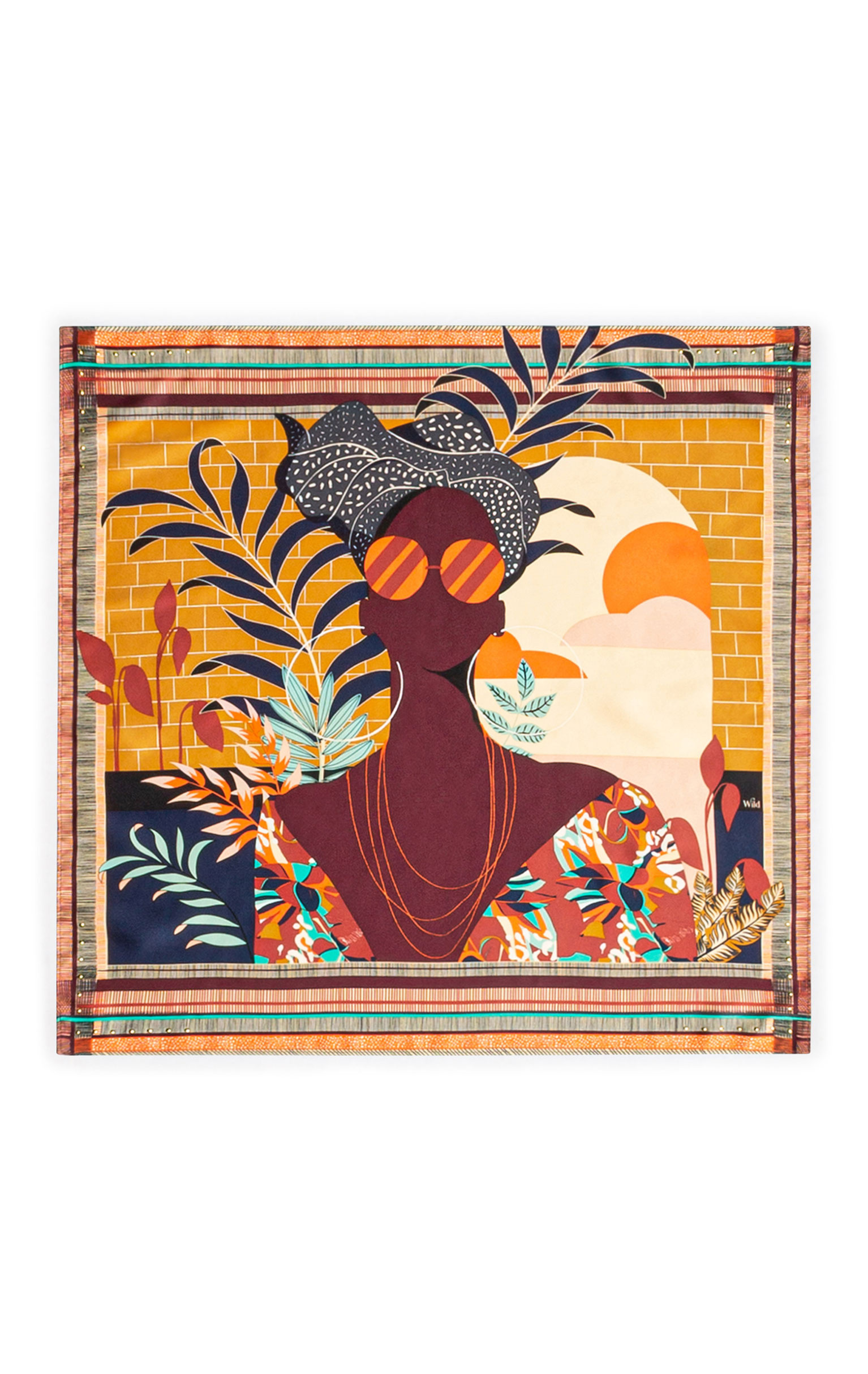 Nos mini-foulards arborent des dessins originaux destinés à embellir votre garde-robe. Ici est présenté le portrait de l'icone féminine sur fond de paysage antillais, elle porte le turban traditionnel, des lunettes de soleil et de grandes créoles. Peut se porter autour du cou, se nouer dans les cheveux ou bien autour de votre sac.