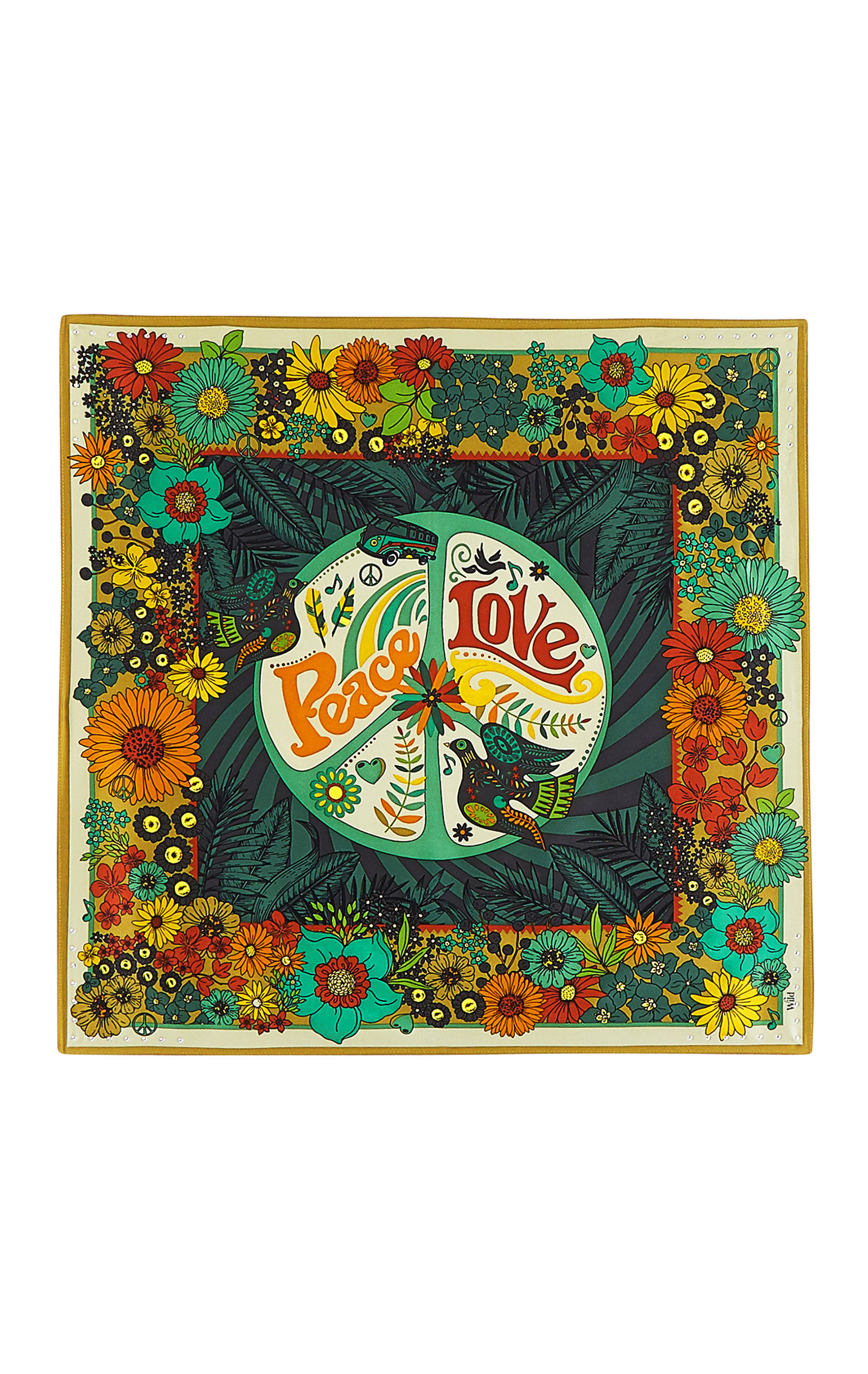 Nos foulards arborent des dessins originaux destinés à embellir votre garde-robe. Ici est présenté un imprimé à l'esprit résolument seventies rappelant les illustrations psychédéliques des années 70. Le print est encadré de fleurs multicolores au look hippie, Flower Power !