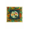 Petit foulard en matière recyclée, à l'esprit résolument seventies dans les tons kaki, vert, ocre et brique, rappelant les illustrations psychédéliques des années 70.