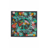 Petit foulard en matière recyclée, à l'esprit résolument seventies dans les tons noir, vert amande, orange, brique et rose, rappelant les illustrations psychédéliques des années 70.