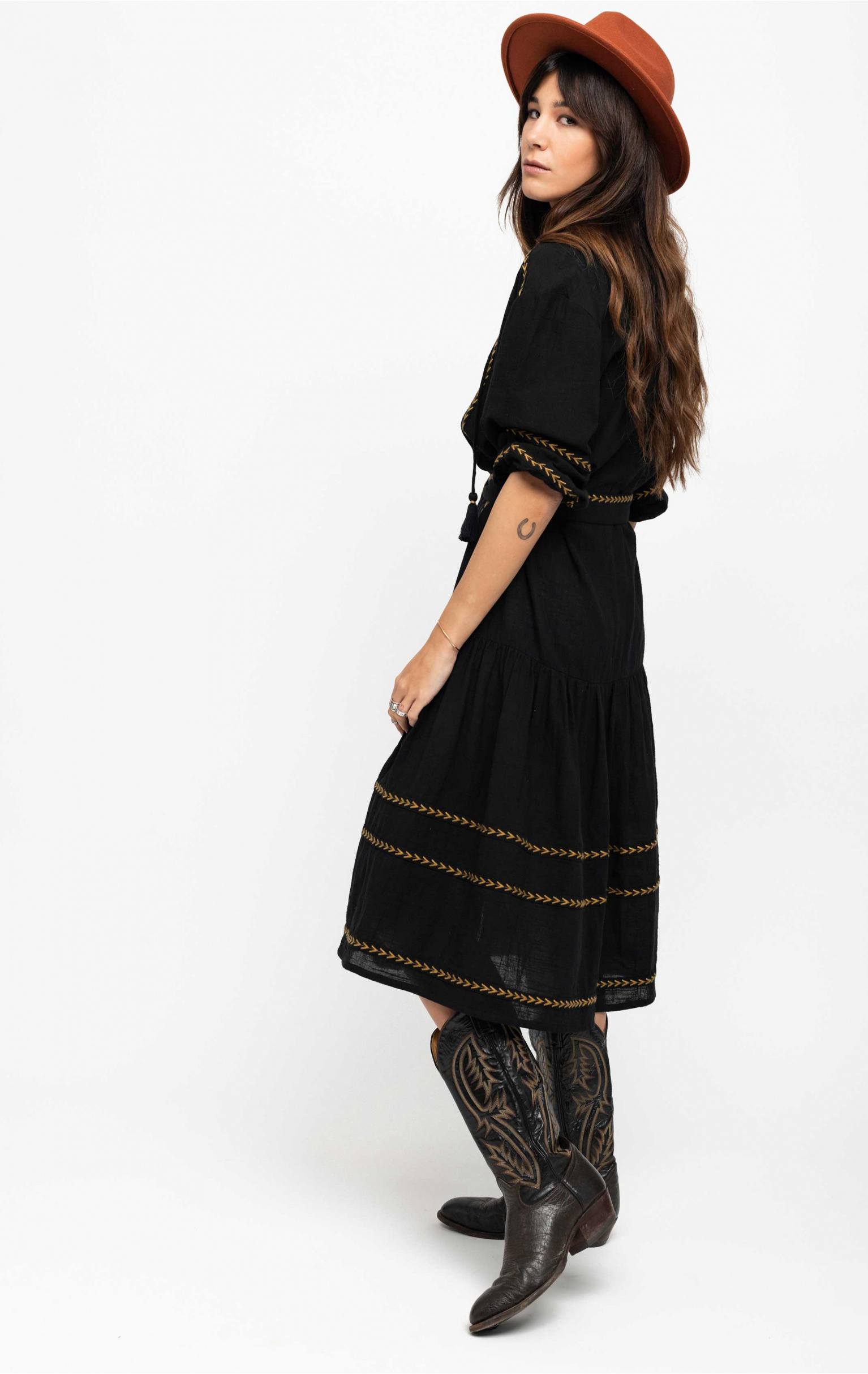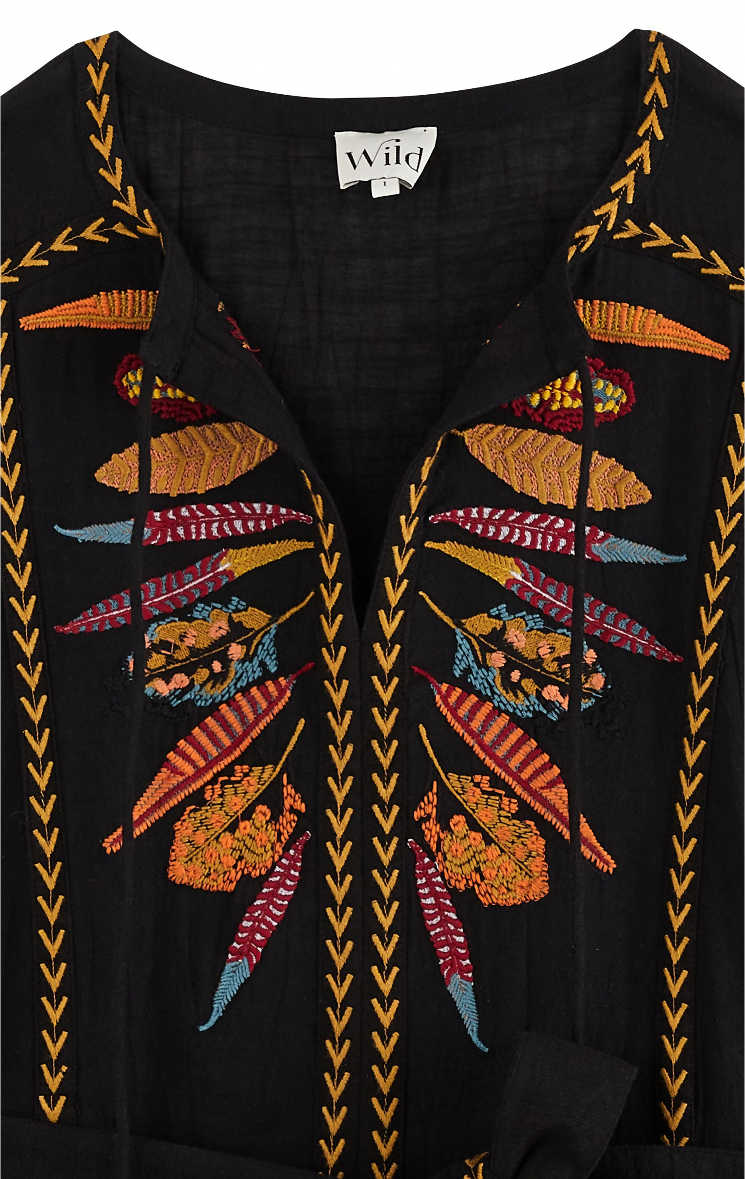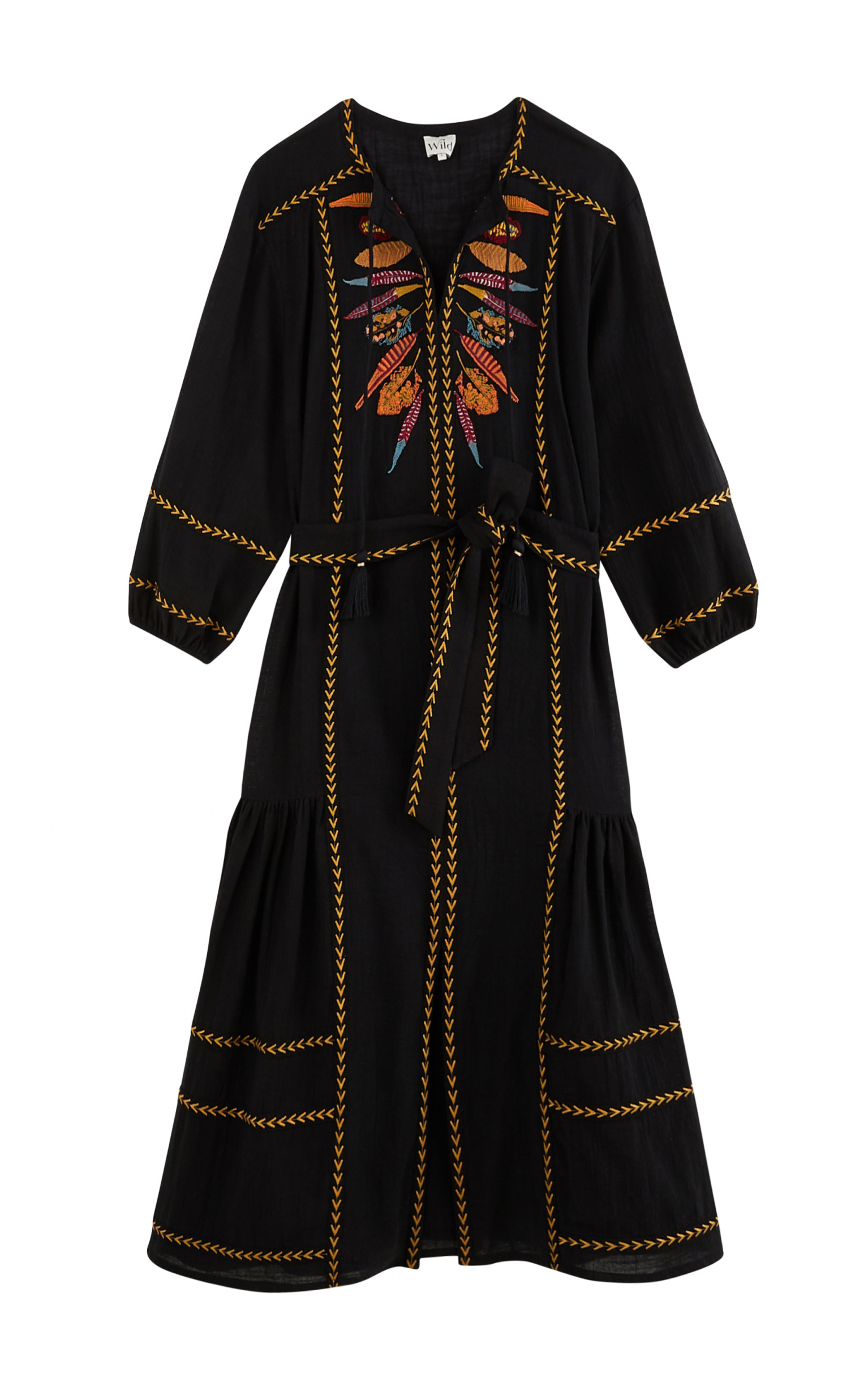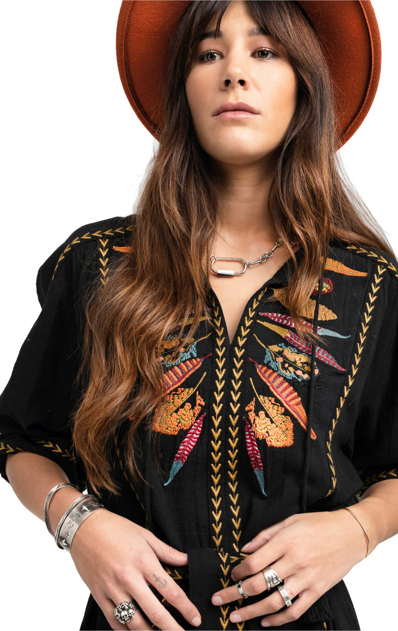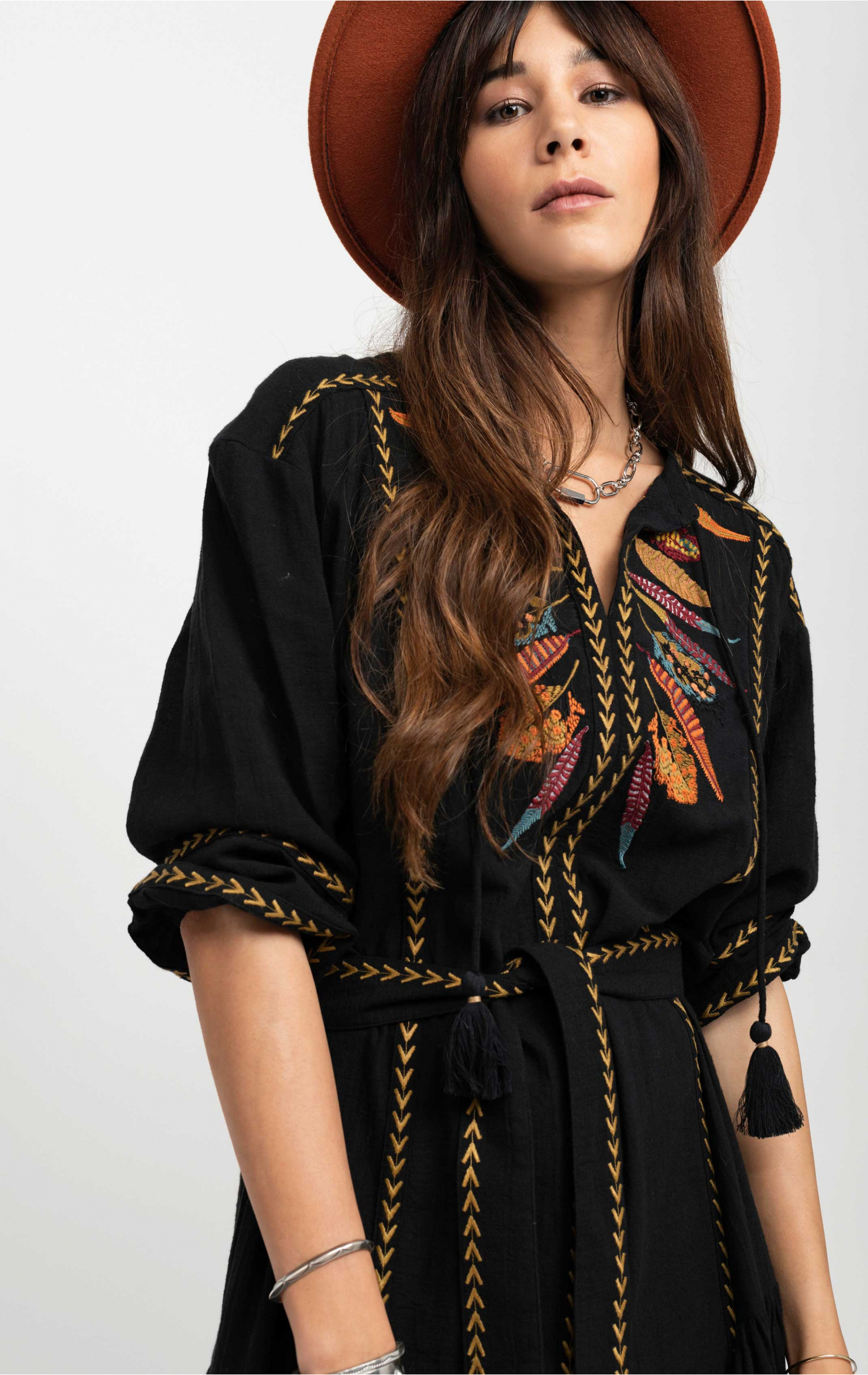 On adore les broderies plumes dans les tons vert olive, corail, rouge bordeaux, jaune ocre et bleu turquoise qui ornent le décolleté et qui contrastent avec sa couleur noire. La forme ample de cette robe longue peut aussi bien se ceintrer à la taille par notre ceinture brodée mais aussi se porter loose pour un look encore plus ethnique chic.