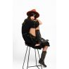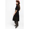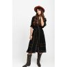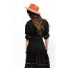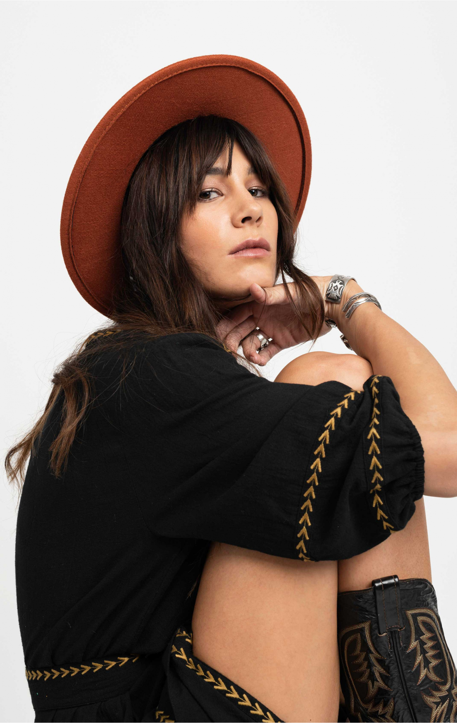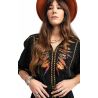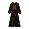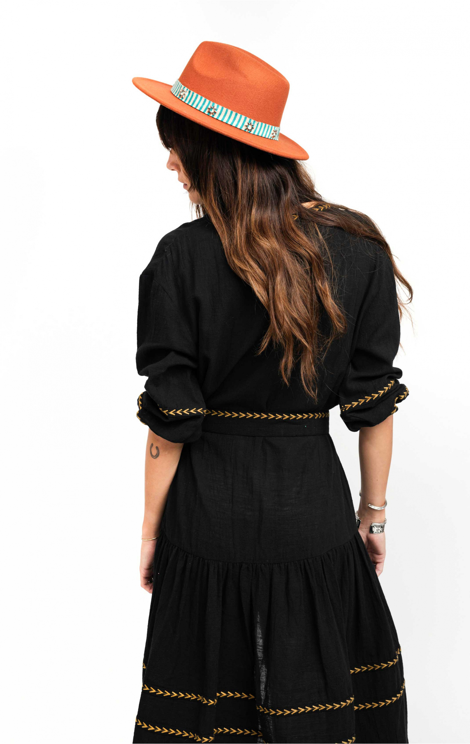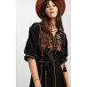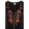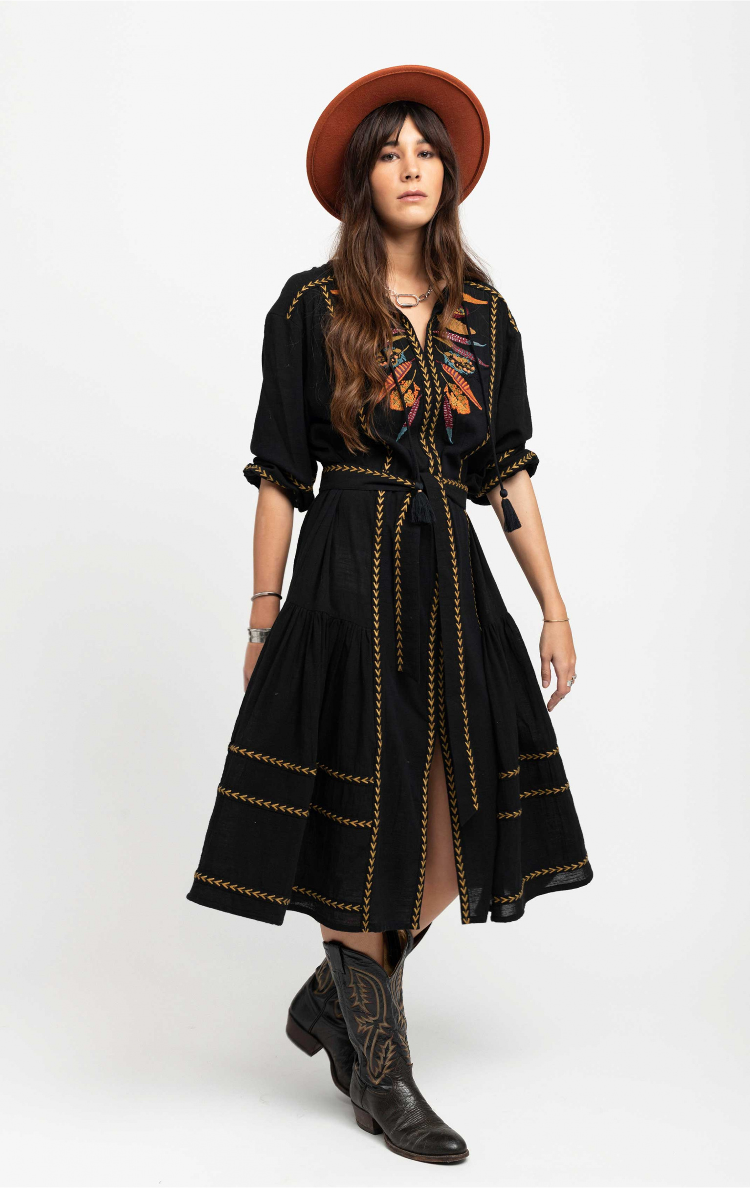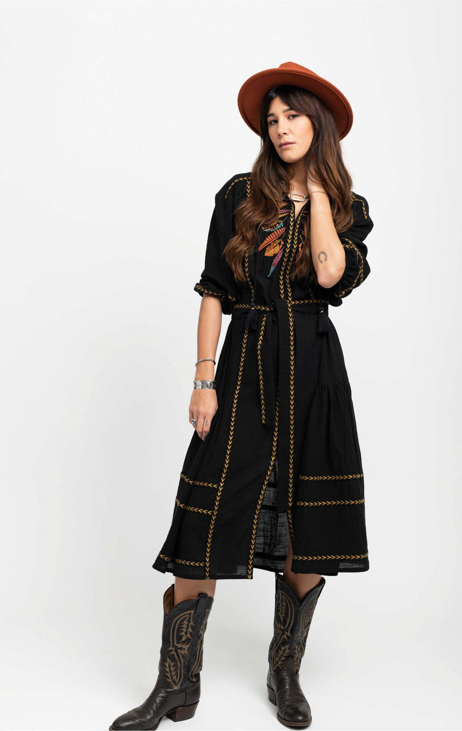 On adore les broderies plumes dans les tons vert olive, corail, rouge bordeaux, jaune ocre et bleu turquoise qui ornent le décolleté et qui contrastent avec sa couleur noire. La forme ample de cette robe longue peut aussi bien se ceintrer à la taille par notre ceinture brodée mais aussi se porter loose pour un look encore plus ethnique chic.