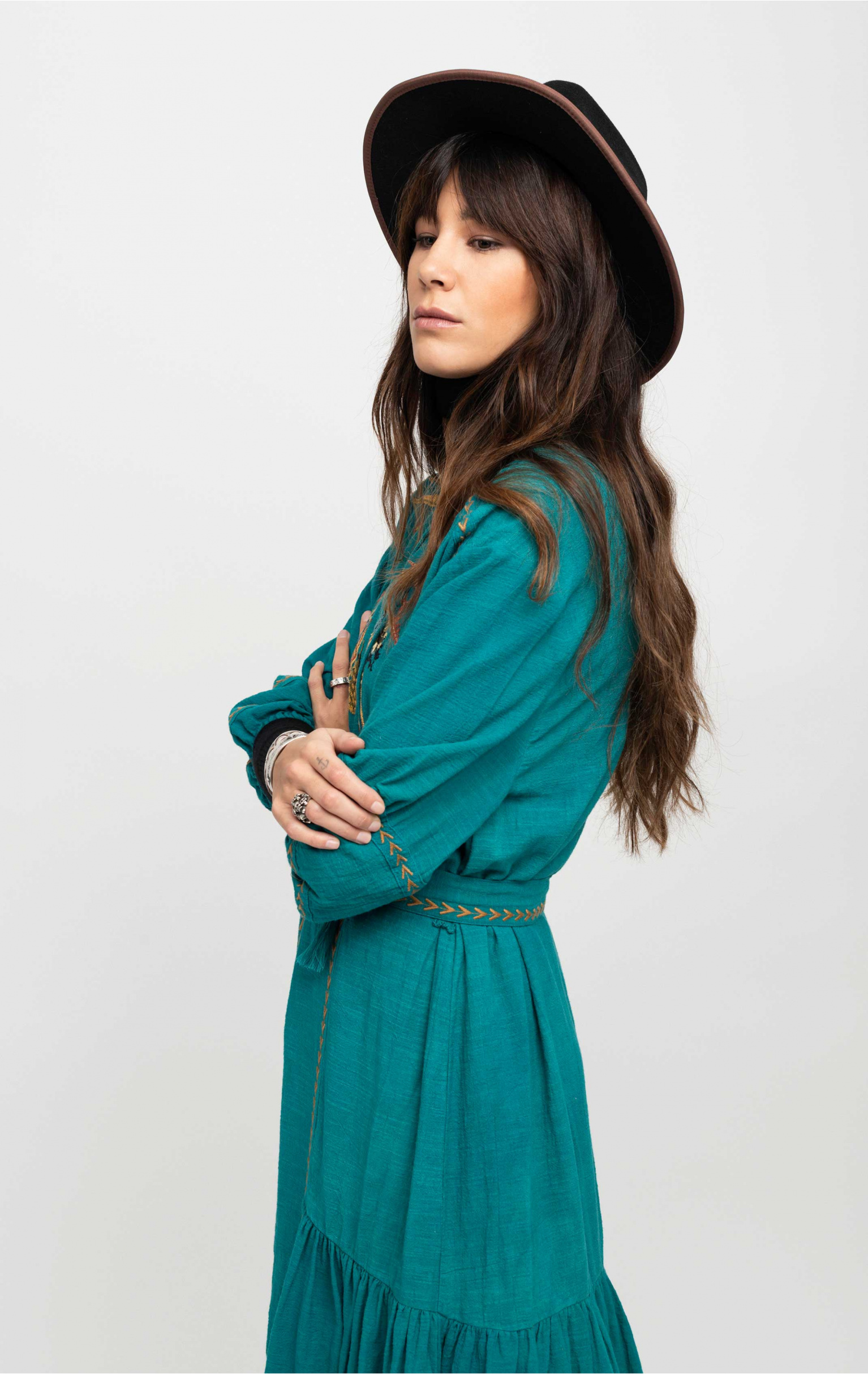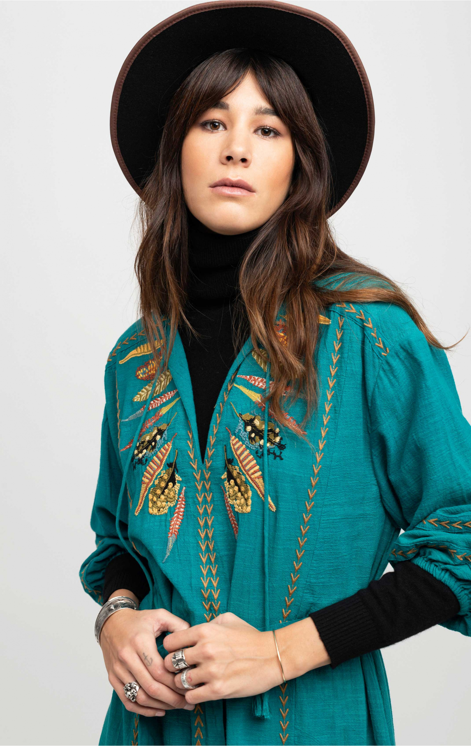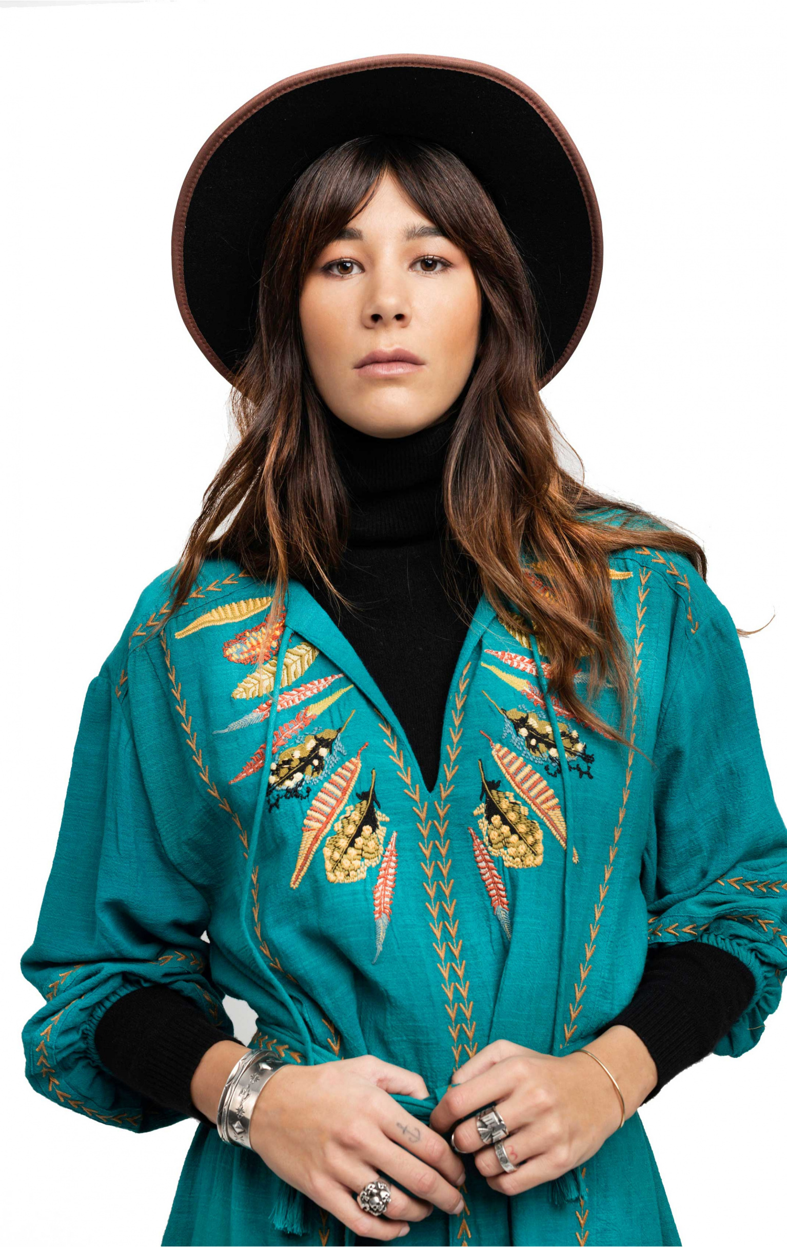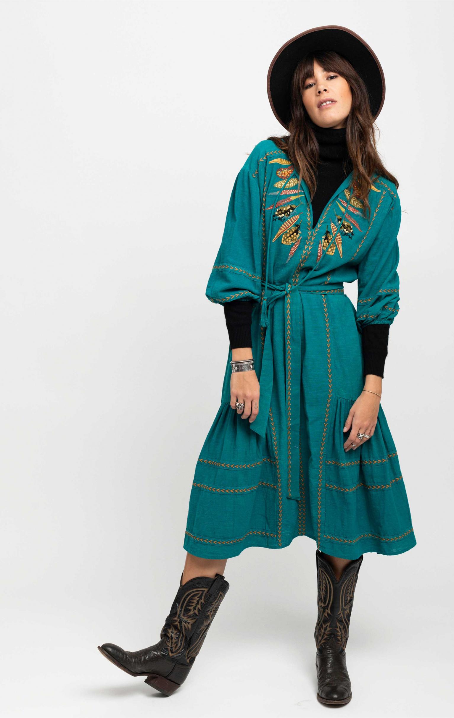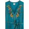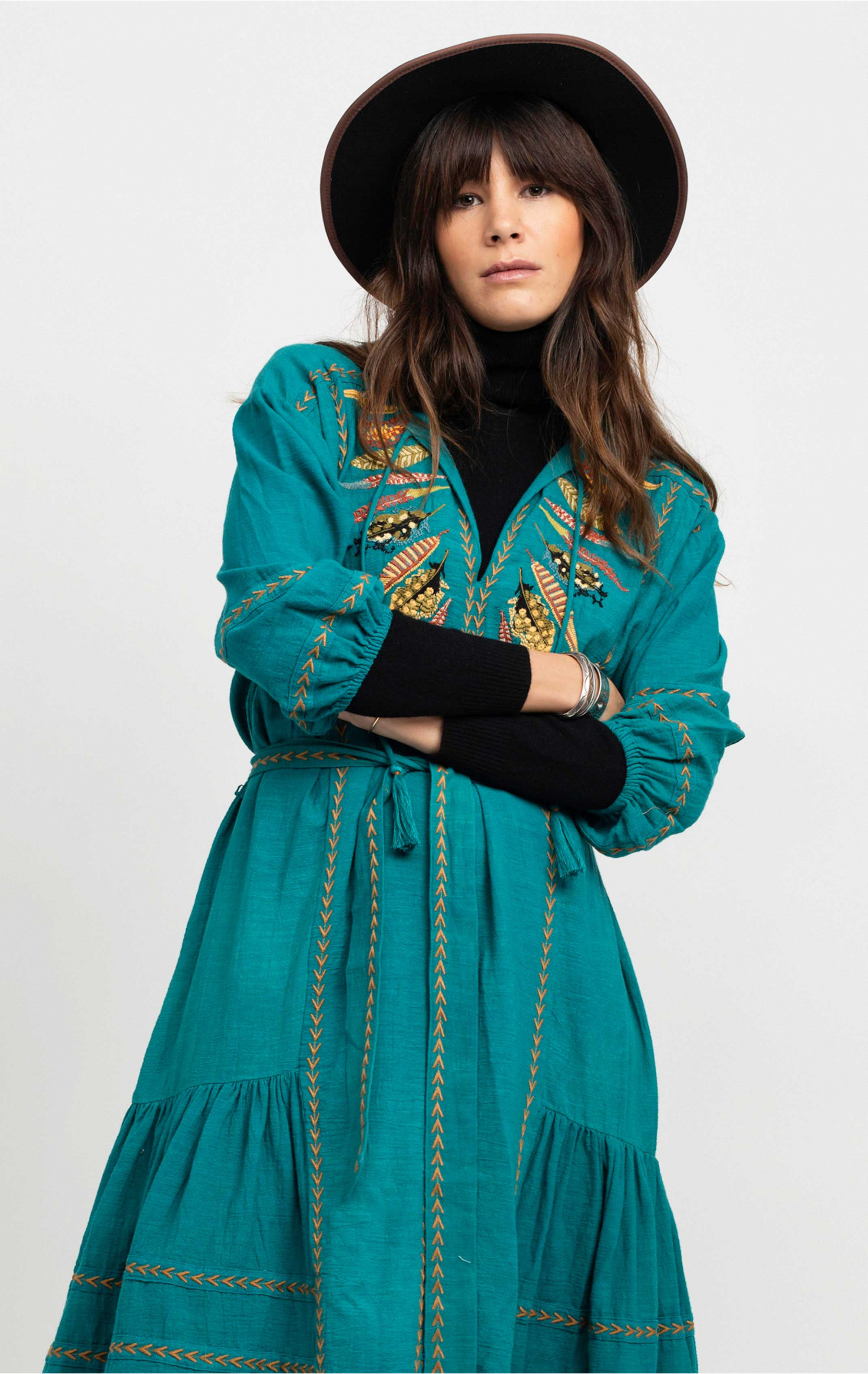 On adore les broderies plumes dans les tons vert olive, caramel, noir et bleu jean qui ornent le décolleté et qui contrastent avec sa couleur vert émeraude. La forme ample de cette robe longue peut aussi bien se ceintrer à la taille par notre ceinture brodée mais aussi se porter loose pour un look encore plus ethnique chic.