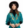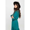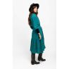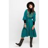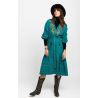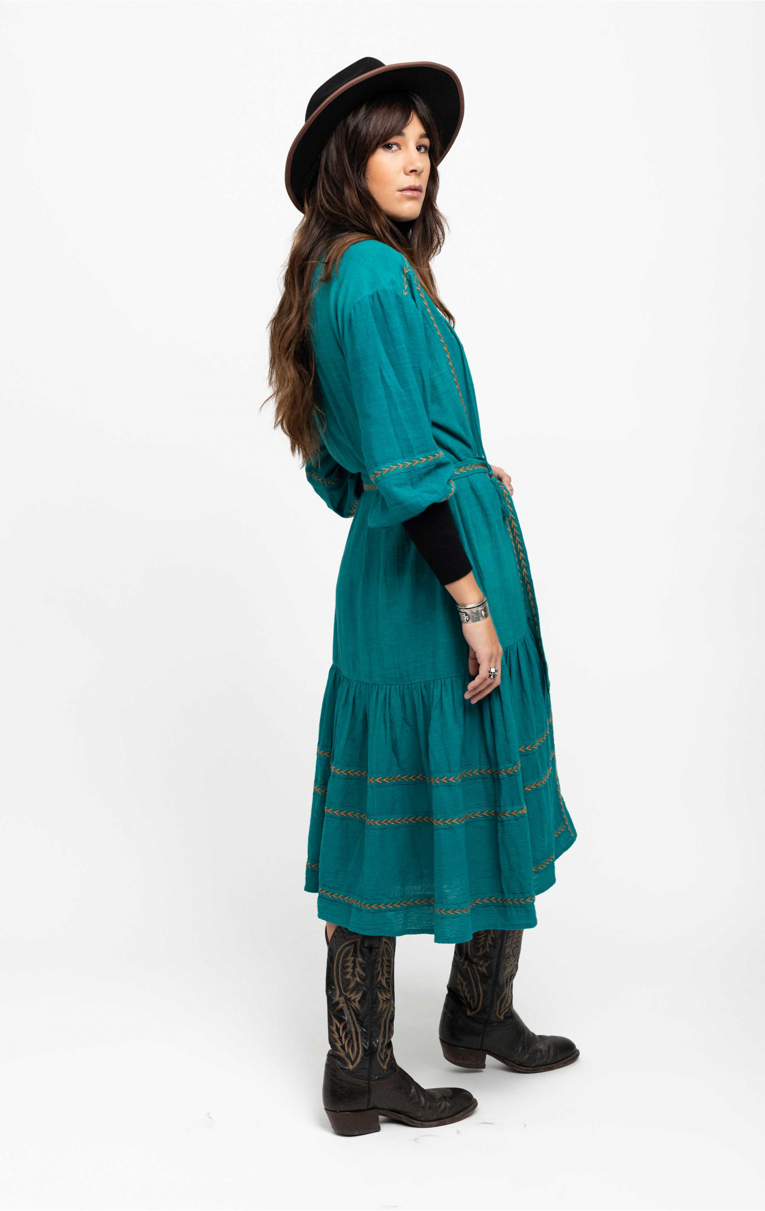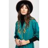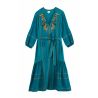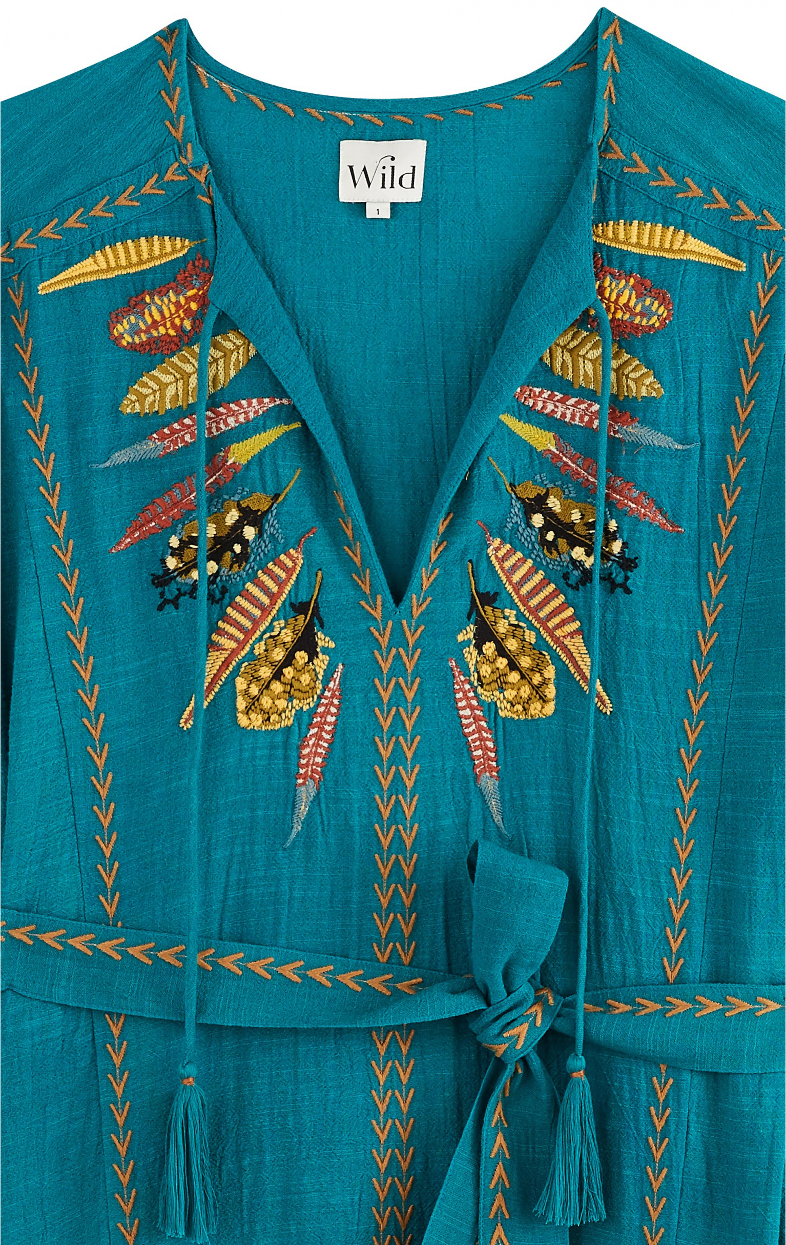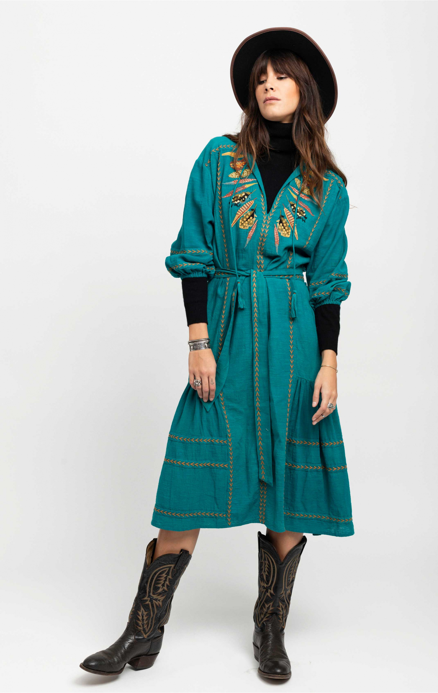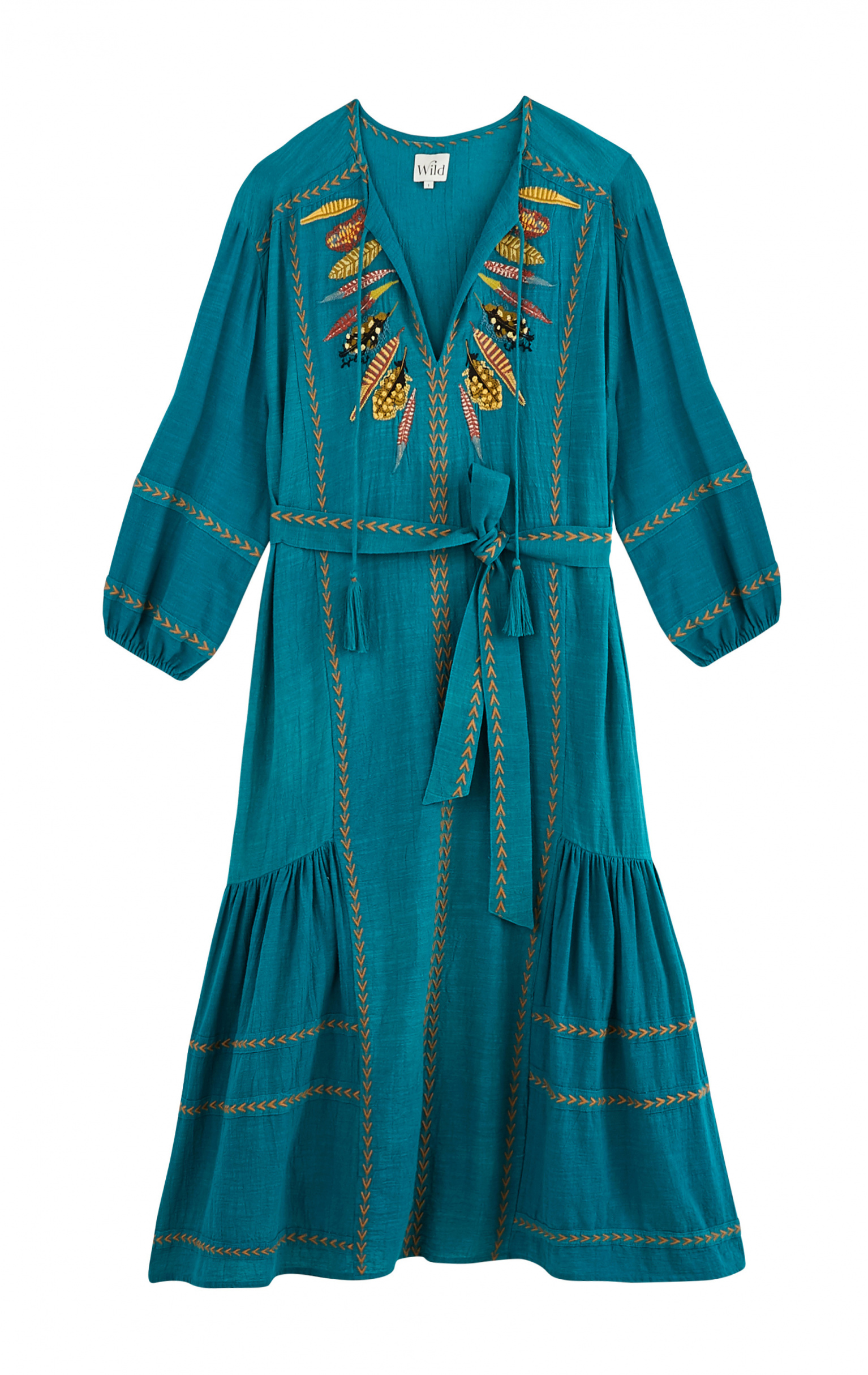 On adore les broderies plumes dans les tons vert olive, caramel, noir et bleu jean qui ornent le décolleté et qui contrastent avec sa couleur vert émeraude. La forme ample de cette robe longue peut aussi bien se ceintrer à la taille par notre ceinture brodée mais aussi se porter loose pour un look encore plus ethnique chic.