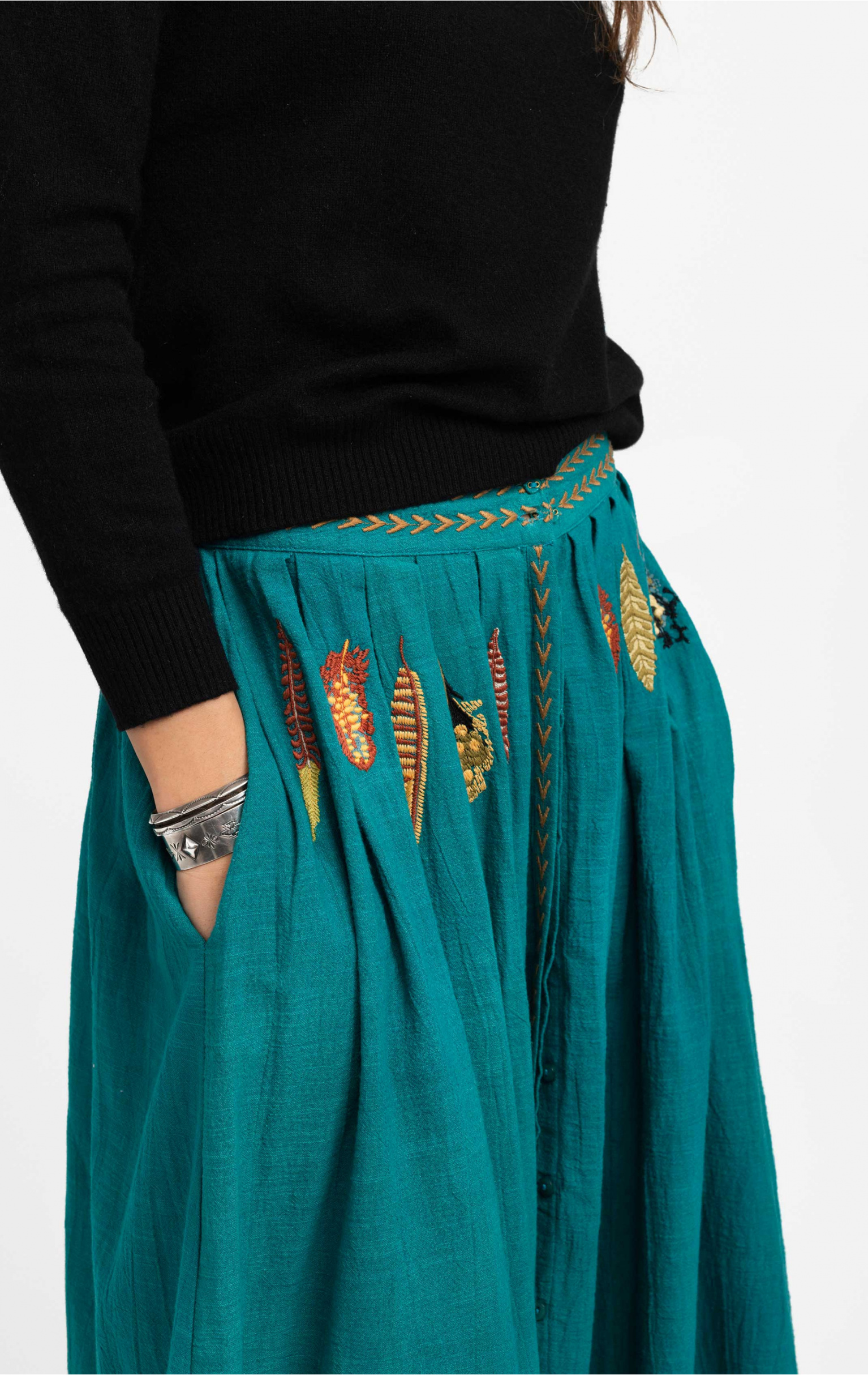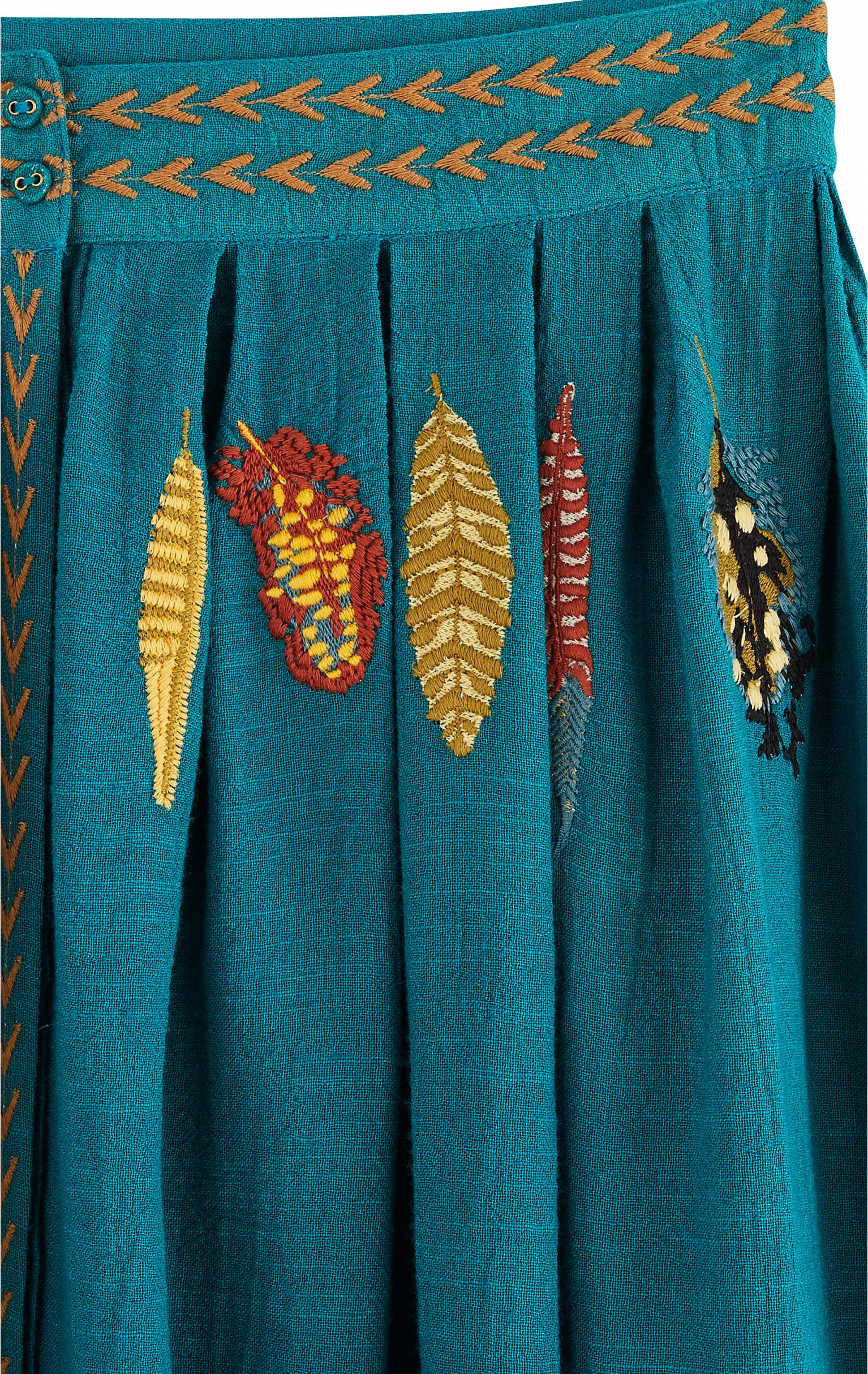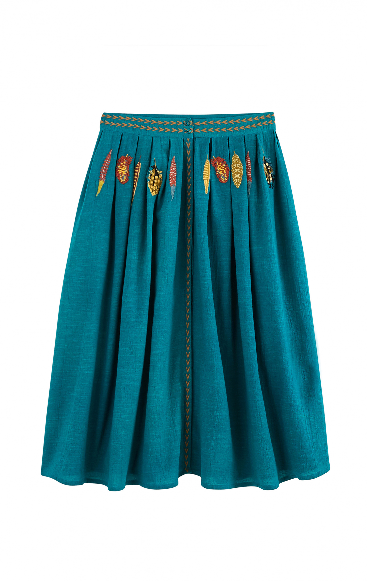 Elle est entièrement brodée à la taille et sur la patte de boutonnage de motifs ethniques chics, et vous craquerez pour les broderies en formes de plumes dans les tons vert olive, caramel, noir et bleu jean, qui ornent la taille. Elle s'ouvre sur le côté par un zip caché pour plus de confort et est munie de deux poches latérales. Une pièce à l'esprit vintage pour look "dégaine" assuré!
