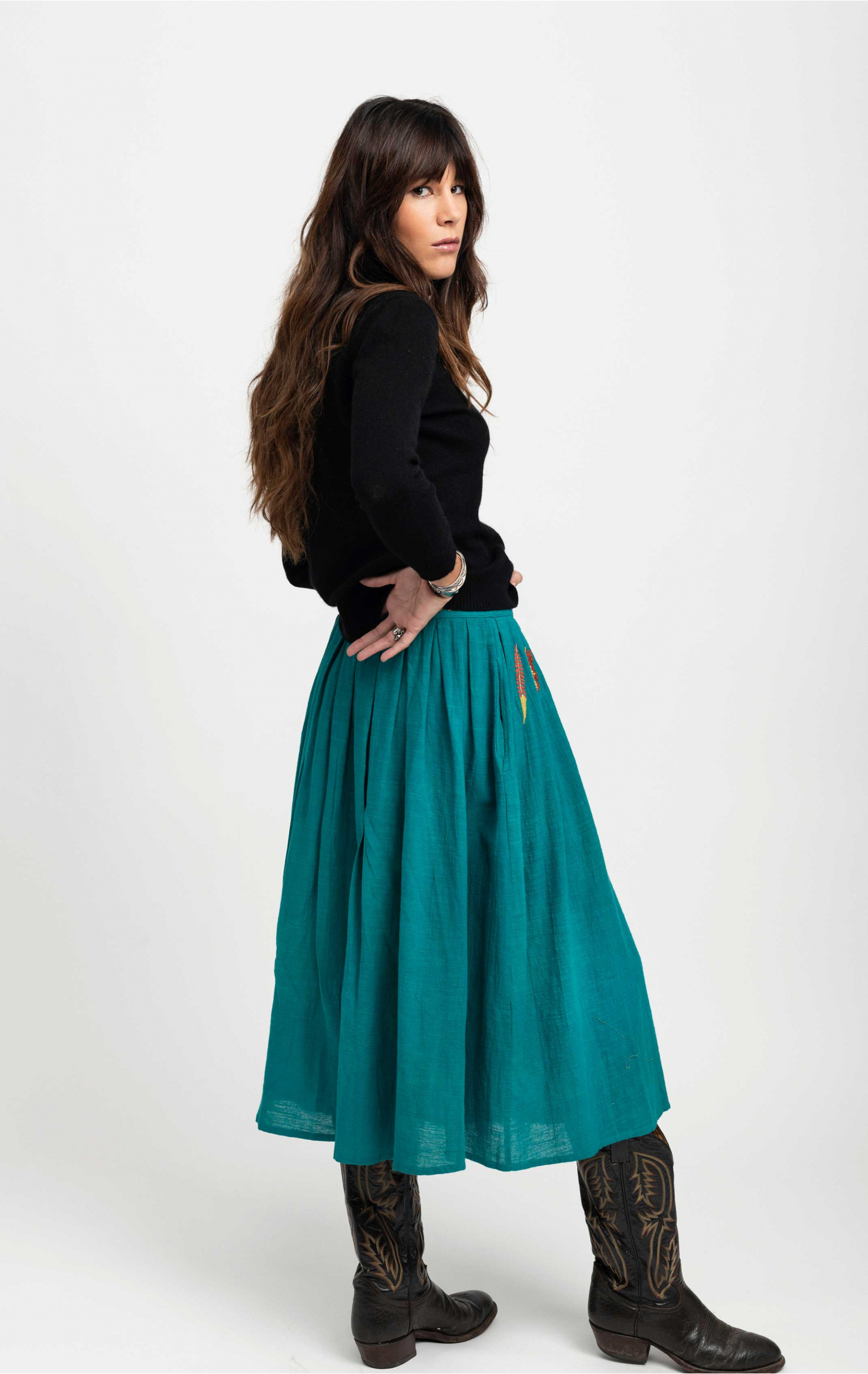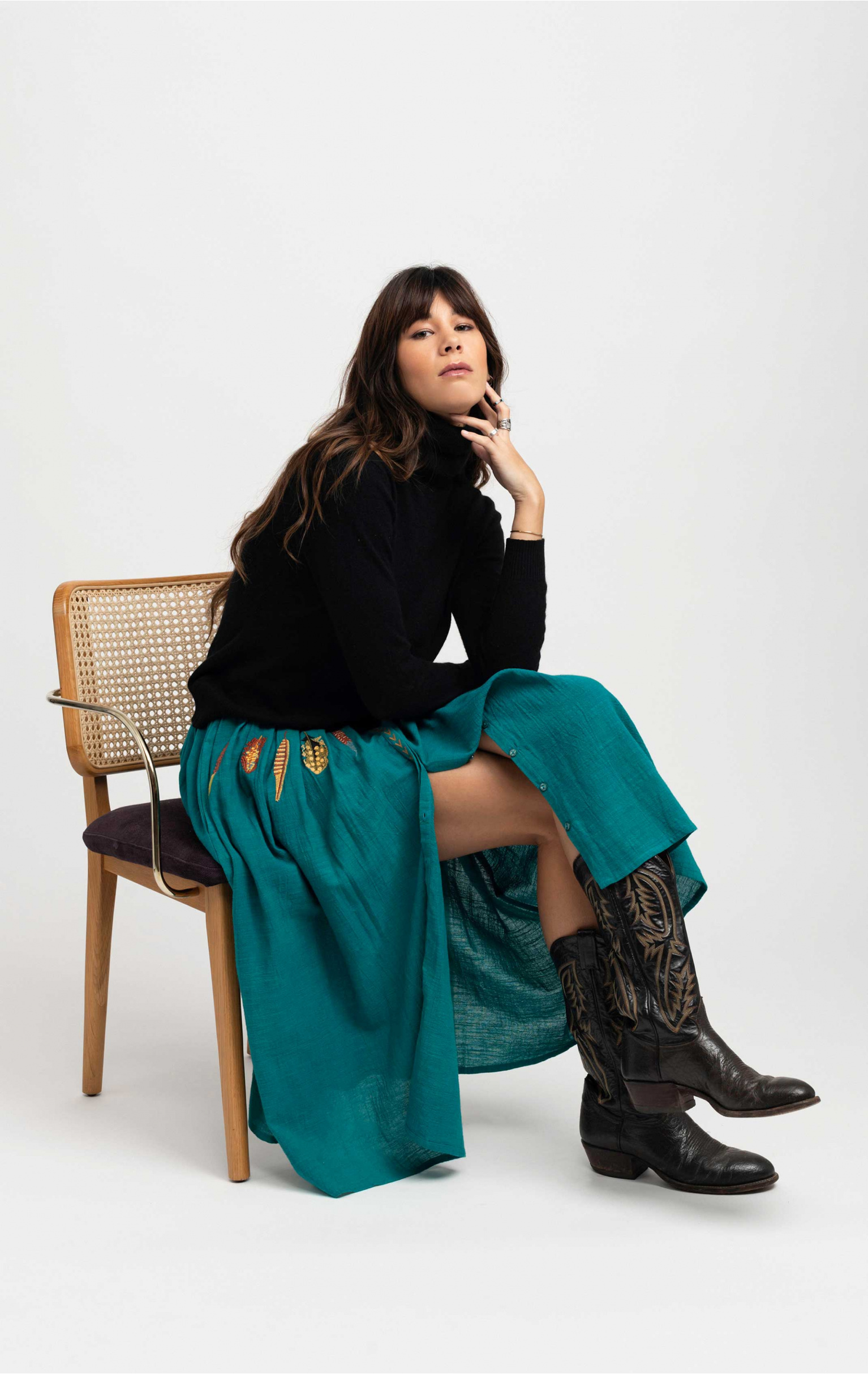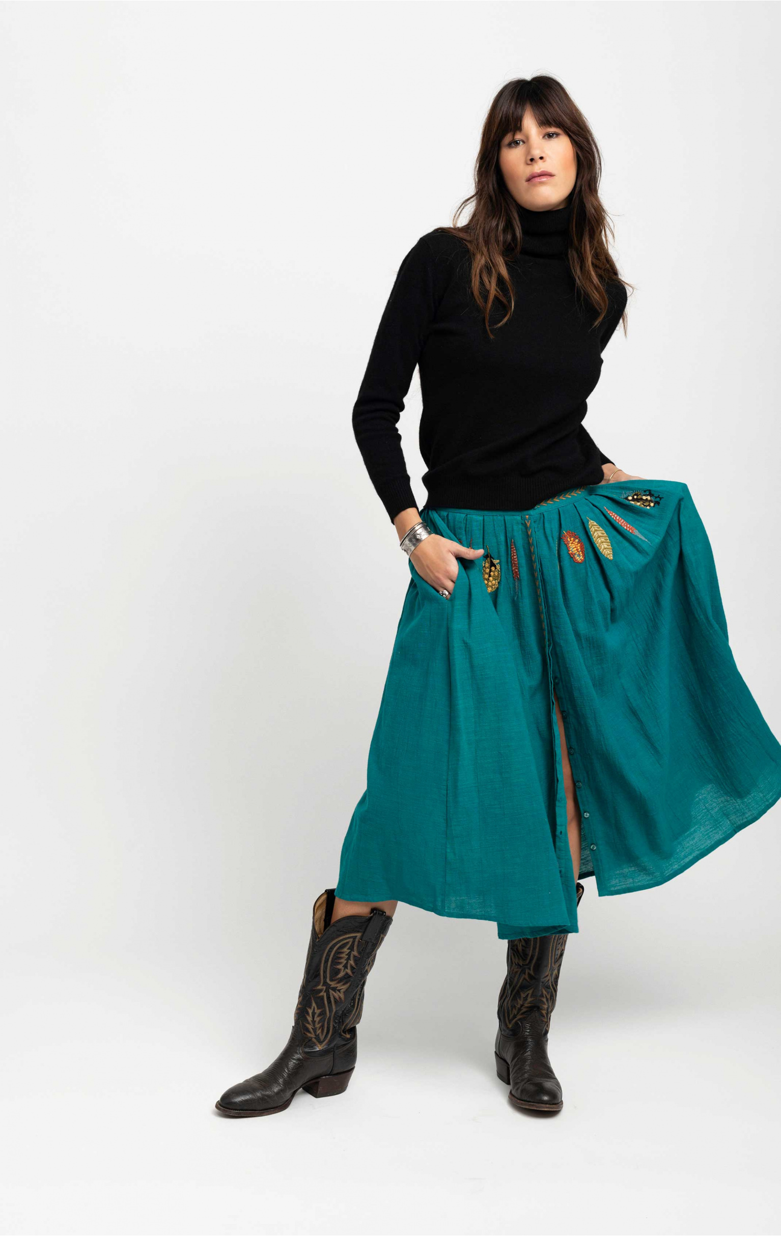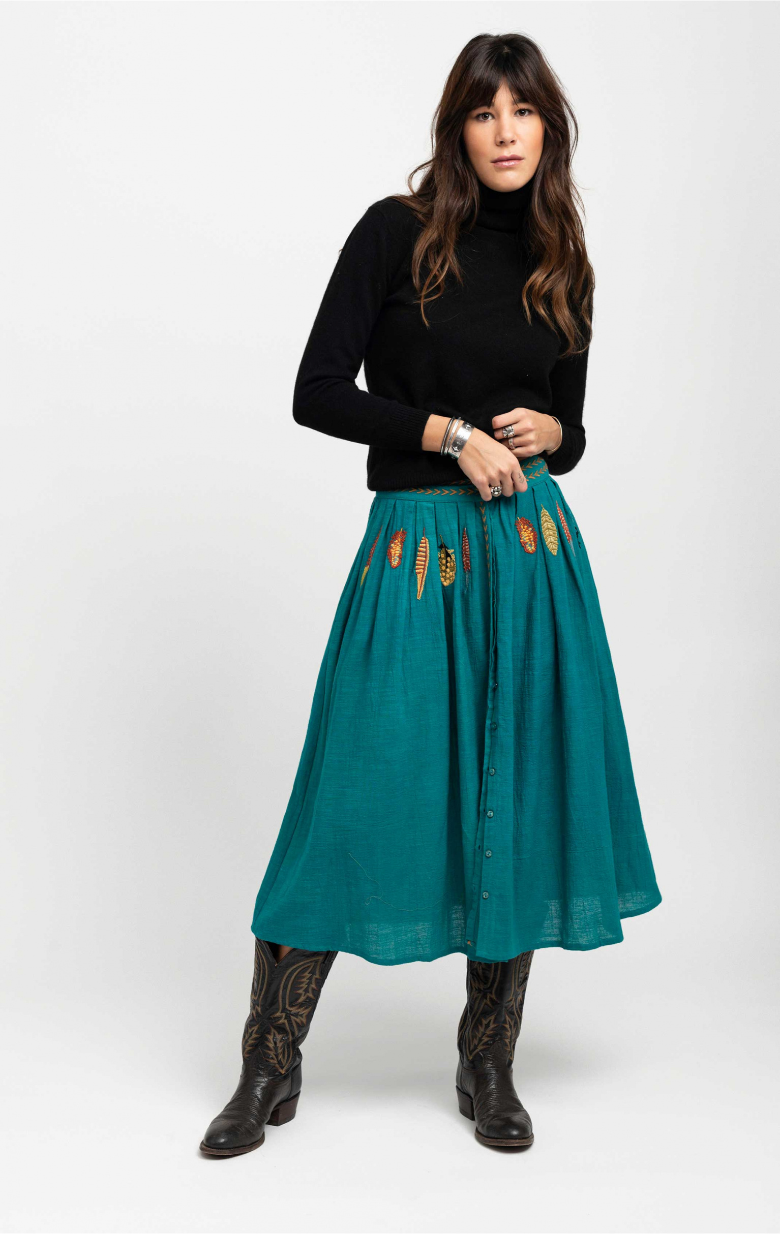 Elle est entièrement brodée à la taille et sur la patte de boutonnage de motifs ethniques chics, et vous craquerez pour les broderies en formes de plumes dans les tons vert olive, caramel, noir et bleu jean, qui ornent la taille. Elle s'ouvre sur le côté par un zip caché pour plus de confort et est munie de deux poches latérales. Une pièce à l'esprit vintage pour look "dégaine" assuré!