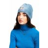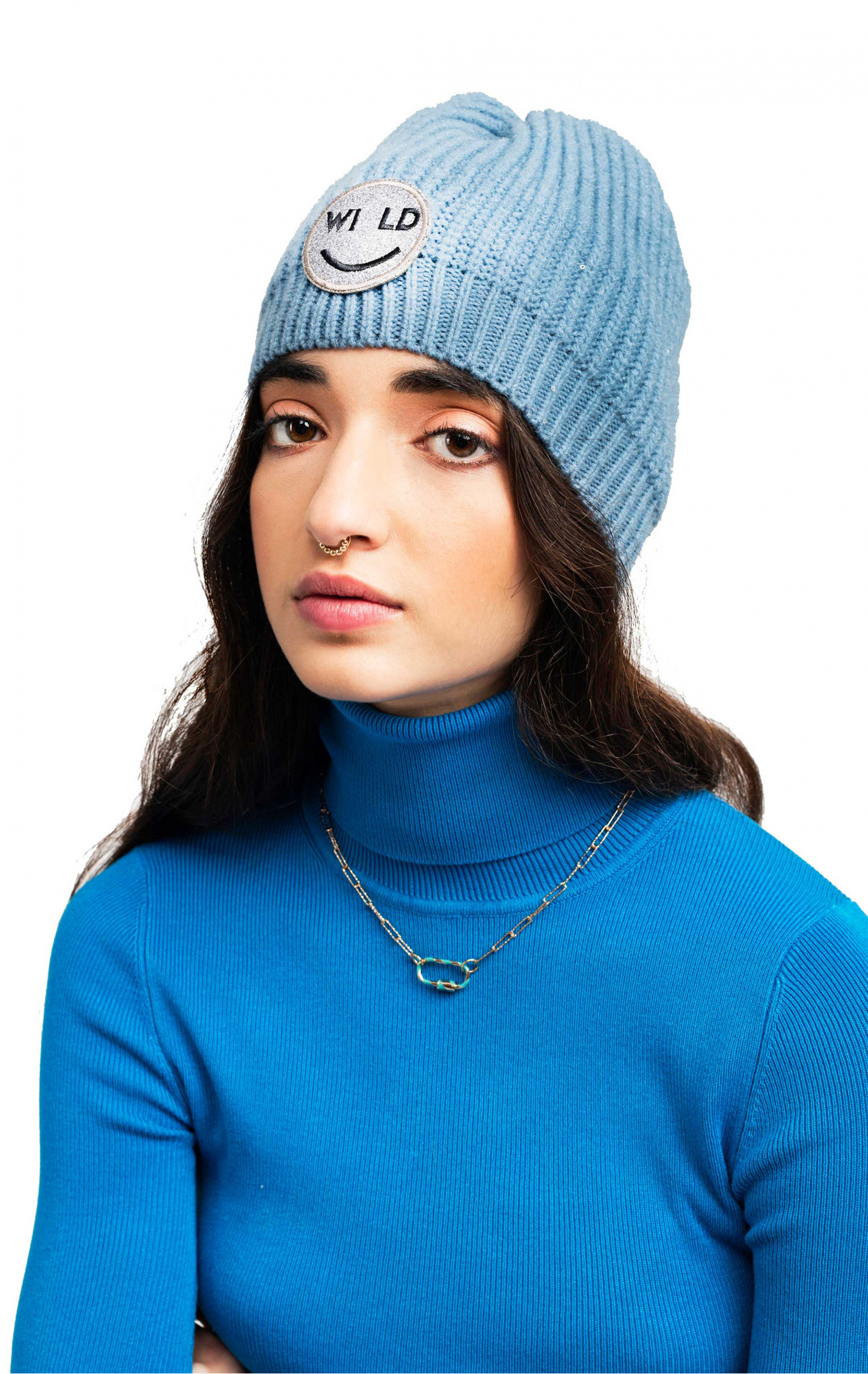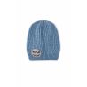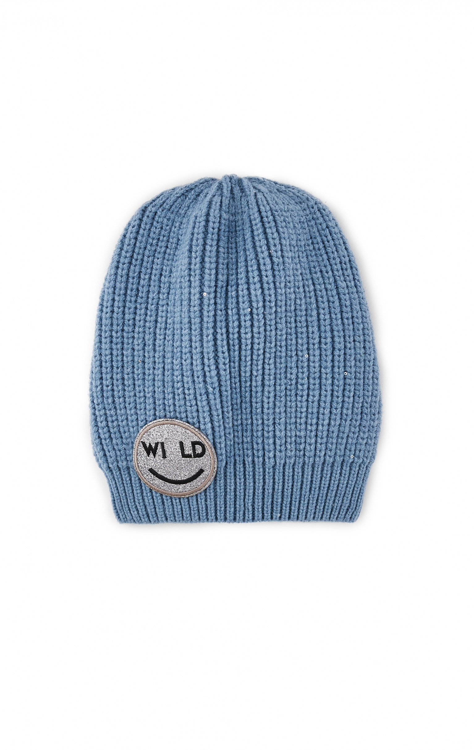 Cet hiver, restez au chaud tout en ayant du style! Vous adopterez à coup sûr ce bonnet uni bleu jean décoré d'un écusson Smiley WILD à paillettes argenté.