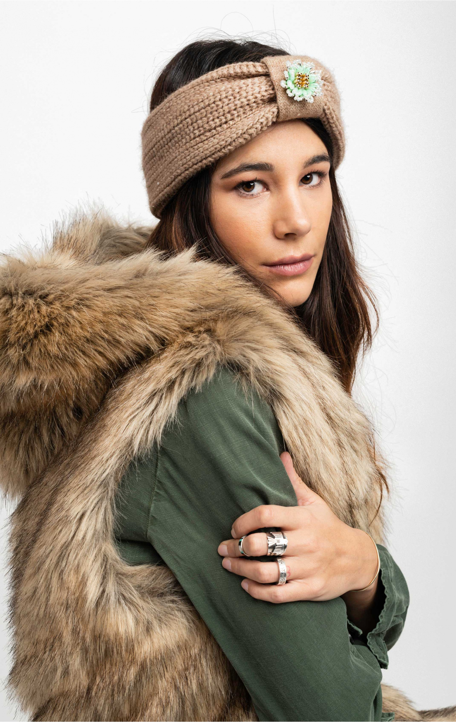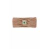 Headband en maille de couleur beige caramel ultra-douce, décoré en son centre d'une fleur cousue en perles aux couleurs nacre, vert et doré.