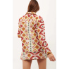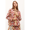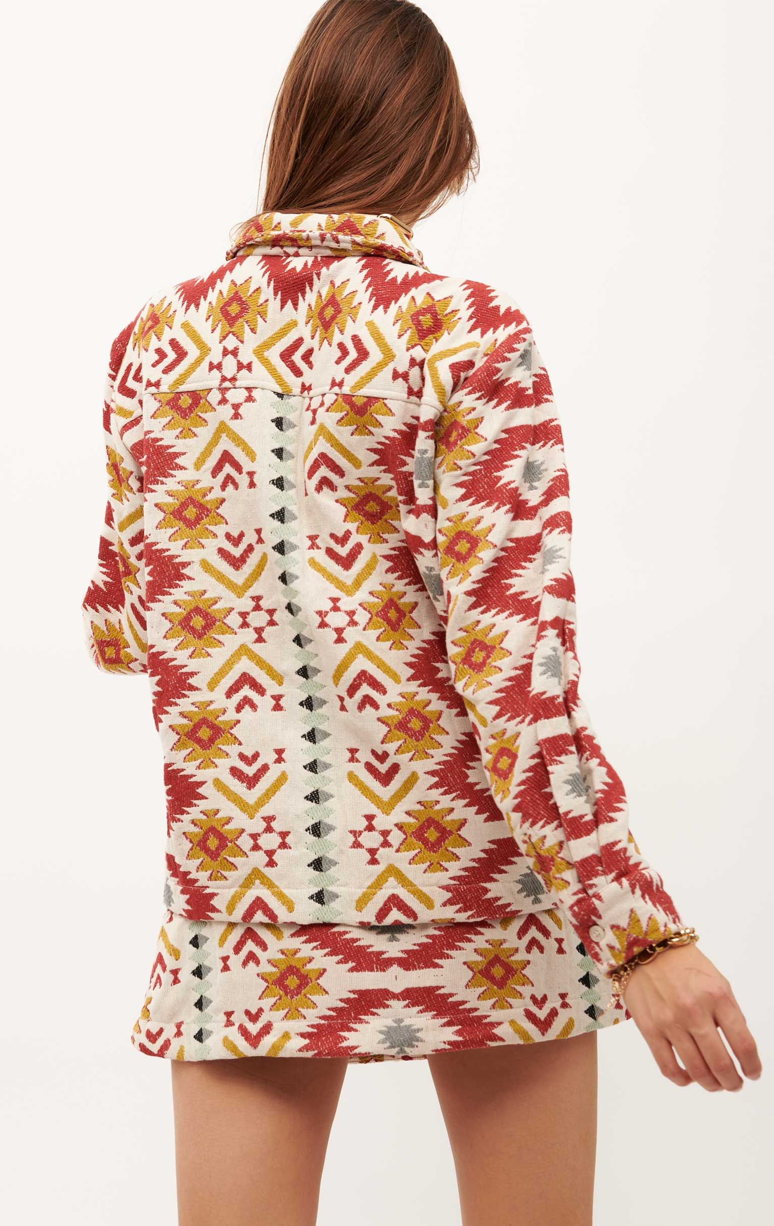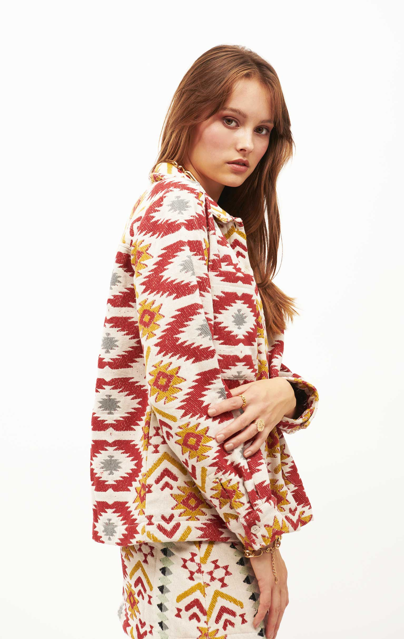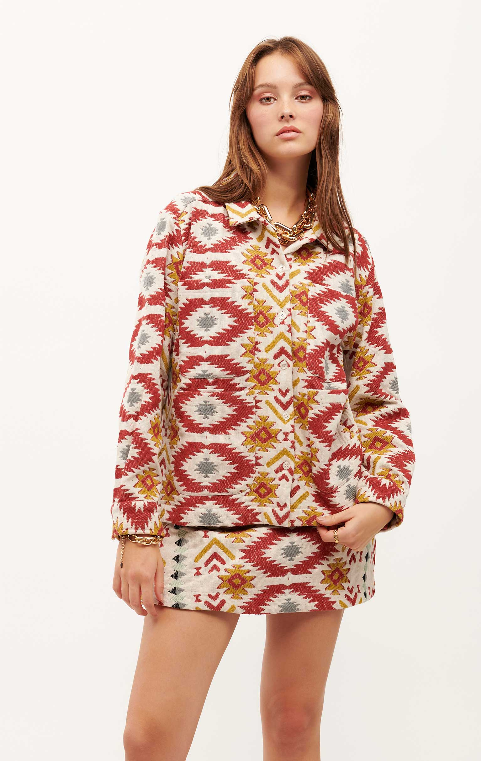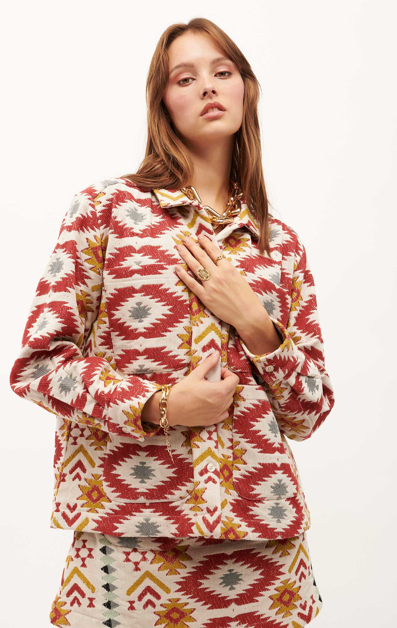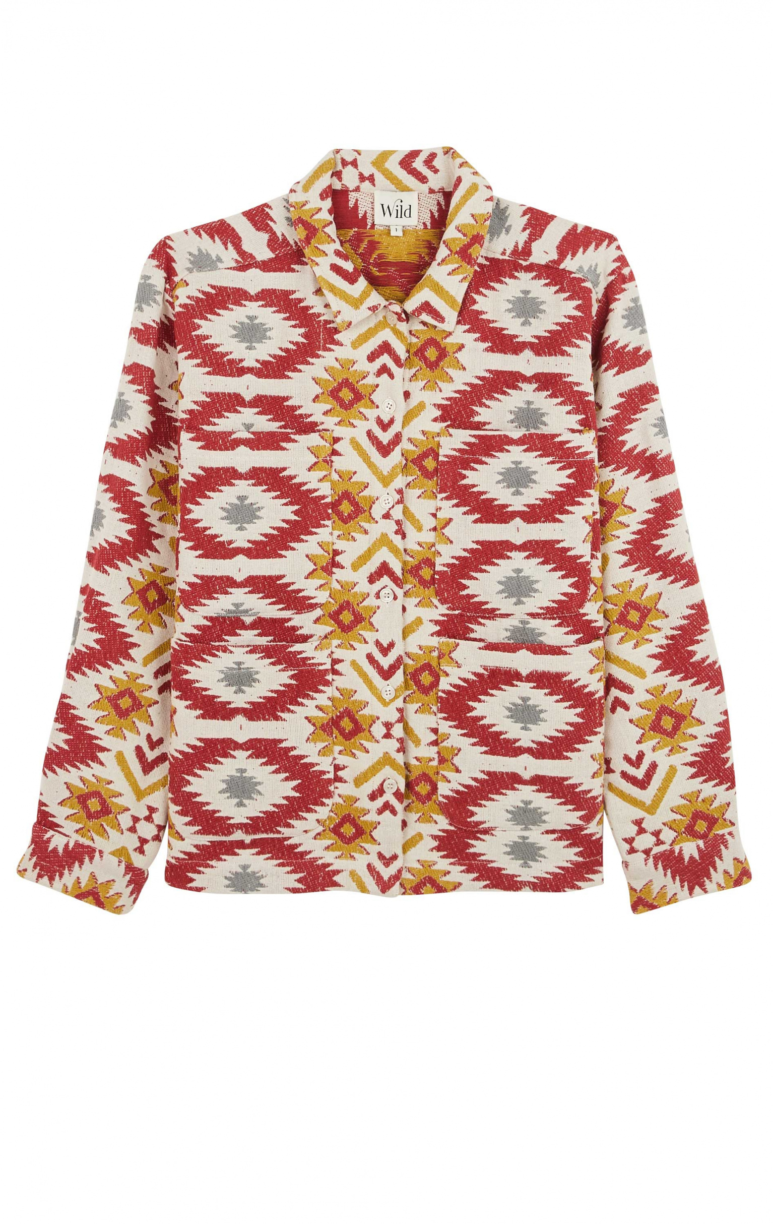 La veste signée WILD avec son tissage handloom hommage à l’artisanat Amérindien. On adore cette pièce qui fait souffler un vent de liberté dans notre vestiaire et nous emmène direction Bryce Canyon, les plaines interminables de l’Arizona, avec ces motifs géométriques en étoiles. C’est la petite veste parfaite d’entrée de saison, ni trop chaude ni trop froide en coton, avec effet coupe-vent. Elle se ferme par une patte de boutonnage centrale, munie d’un petit col pour terminer le côté veste. Quatre poches plaquées sur le devant. On aime cette déclinaison de couleurs écru, brique, vert amande, bleu, céladon dans des motifs géométriques Navajo. Parfaite pour twister un look un peu sage, ou à porter en twin-set avec la jupe assortie.