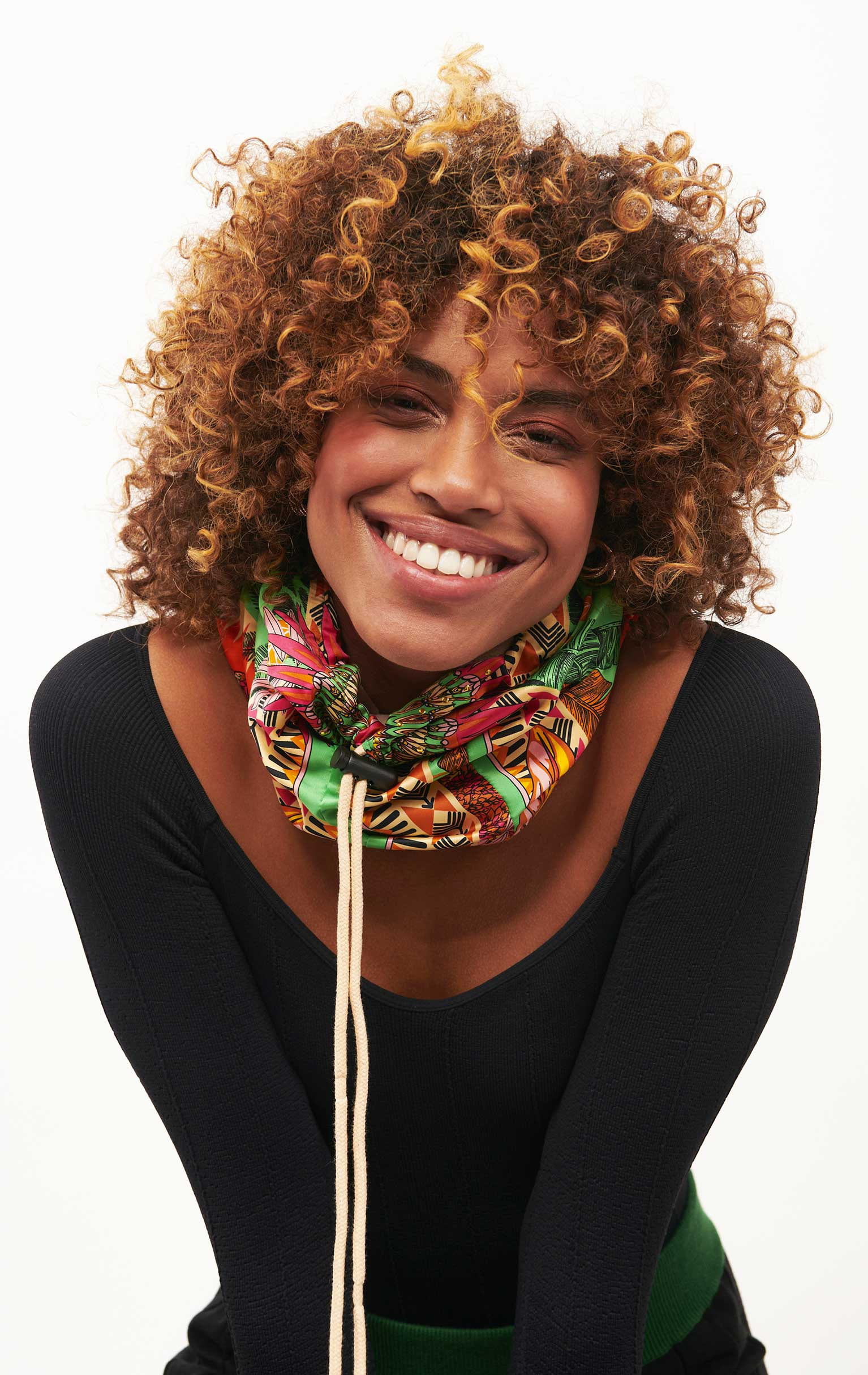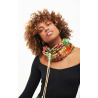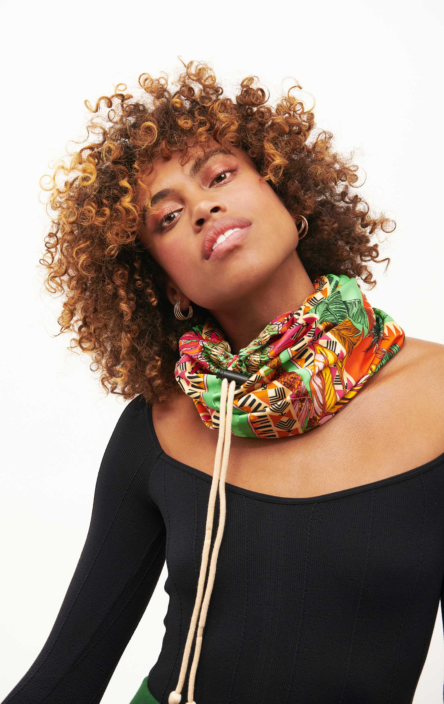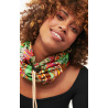 Snood ultra-doux en imprimé de notre foulard Zoulou dans les tons vert, rose, saumon, orange bleu, et doublé polaire sur la peau pour avec chaud tout l'hiver avec style.