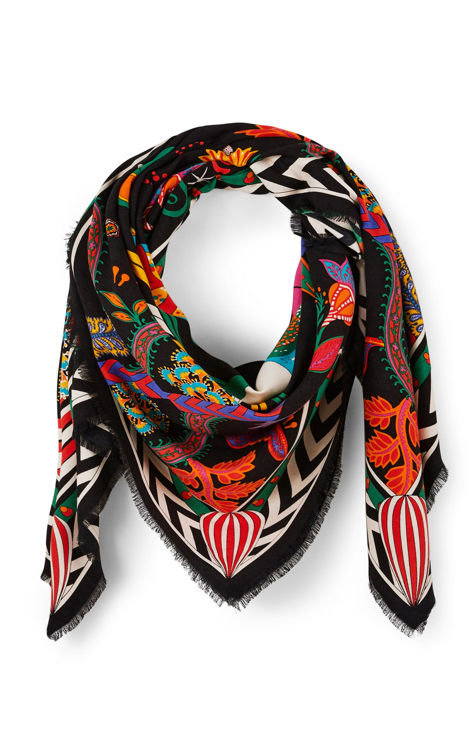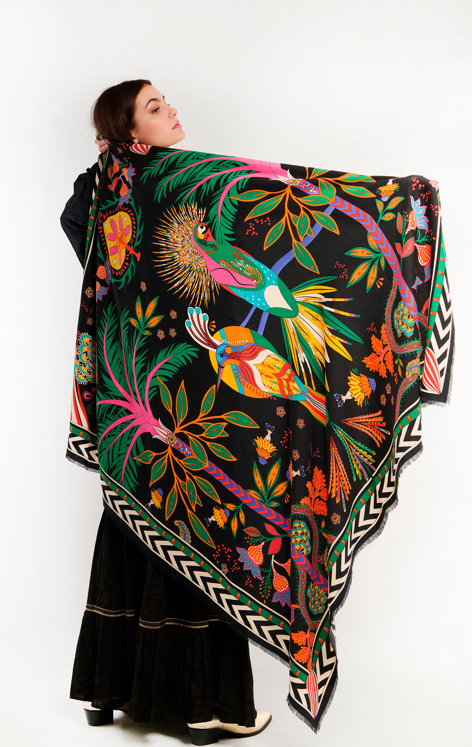 Vous est présenté ici le foulard Magic India, pièce maîtresse de la collection puisque son imprimé est aussi décliné sur tout un vestiaire de notre collection de prêt à porter. Il se décline en 5 coloris: ici dans sa version noire et sa combinaison de tonalités multicolores, encadré d'une bordure noire et blanche très graphique. L'essence principale du thème Magic India évoque un pays enchanteur, où une faune et une flore opulentes se déploient, parmi lesquelles émergent notre palmier adoré, des oiseaux de paradis et des plantes somptueuses. Peut se porter en foulard ou paréo selon le format, ou encore autour du cou, autour de la taille, en turban, ou encore autour de votre sac.