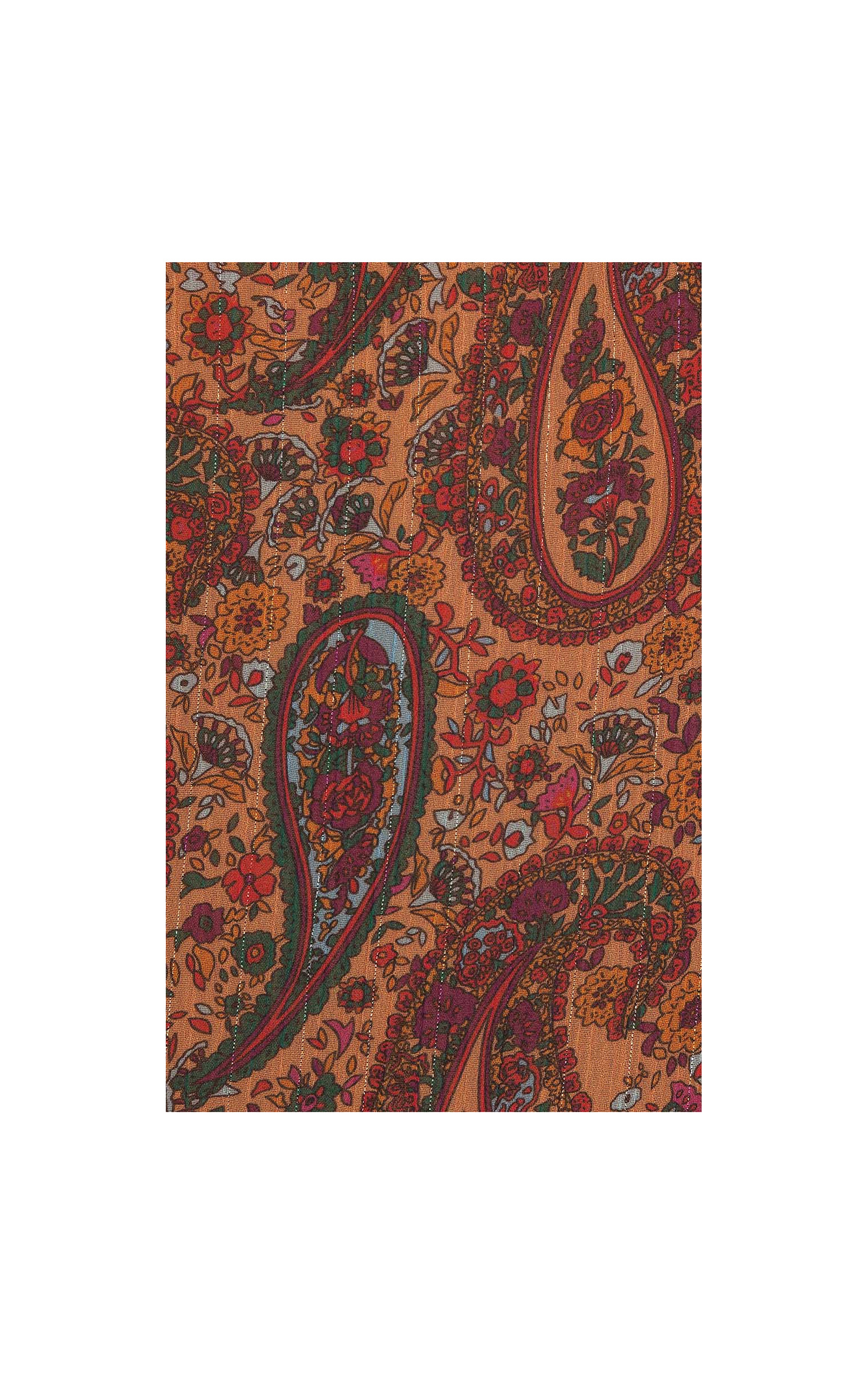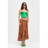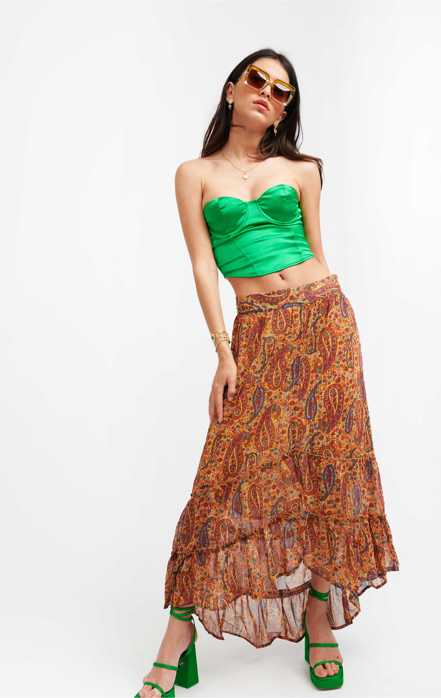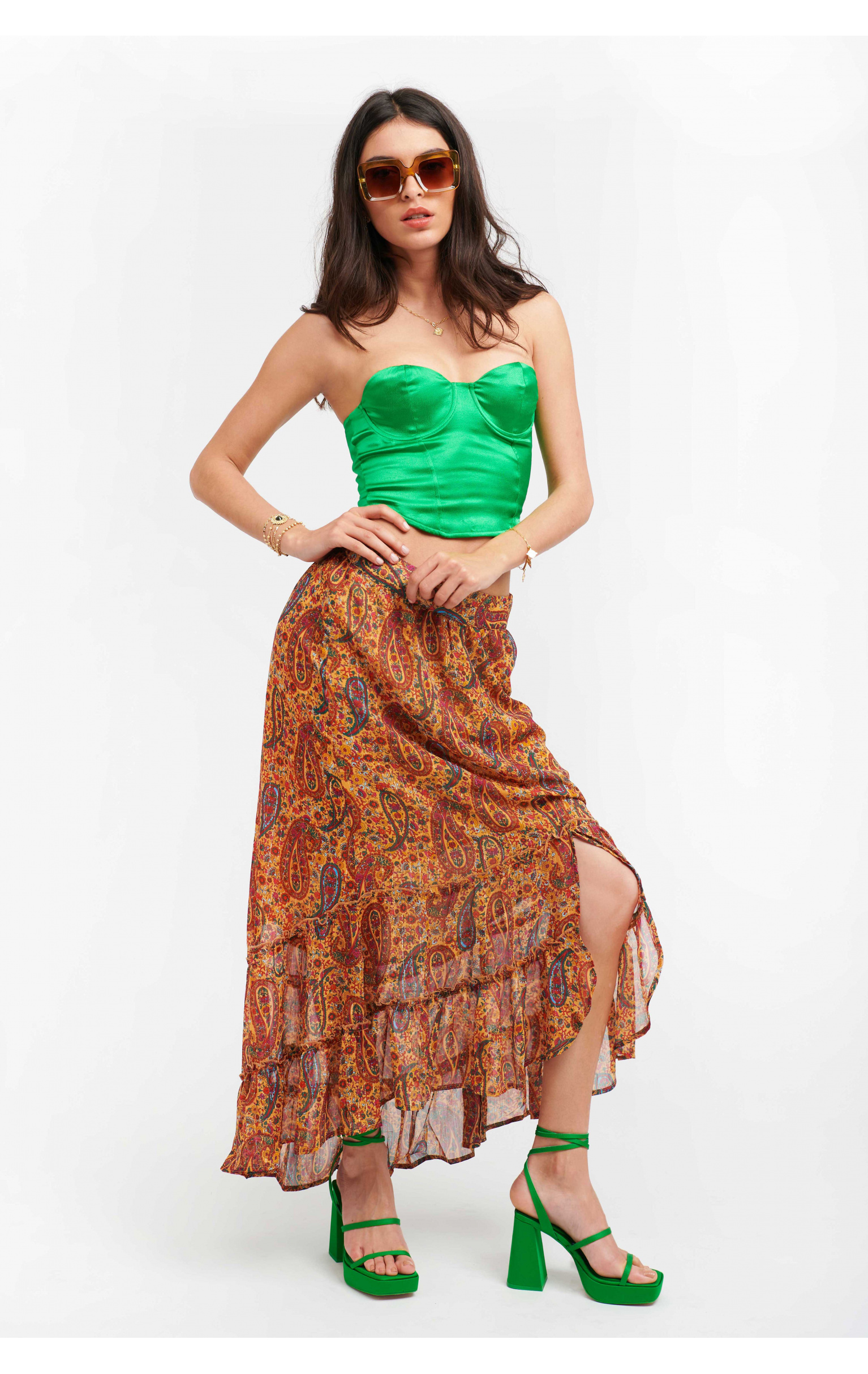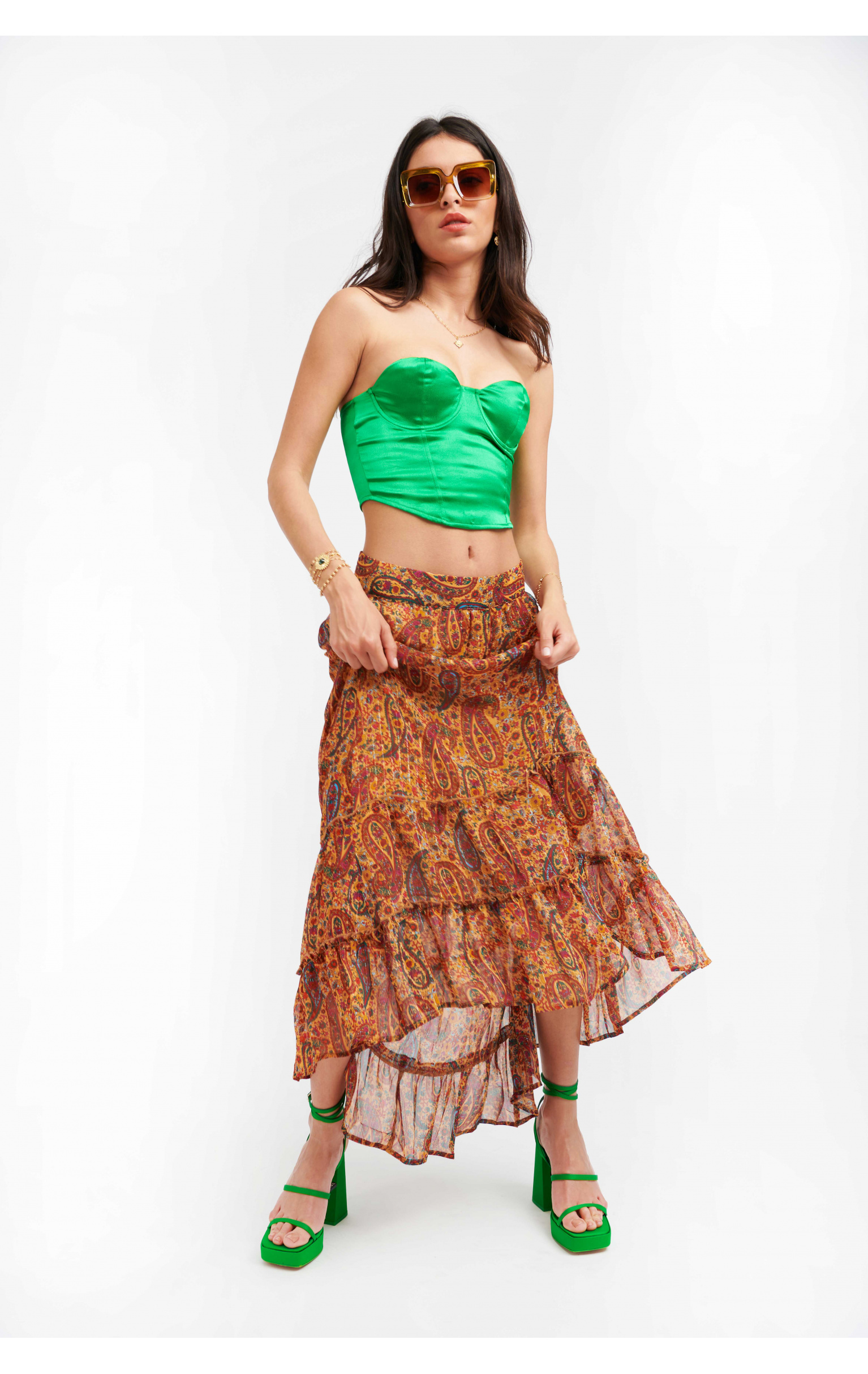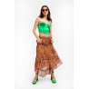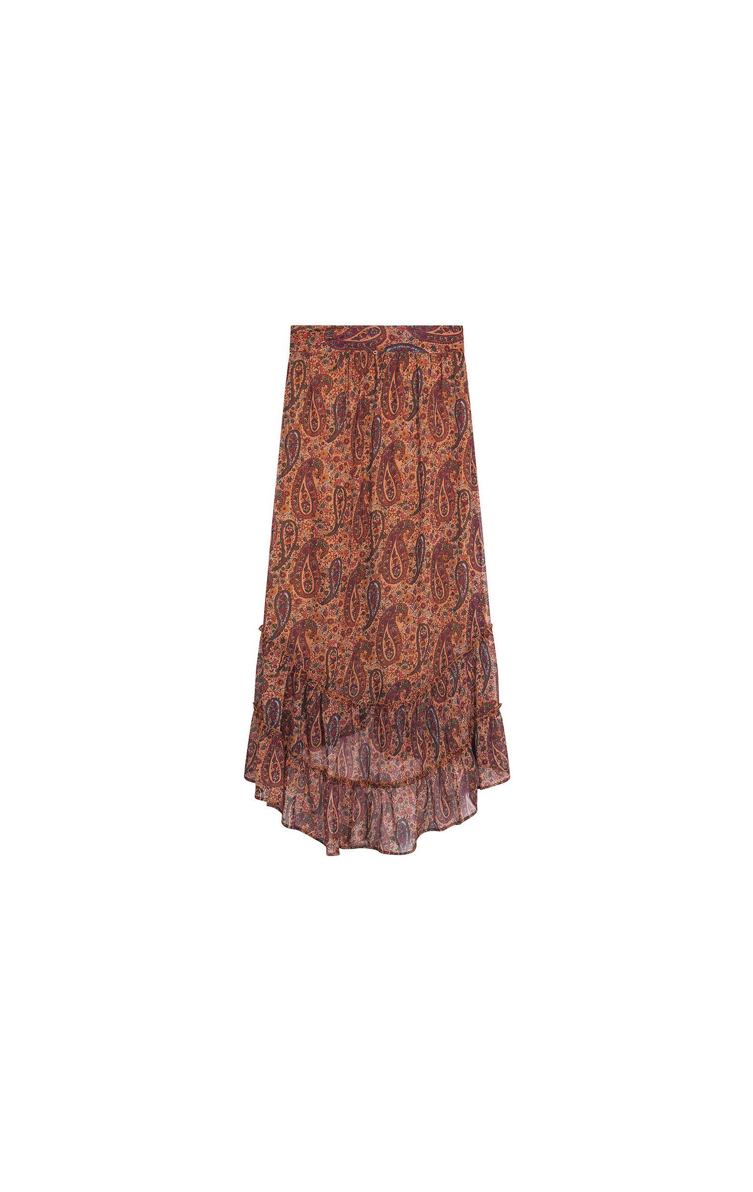 Jupon long avec volants et motif cachemire aux mille couleurs sur fond cumin.