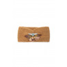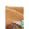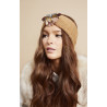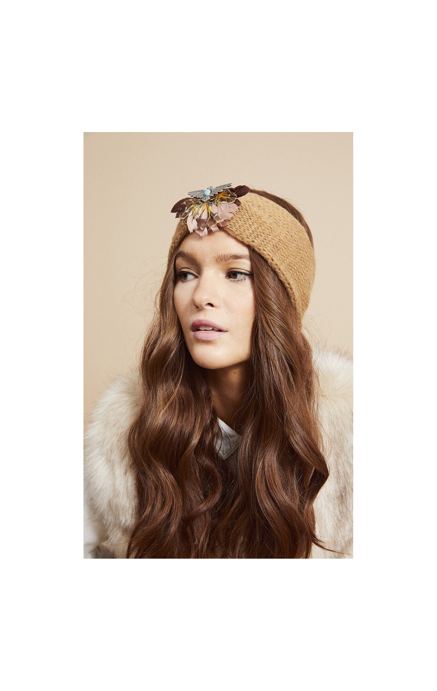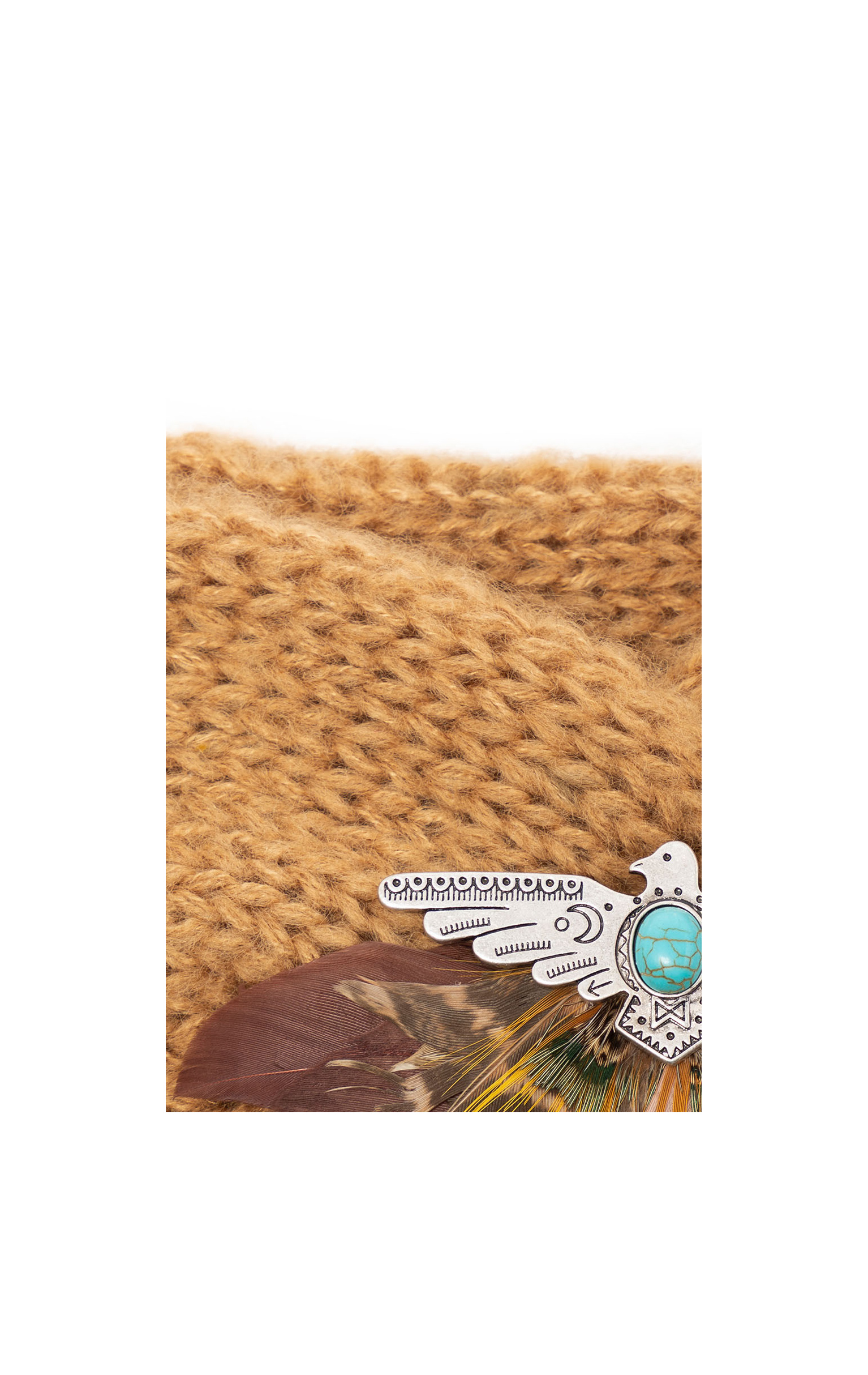 Bandeau caramel en maille, muni d'une broche amovible argentée ornée de plumes.