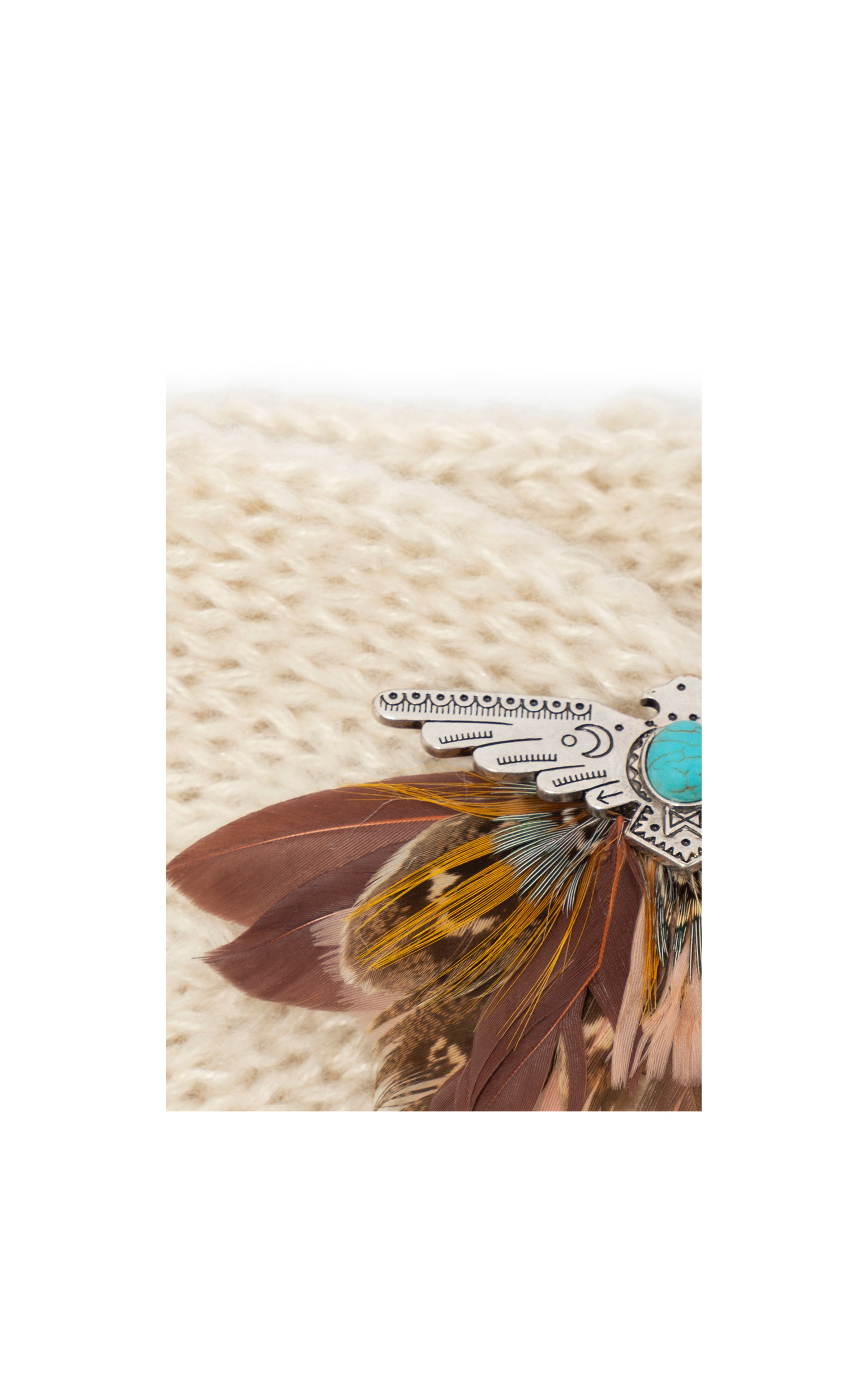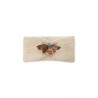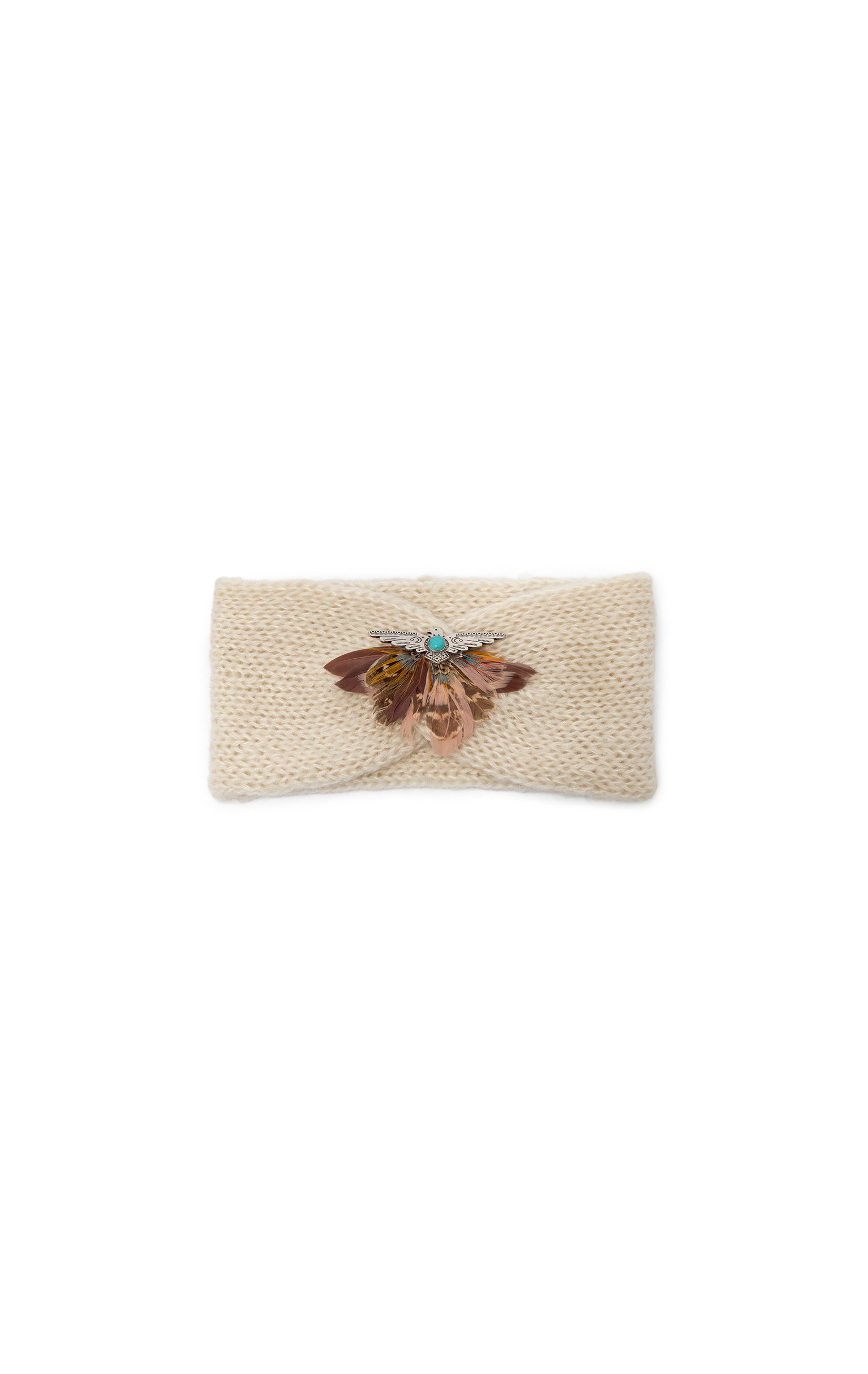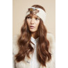Bandeau blanc crème en maille brodé, muni d'une broche amovible argentée ornée de plumes.