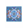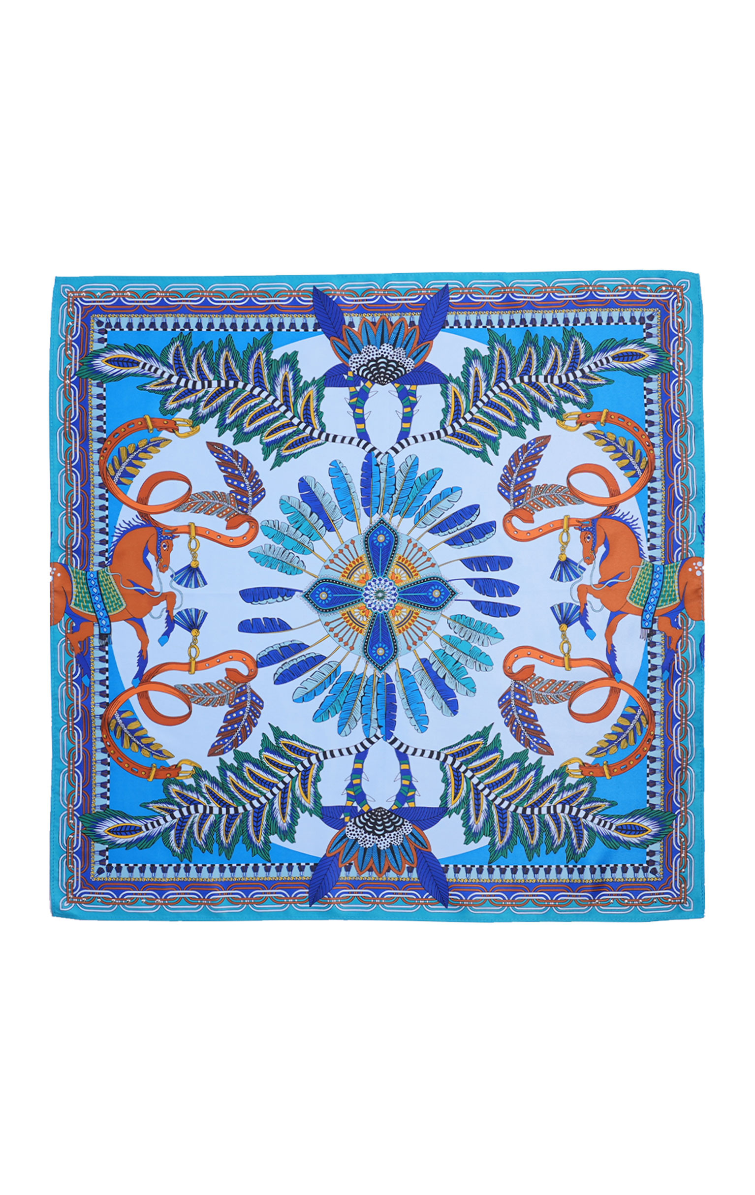 Articulée autour d’un extraordinaire disque solaire central, une prodigieuse végétation recouvre le foulard de ses feuilles multicolores. D’un graphisme riche et très évocateur, des éléments propres à l’univers équestre tels que des pompons ou un licol viennent compléter cet imprimé unique. Décliné en trois couleurs, le fond est, ici, bleu ciel et agrémenté de couleurs bleu cyan, bleu électrique, jaunes, noires et caramel. Versatile, il se porte aussi bien en foulard qu’en paréo selon le format. Nouez-le autour du cou, de la taille, en turban, ou même en accessoire chic sur votre sac.
