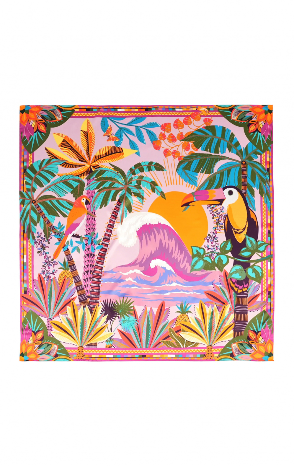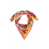 Baigné dans un univers fantasmagorique et hallucinogène, ENCHANTERED se pare en son centre d'un œil façon pentacle autour duquel quatre soleils aux visages poupons viennent se dessiner. Dans cette même veine, le reste du foulard raconte un monde à part, à la frontière de l'inconscient et d'un imaginaire débridé et coloré, sur fond de larges rayures empruntées à l'esthétique des années 70. Décliné en deux couleurs, ENCHANTERED est ici dans sa version rose et se révèle dans des tons turquoise, jaunes, oranges, mauves, roses, violets, rouge carmin et bleu ciel.