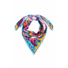 Baigné dans un univers fantasmagorique et hallucinogène, ENCHANTERED se pare en son centre d'un œil façon pentacle autour duquel quatre soleils aux visages poupons viennent se dessiner. Dans cette même veine, le reste du foulard raconte un monde à part, à la frontière de l'inconscient et d'un imaginaire débridé et coloré, sur fond de larges rayures empruntées à l'esthétique des années 70. Décliné en deux couleurs, ENCHANTERED est ici dans sa version bleue et se révèle dans des tons orange corail, rose fuchsia, turquoise, jaunes, parme, indigo et vert prairie.