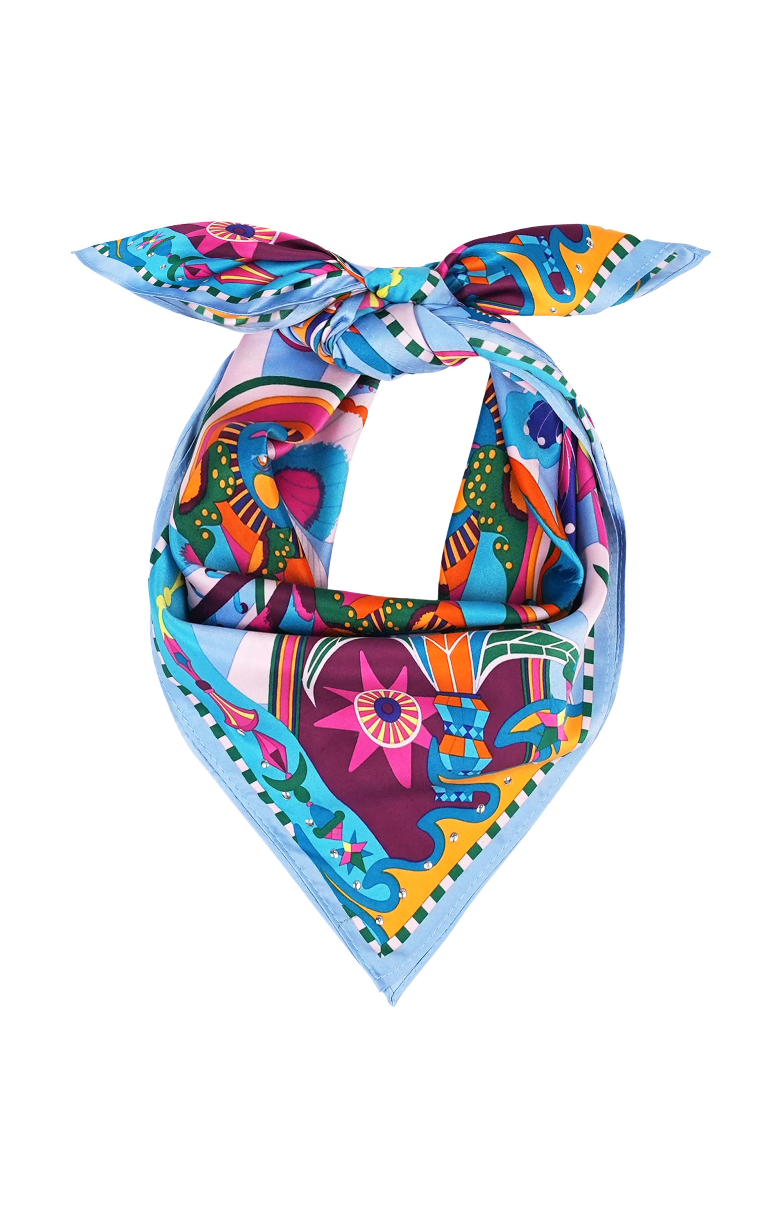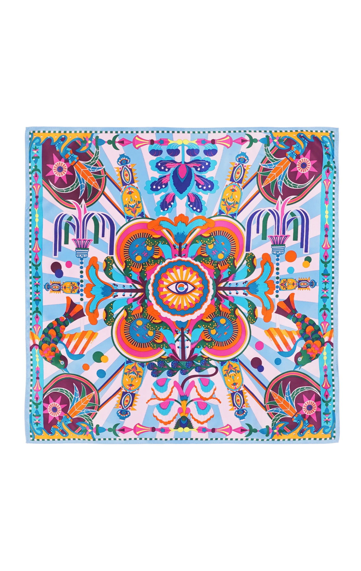 Baigné dans un univers fantasmagorique et hallucinogène, ENCHANTERED se pare en son centre d'un œil façon pentacle autour duquel quatre soleils aux visages poupons viennent se dessiner. Dans cette même veine, le reste du foulard raconte un monde à part, à la frontière de l'inconscient et d'un imaginaire débridé et coloré, sur fond de larges rayures empruntées à l'esthétique des années 70. Décliné en deux couleurs, ENCHANTERED est ici dans sa version bleue et se révèle dans des tons orange corail, rose fuchsia, turquoise, jaunes, parme, indigo et vert prairie.