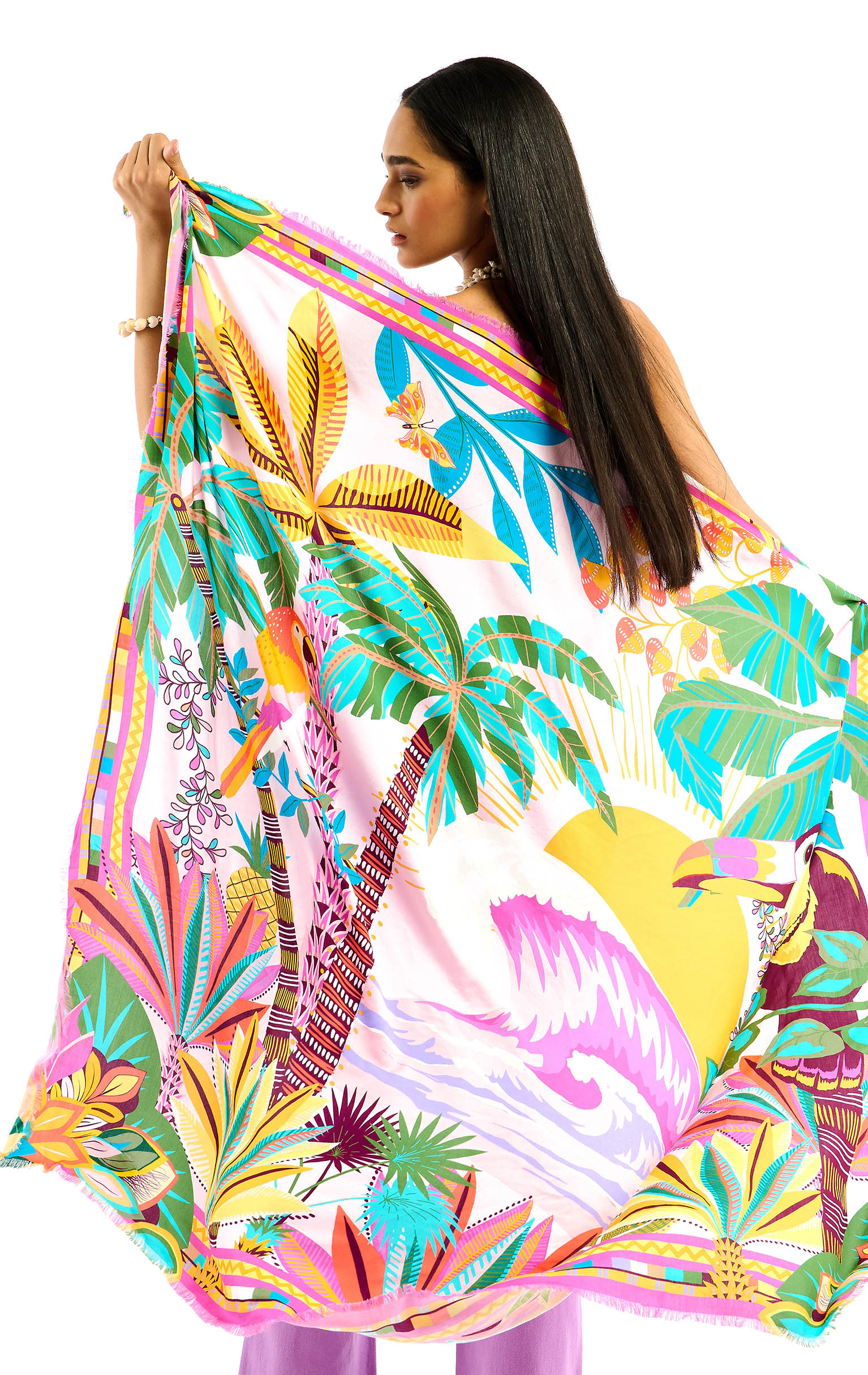 Chez Wild, chaque création devient l’occasion de dessiner des palmiers et de magnifier la luxuriance d’une nature tropicale. Oiseaux de paradis, perroquets flamboyants, dattiers et végétation XXL s’épanouissent sur un décor vibrant, illuminé par un soleil généreux et ponctué d’une vague, clin d’œil à l’océan, fidèle compagnon de nos collections d’été. HAWAÏ se décline en trois couleurs. Il est ici dans sa déclinaison rose, sublimée par des nuances lilas, roses, vert bouteille, turquoise, fuchsia, jaunes, rouges et corail ponctuées de noir.