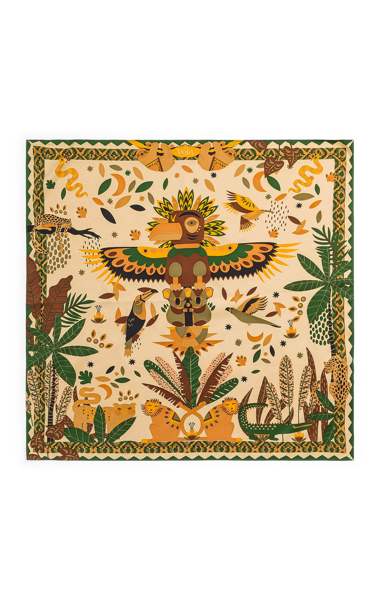 Mini foulard sur le thème de l'animal totem représenté par l'aigle puissant, dans les tons beige, kaki, ocre et vert bouteille.