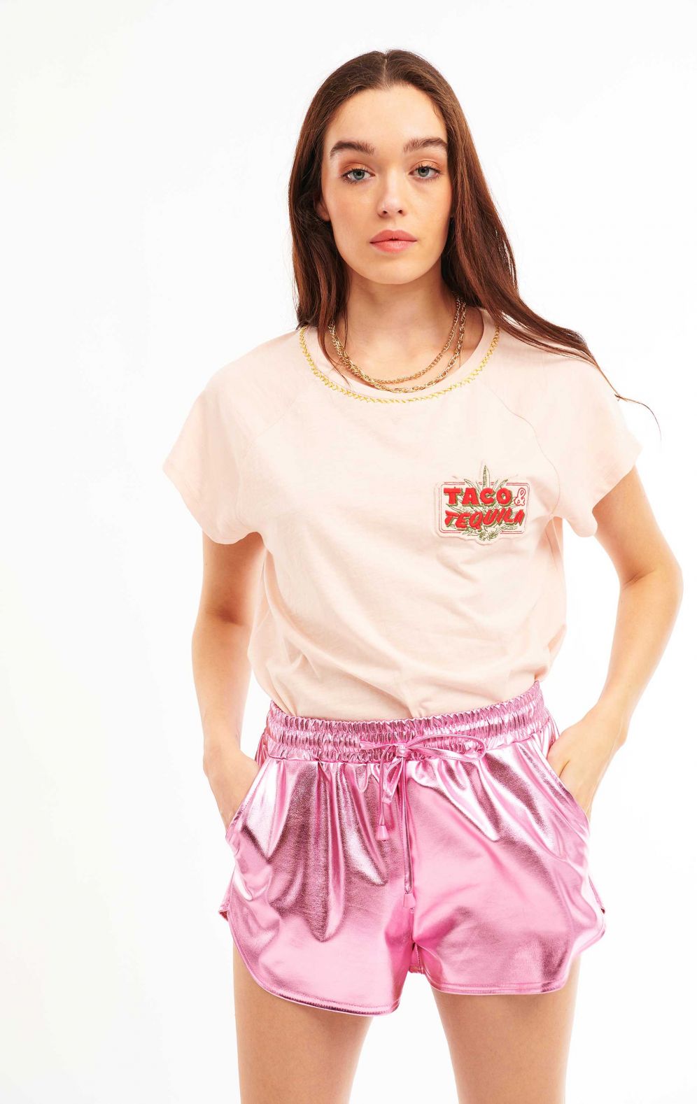 T-shirt noir vintage type football américain 80's à la coupe boyfriend fit, imprimé "wild" rose, violet, blanc, et vert, avec des découpes sur les manches dans les mêmes tons.