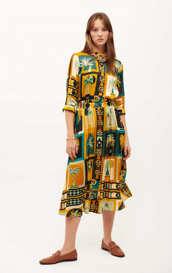 Chemise manches longues en viscose, sur laquelle se décline le motif du foulard Beldi: avec des petits tableaux de palmiers, des bordures graphiques et un peu baroques.