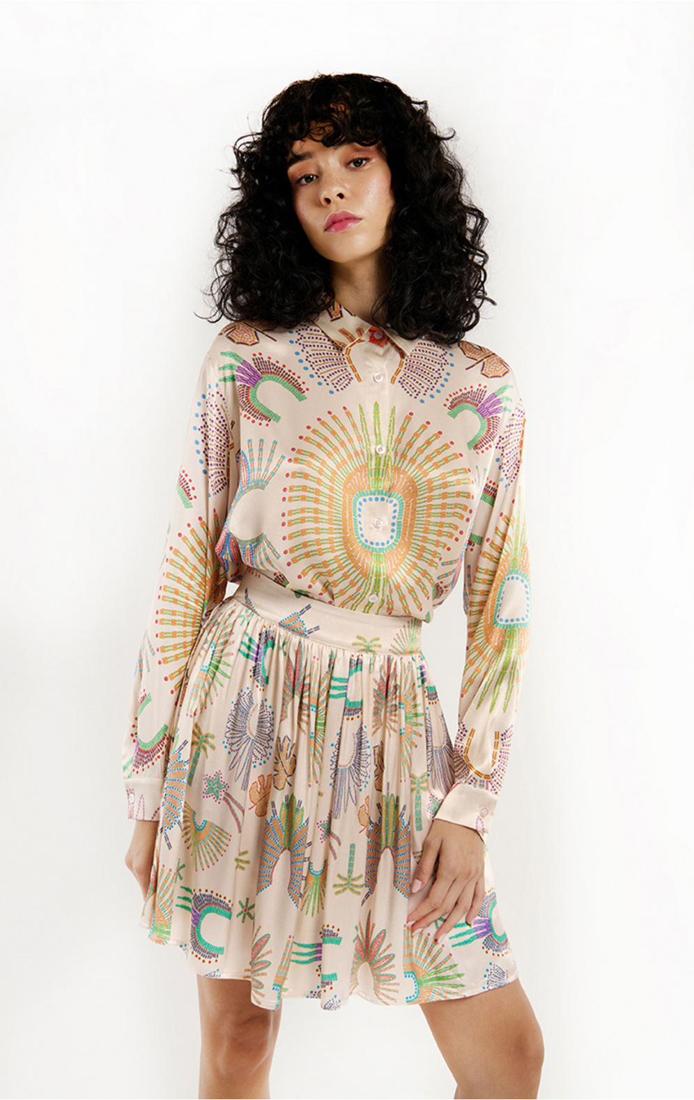 Caftan crème dans une matière satinée, reprenant les motifs du foulard Wakiza, paré de couronnes de plumes amazoniennes, de palmiers, d’étoiles filantes, façon petites perles brodées. Dans des tons rose, vert, jaune, bleu turquoise, violet, orange.
