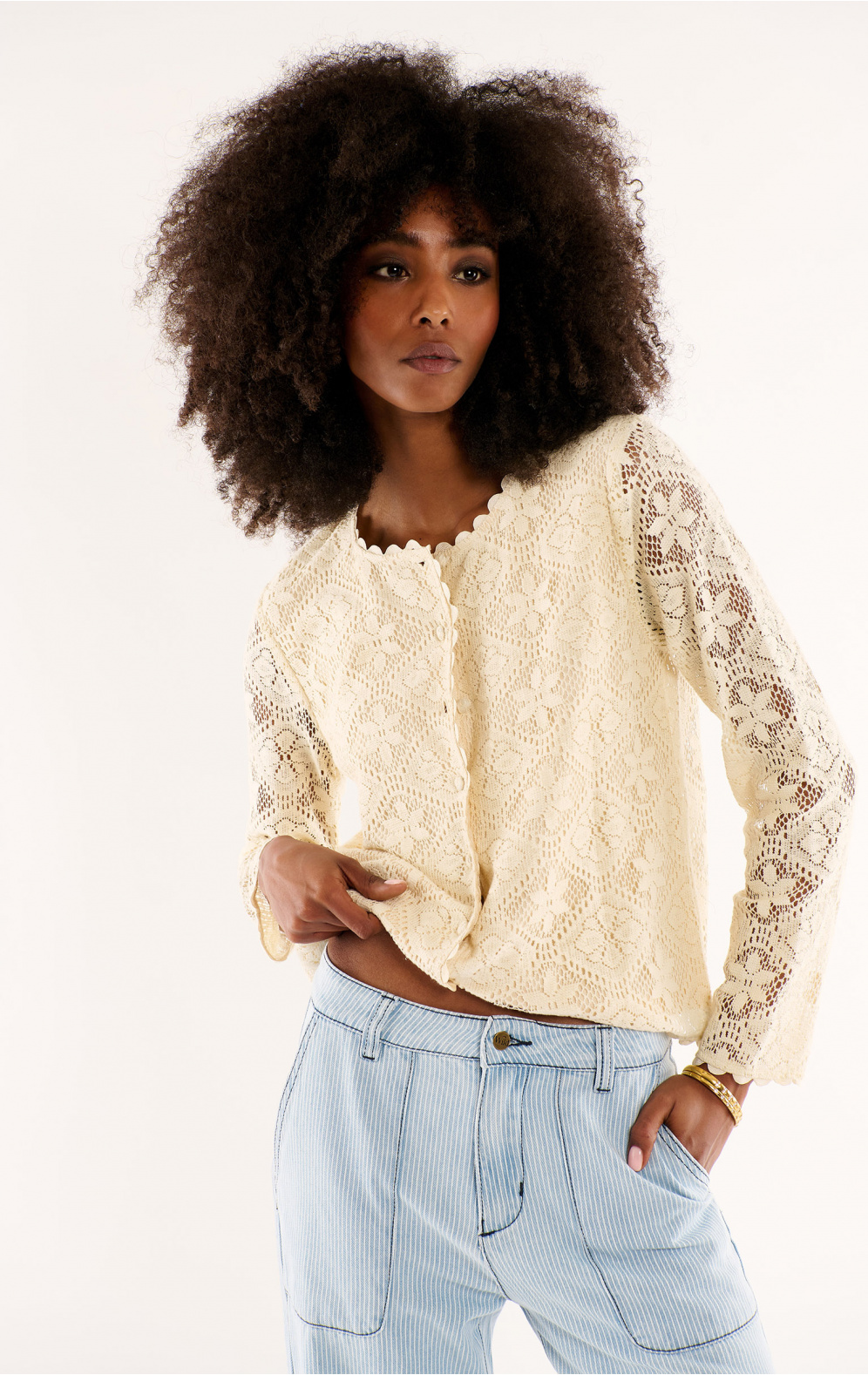 Confectionné en léger crochet dentelle, Hedda se boutonne sur toute sa longueur par d’adorables boutons recouverts. Son décolleté, à l’arrondi parfait, et ses larges bretelles dévoilent, avec une élégance très féminine, notre peau hâlée des mois d’été. Gansée d’un ravissant croquet sur son encolure, son emmanchure et son bas de vêtement, Hedda se porte en twin-set avec notre pantalon Kayle ou, pour un look plus décalé, sur un short en jean. Il se décline en trois couleurs : blanc cassé, noir et vert menthe.