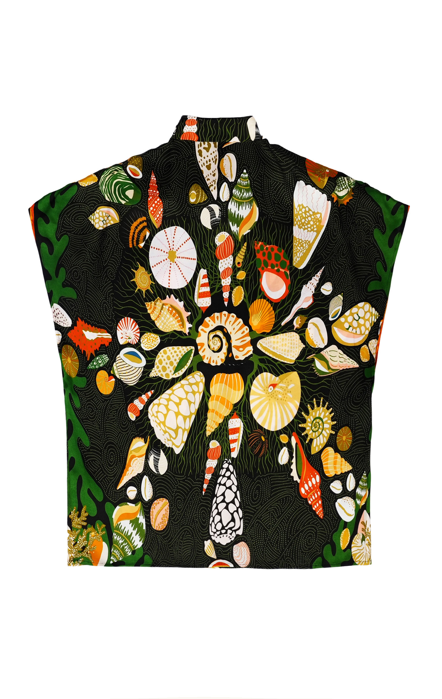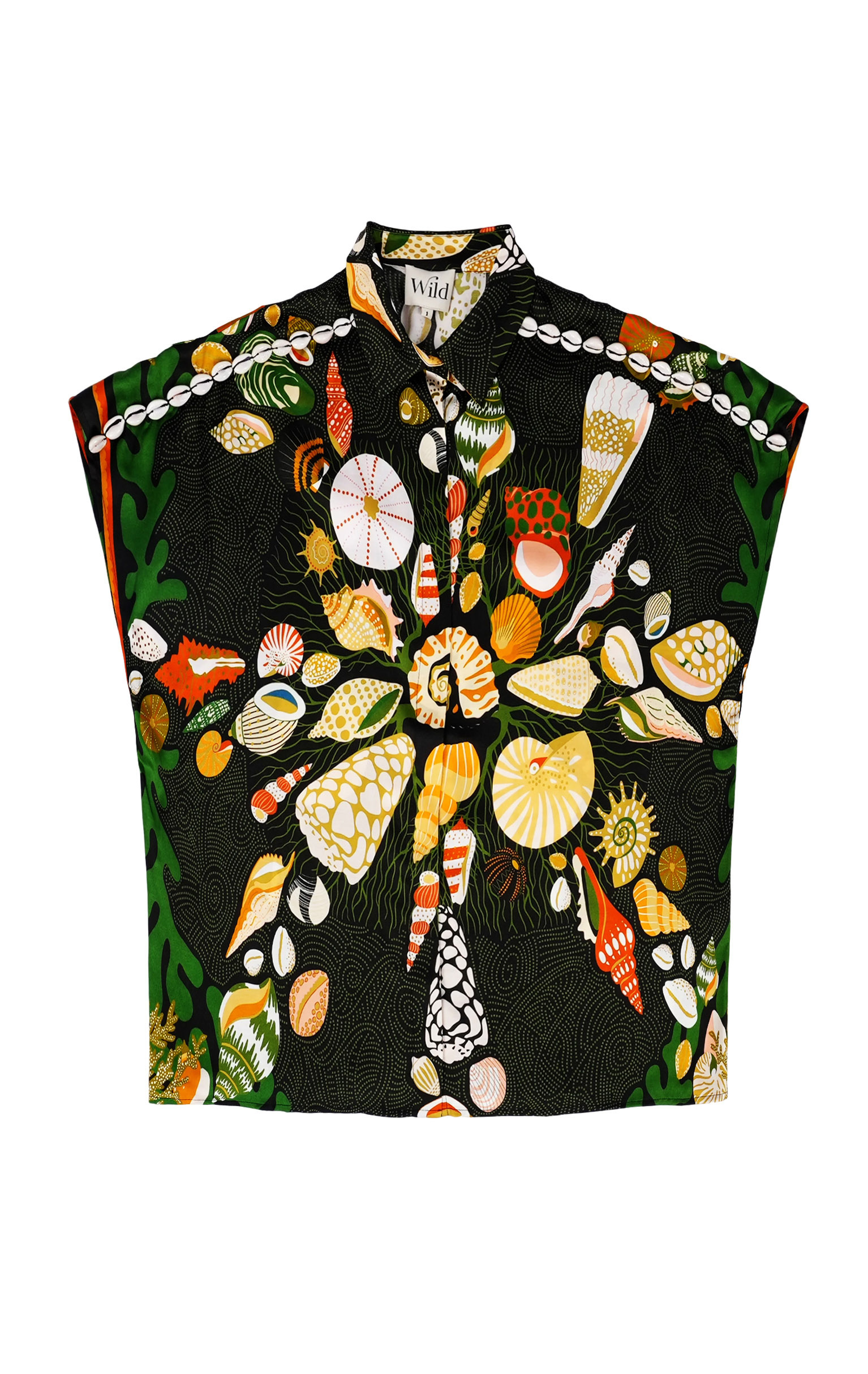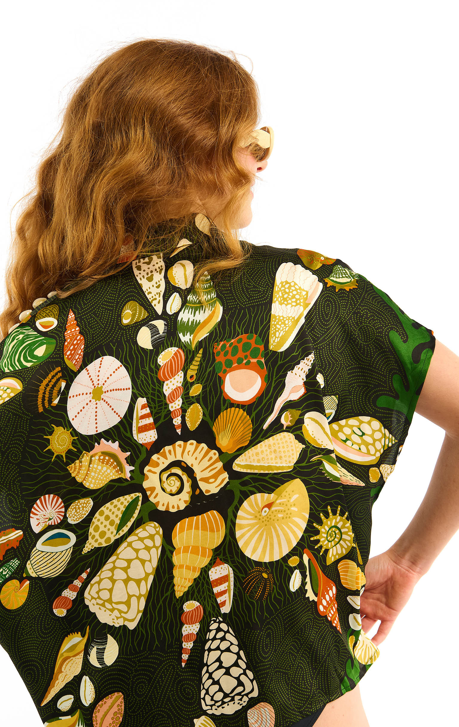 Ses manches courtes et larges inspirées kimono et sa patte de boutonnage structurent cette pièce estivale. En all over, notre imprimé iconique CORAL, décliné dans ses deux versions. Ici, dans sa déclinaison noire, il dévoile cette fresque vivante et sexy où coquillages, coraux, crustacés et créatures marines se mêlent aux tons intenses — chocolat, ocre, kaki, jaune et blanc — sur un fond noir profond.