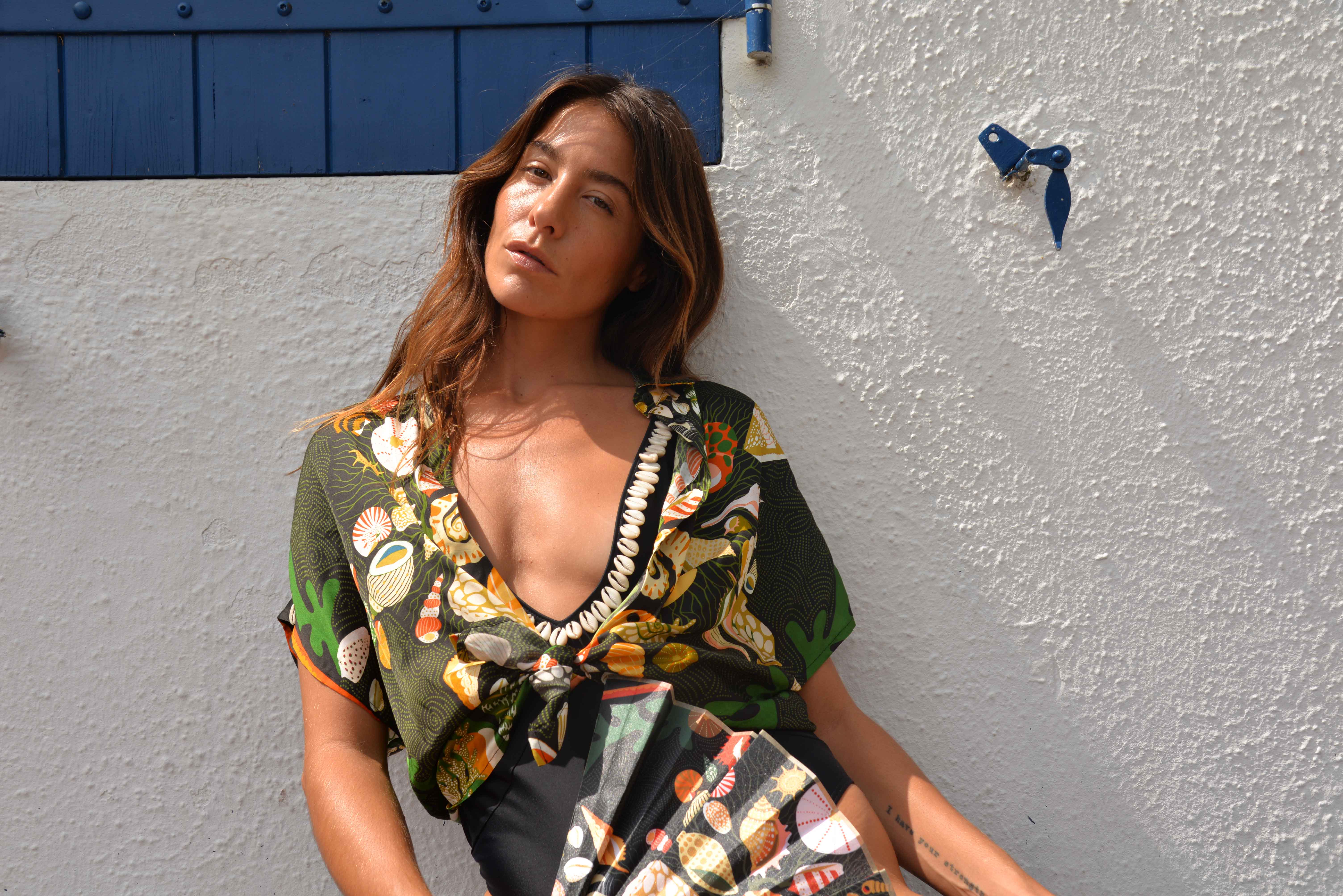 Ses manches courtes et larges inspirées kimono et sa patte de boutonnage structurent cette pièce estivale. En all over, notre imprimé iconique CORAL, décliné dans ses deux versions. Ici, dans sa déclinaison noire, il dévoile cette fresque vivante et sexy où coquillages, coraux, crustacés et créatures marines se mêlent aux tons intenses — chocolat, ocre, kaki, jaune et blanc — sur un fond noir profond.