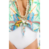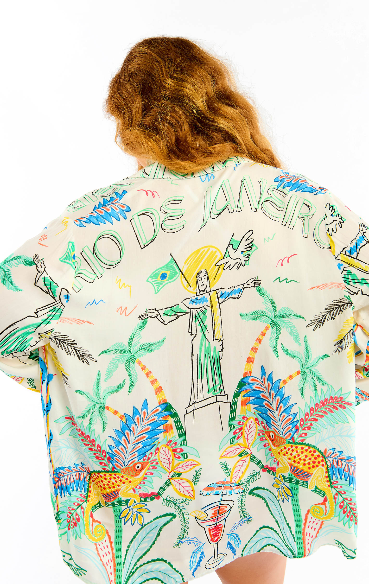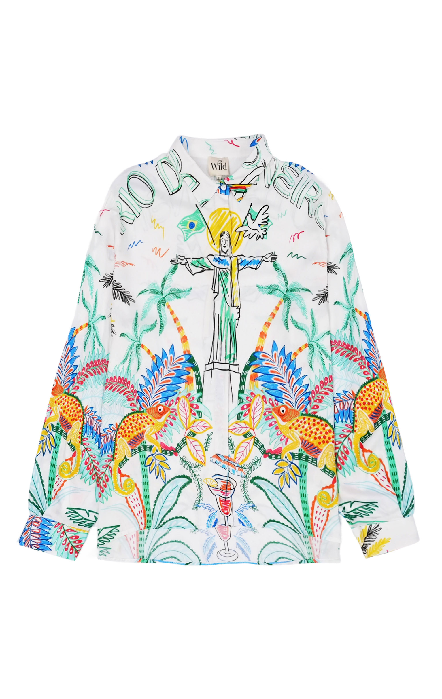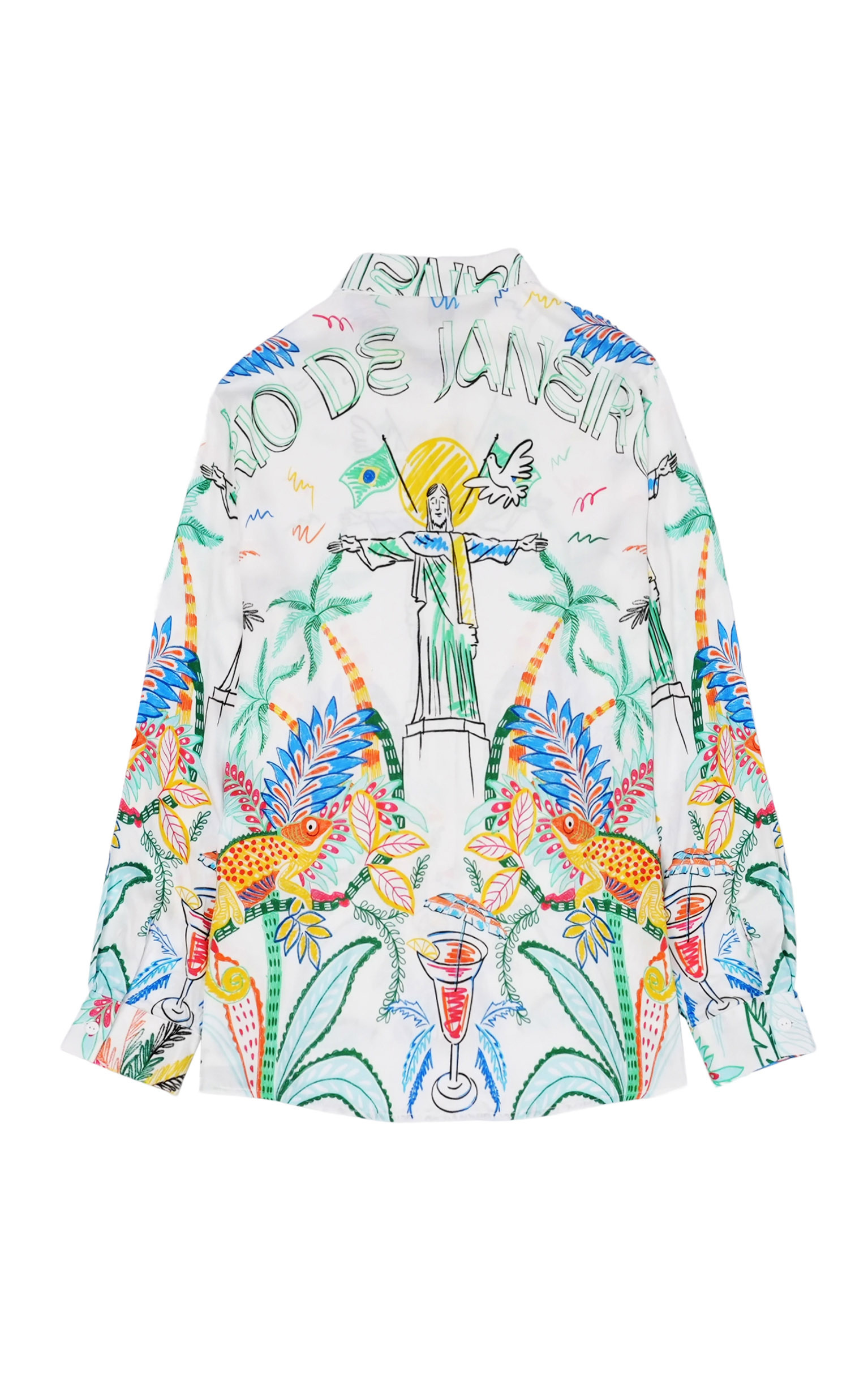 La chemise BONAVENTURE BAHIA se pare de notre imprimé BAHIA, sur lequel un Christ Rédempteur emblématique veille depuis le mont Corcovado. Autour de lui, palmiers, perroquets, végétation luxuriante, animaux exotiques et drapeau brésilien composent une fresque vibrante. Ici en version blanche, l’imprimé se décline en deux couleurs.
