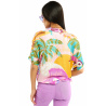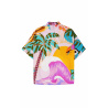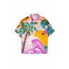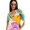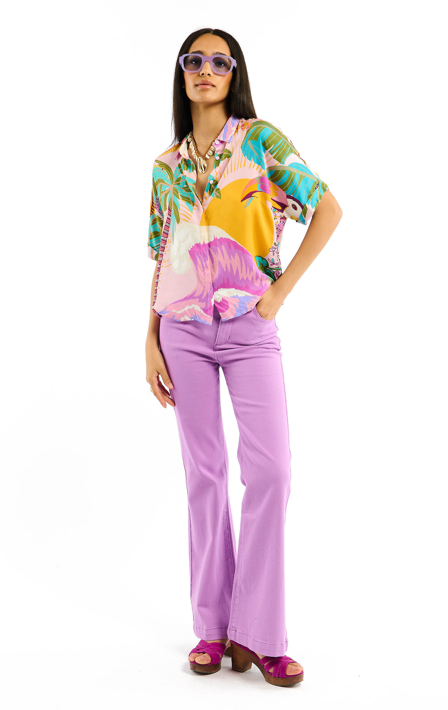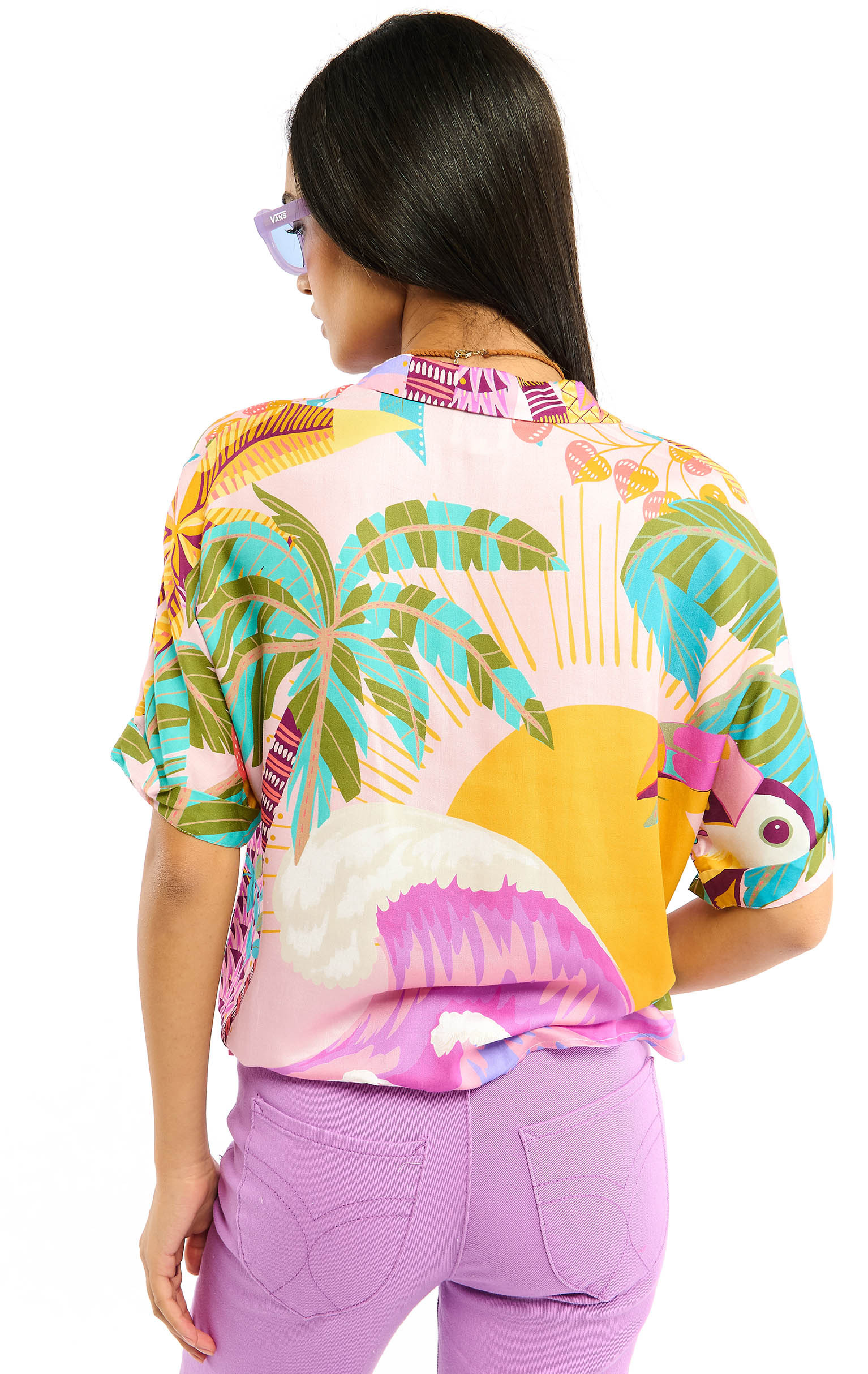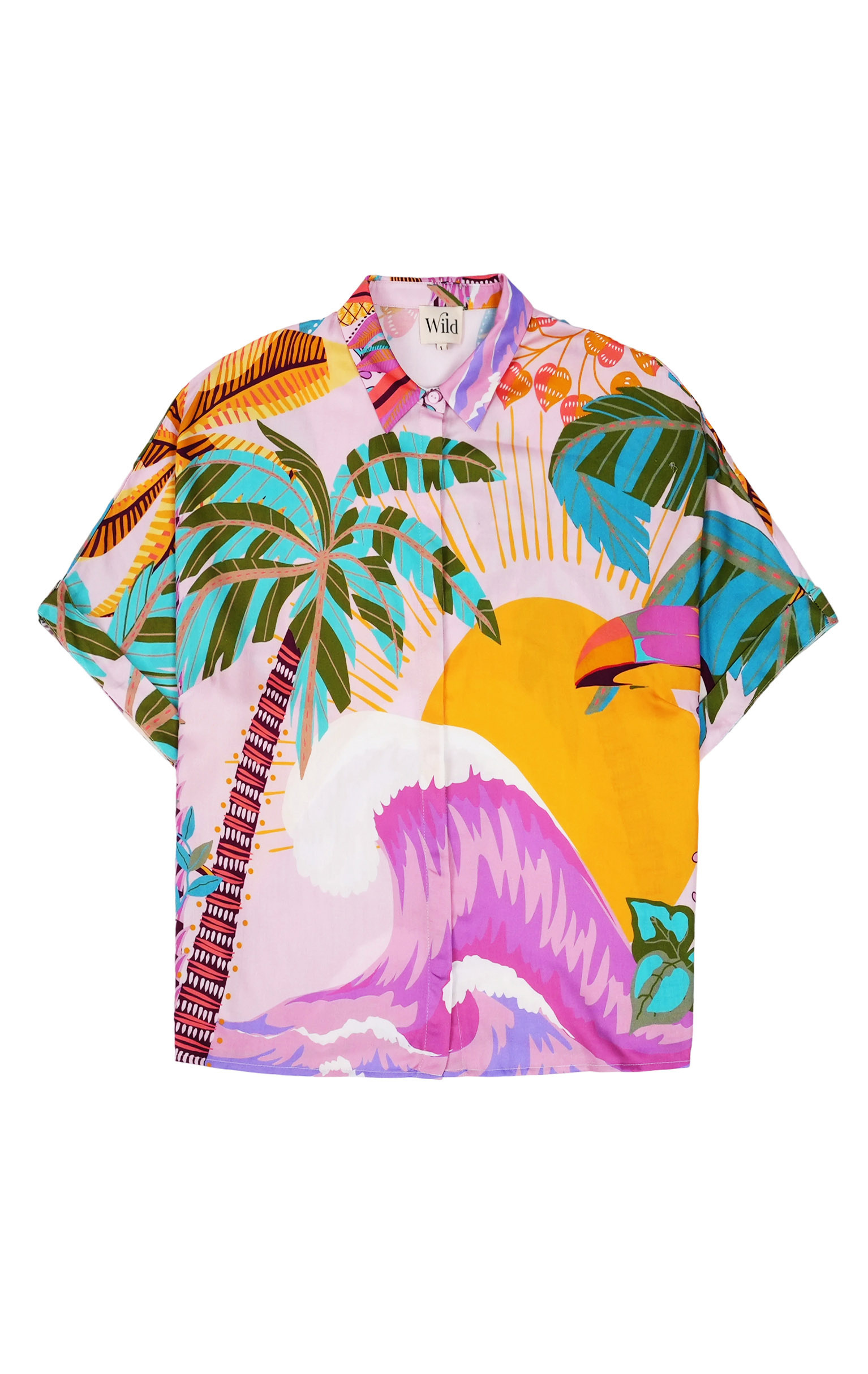 Confectionnée dans une viscose ultra douce et très agréable au porter, la chemise SANTINO, structurée par ses manches inspirées kimono que l'on peut remonter à l'envi sur le haut du bras, se pare en all over de notre imprimé HAWAÏ. Sous un soleil généreux, oiseaux de paradis, perroquets flamboyants et végétation XXL composent un décor luxuriant, dominé par une vague stylisée — clin d’œil vibrant à l’océan, fil rouge de nos étés. SANTINO existe en trois couleurs, elle est ici dans sa déclinaison rose.