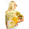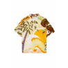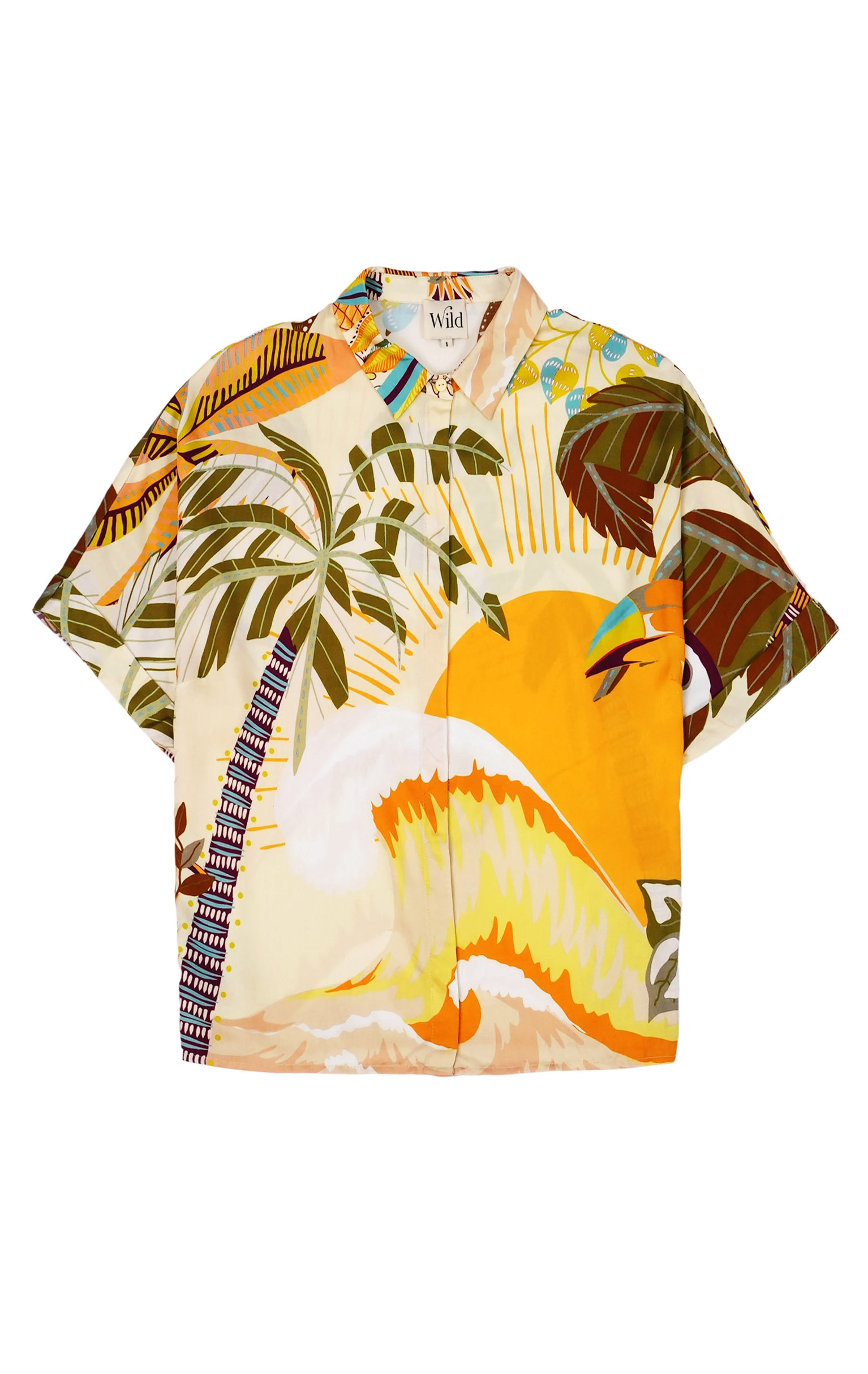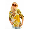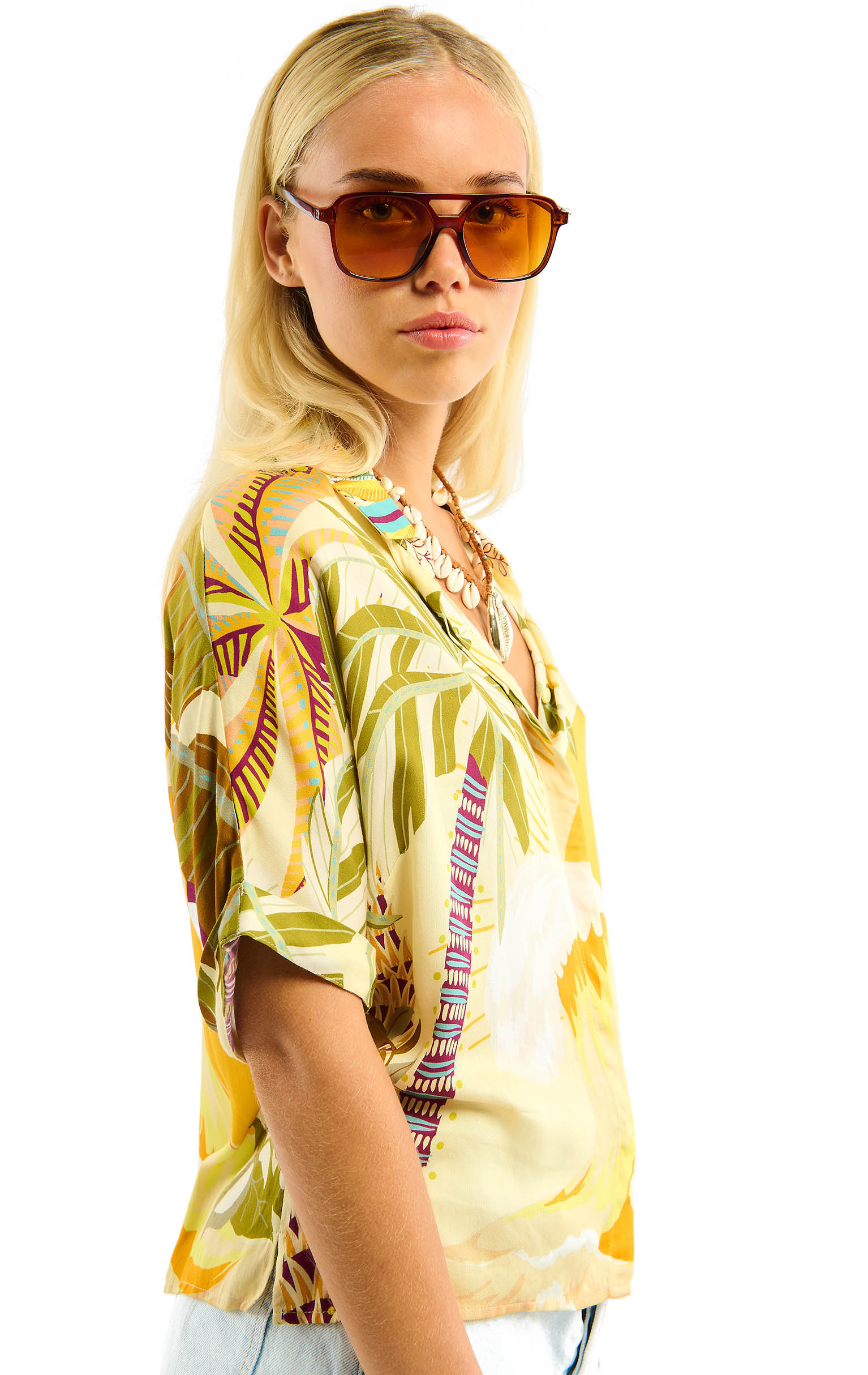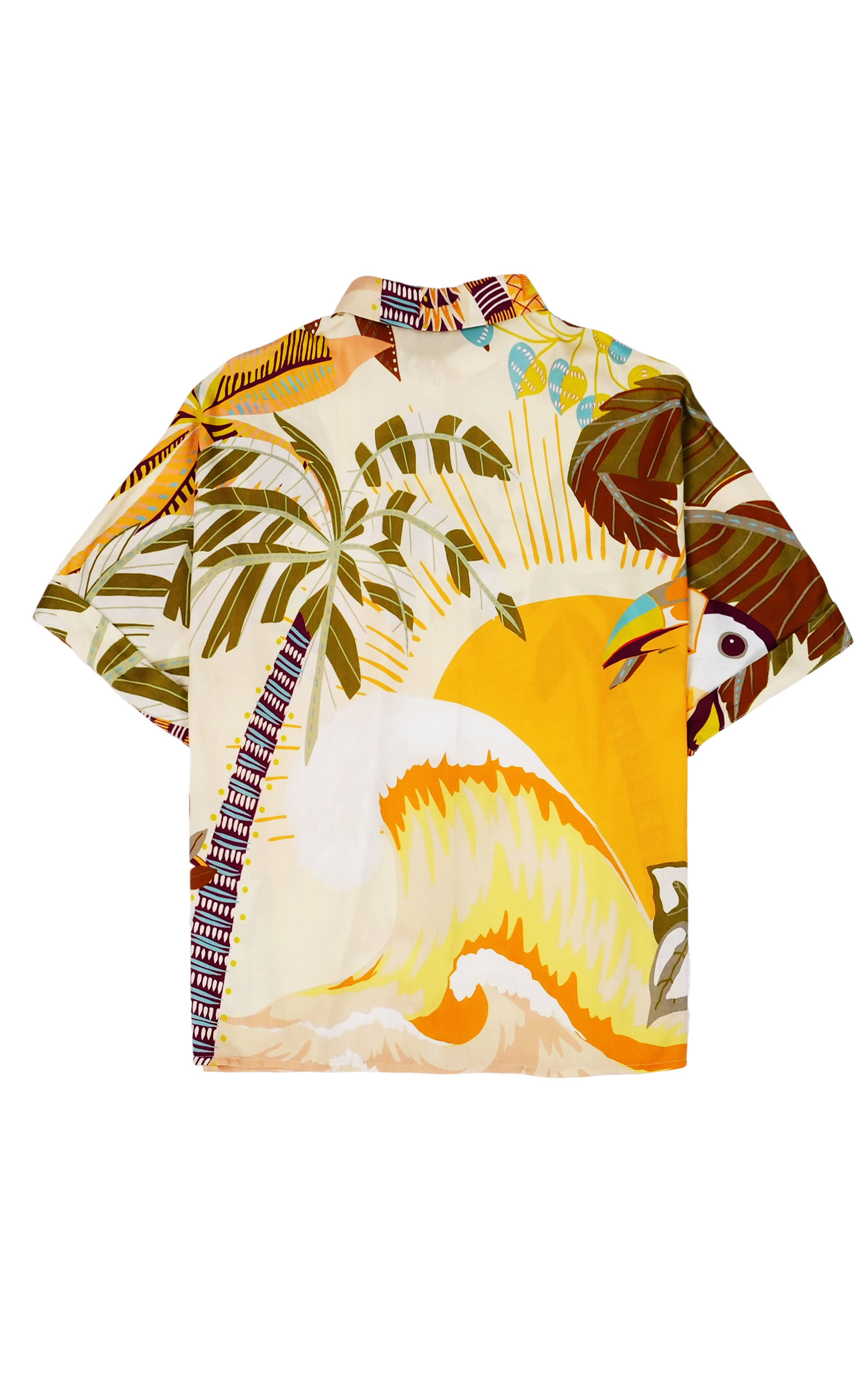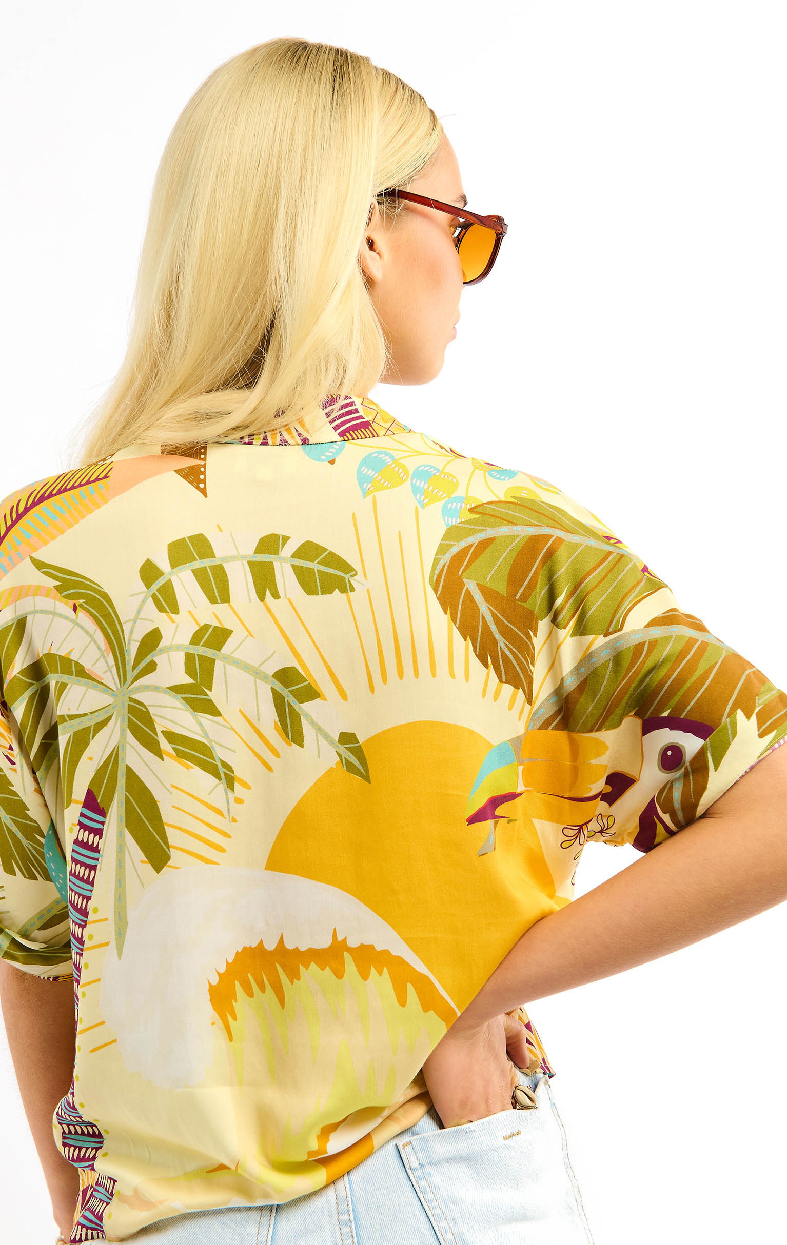 Confectionnée dans une viscose ultra douce et très agréable au porter, la chemise SANTINO, structurée par ses manches inspirées kimono que l'on peut remonter à l'envi sur le haut du bras, se pare en all over de notre imprimé HAWAÏ. Sous un soleil généreux, oiseaux de paradis, perroquets flamboyants et végétation XXL composent un décor luxuriant, dominé par une vague stylisée — clin d’œil vibrant à l’océan, fil rouge de nos étés. SANTINO existe en trois couleurs, elle est ici dans sa déclinaison jaune.