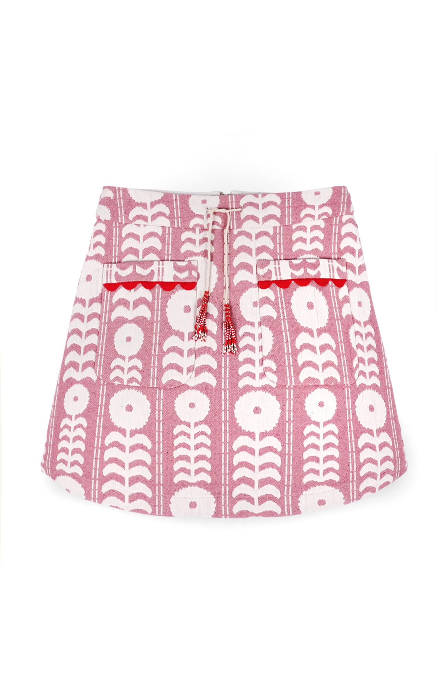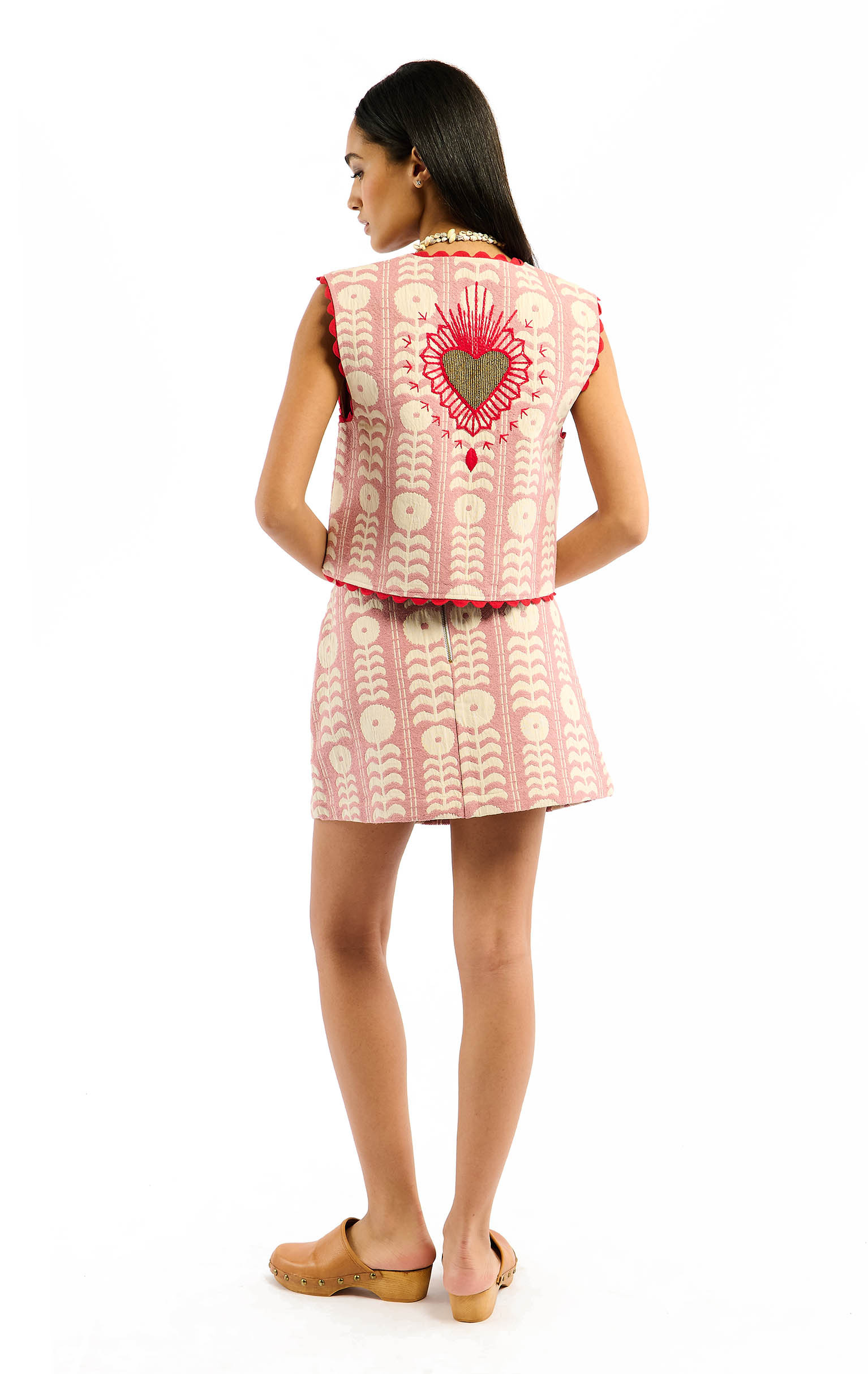 Assortie à notre gilet GWEN, la jupe ELORA se révèle dans ce même textile décoratif couture, réhaussé de fleurs stylisées dans des tons de rose et d’ivoire sur un jacquard travaillé.