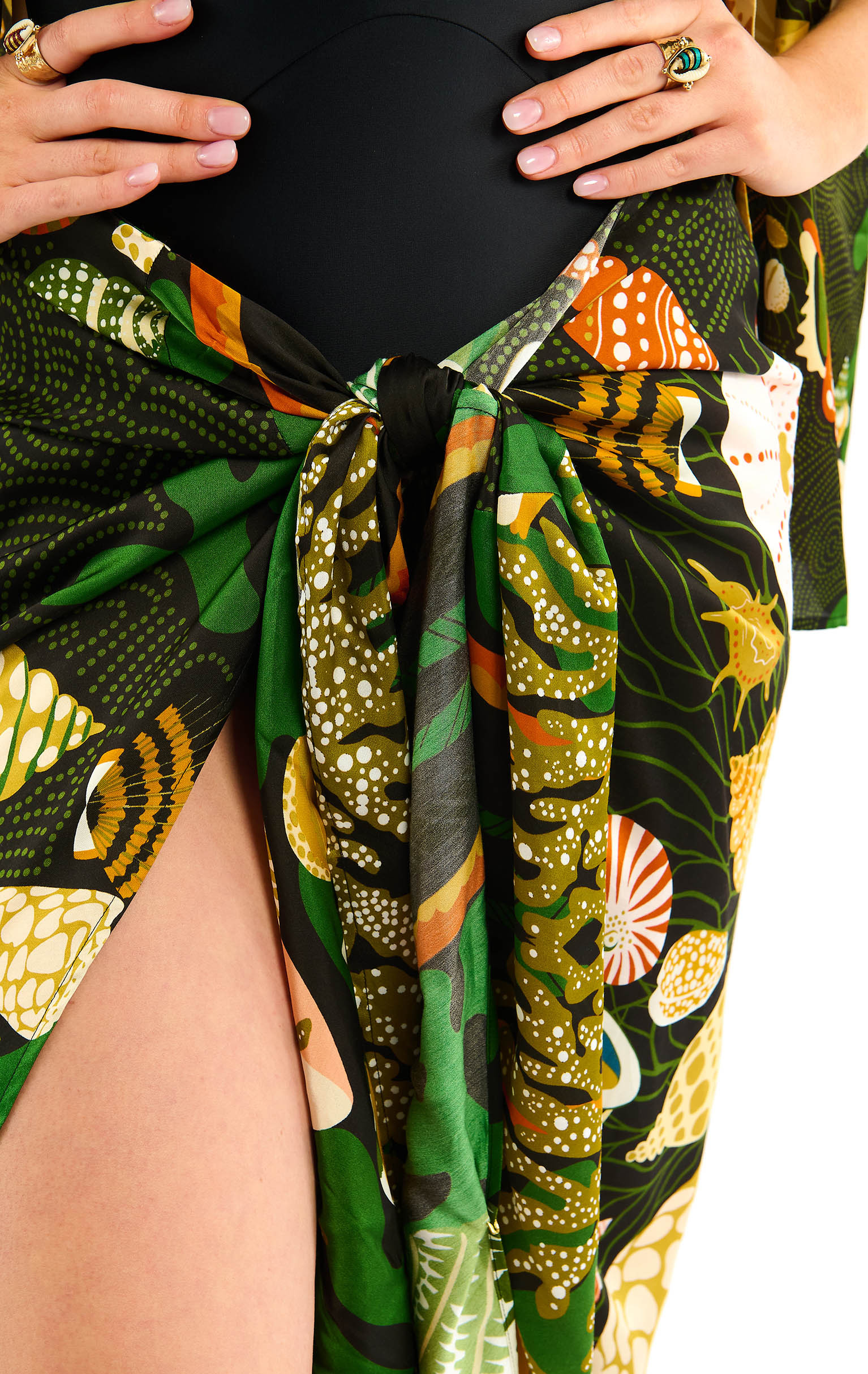 Nouée sur le devant et très joliment ouverte en une fente centrale pour révéler nos jambes hâlées, la jupe NEIJI se décline dans les deux variations de notre imprimé phare de la saison : l'imprimé Coral. Ici dans sa version noire, on retrouve ses motifs de coquillages, coraux, crustacés et créatures aquatiques qui s'animent dans un ballet de nuances chocolat, ocre, kaki, jaune et blanc sur un fond noir profond.