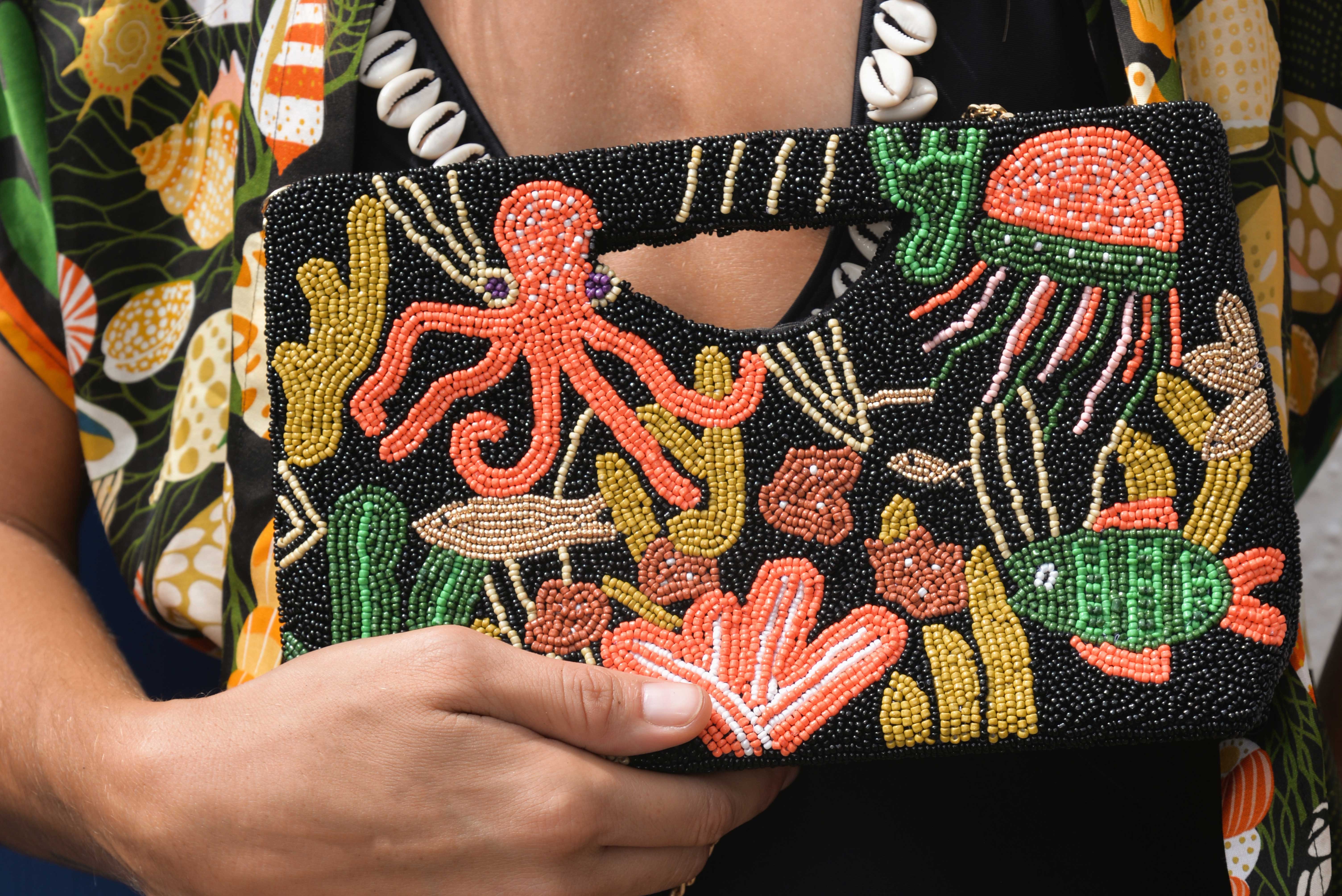 Plongée dans un univers marin stylisé où de grandes pieuvres orangées ondulent parmi poissons et fleurs aquatiques luxuriantes, la pochette RAMOS réinvente la mer en inspiration mode, onirique et divine.