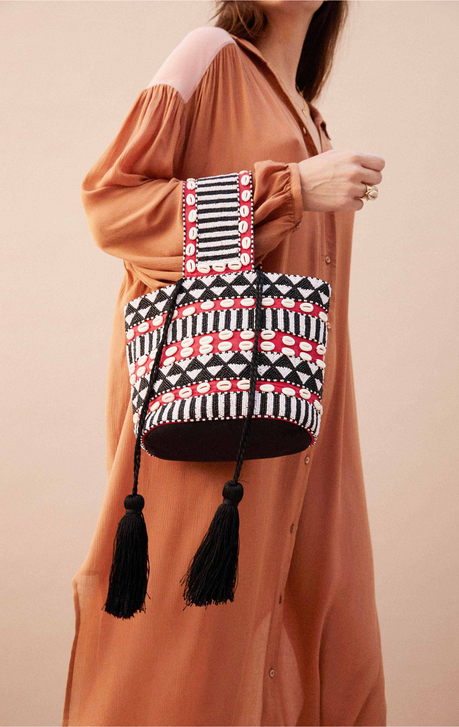 On adore ce sac seau aux allures massaï. Il est entièrement recouvert de perles de rocailles tissées à la main, reprenant les codes africains si raffinés. Il se ferme par un cordon glissière qui se termine de part et d'autre par des pompons.