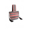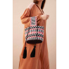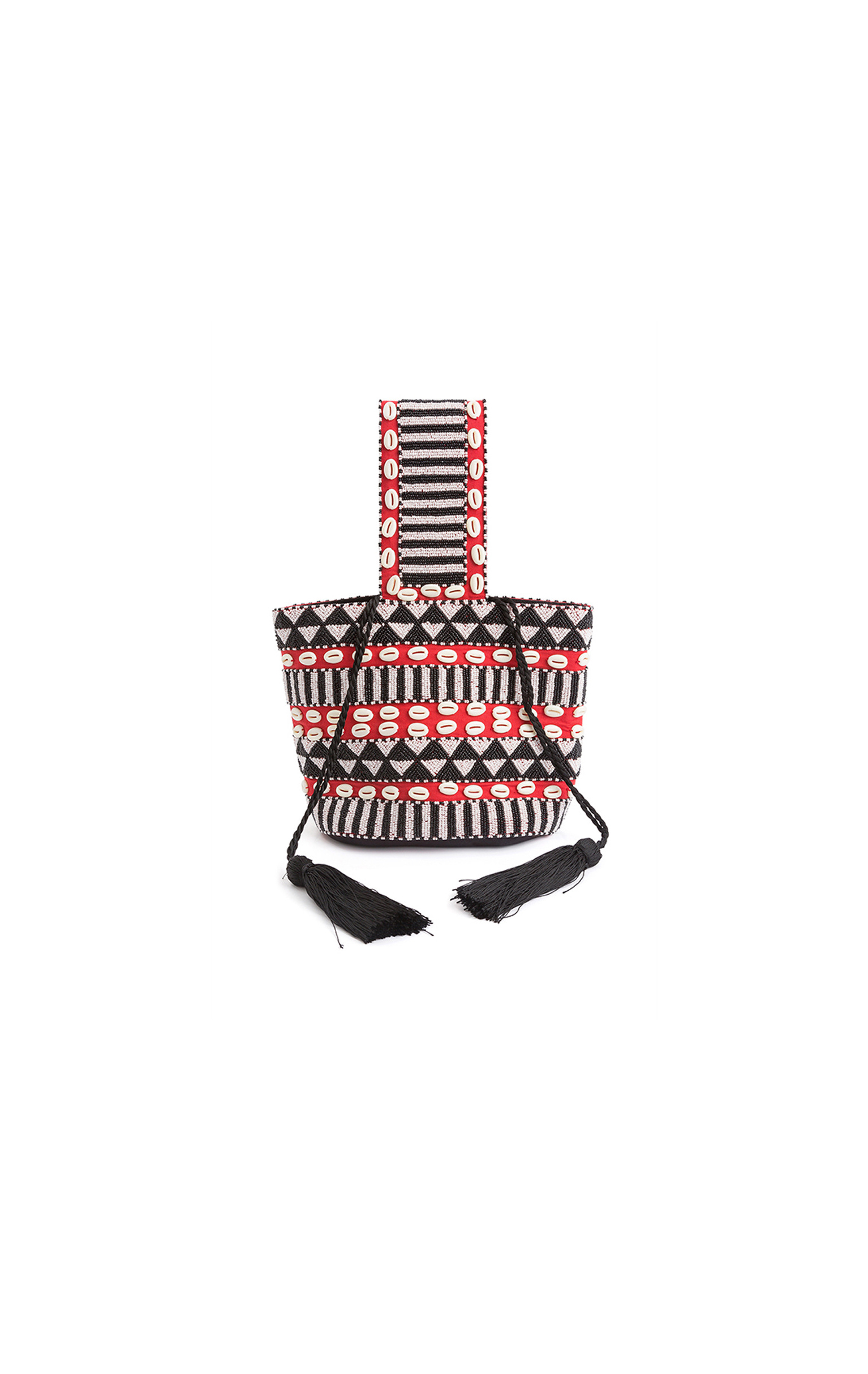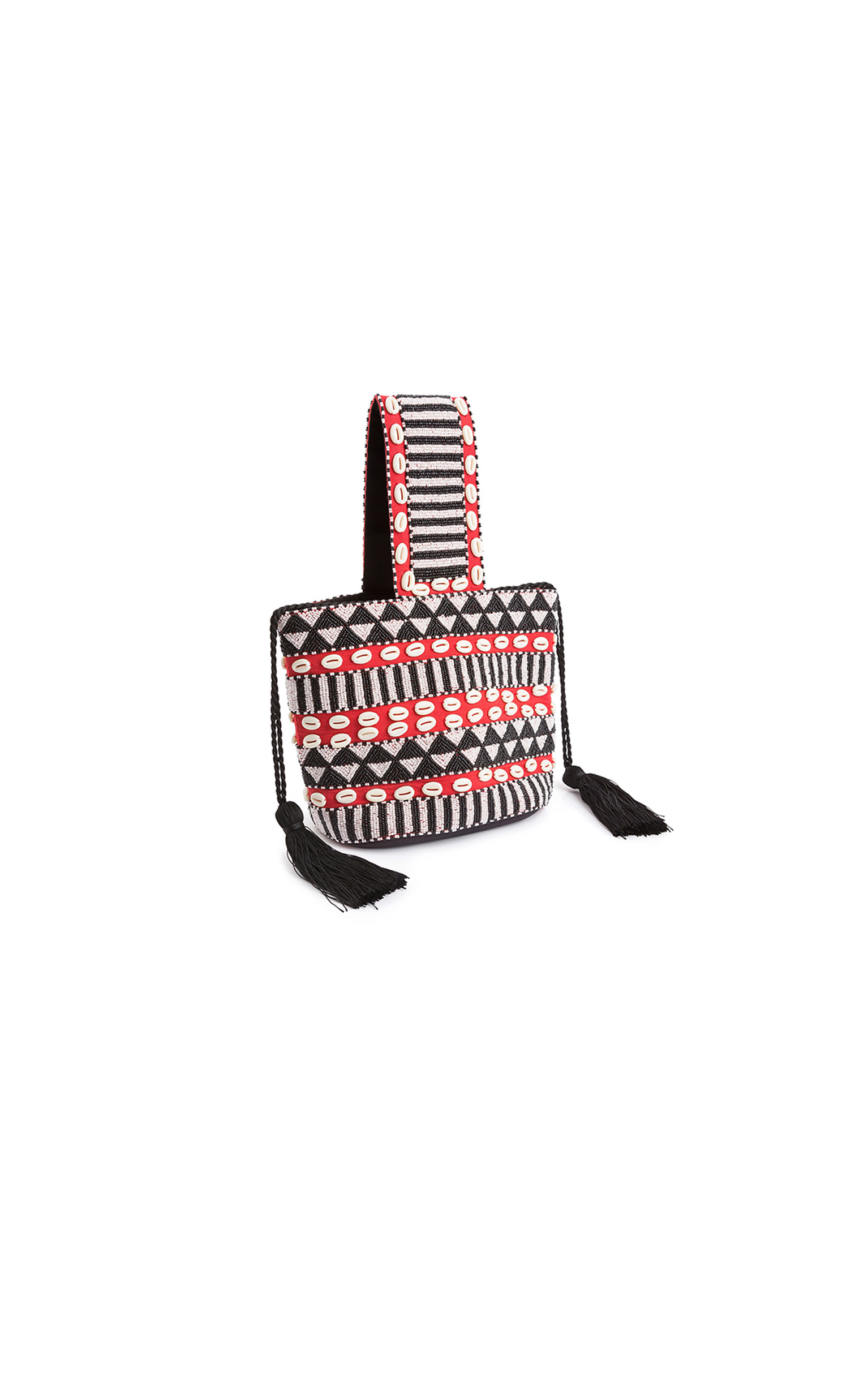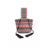 Sac seau entièrement recouvert de perles de rocailles noir, blanc et rouge disposées en formes géométriques tribales.