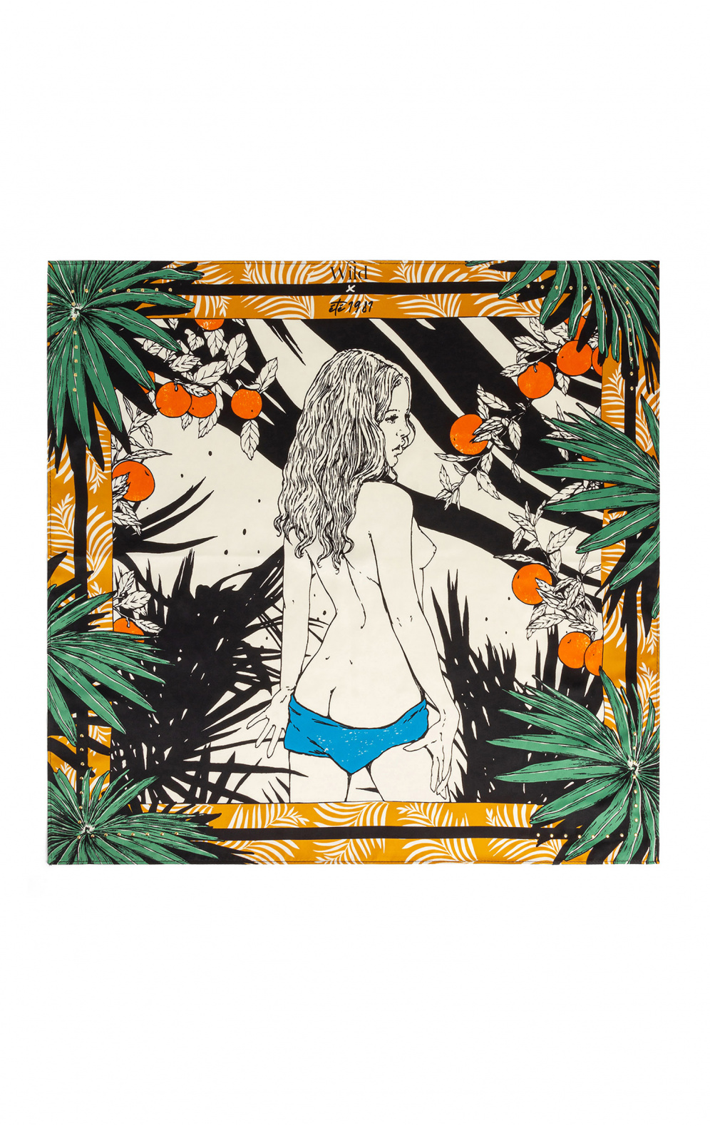Foulard décoré d'un dessin original de l'artiste "été 1981". Il repésente une jeune femme se déshabillant dans une jardin luxuriant planté d'orangers, dans les tons beige, noir, vert, jaune safran et orange.