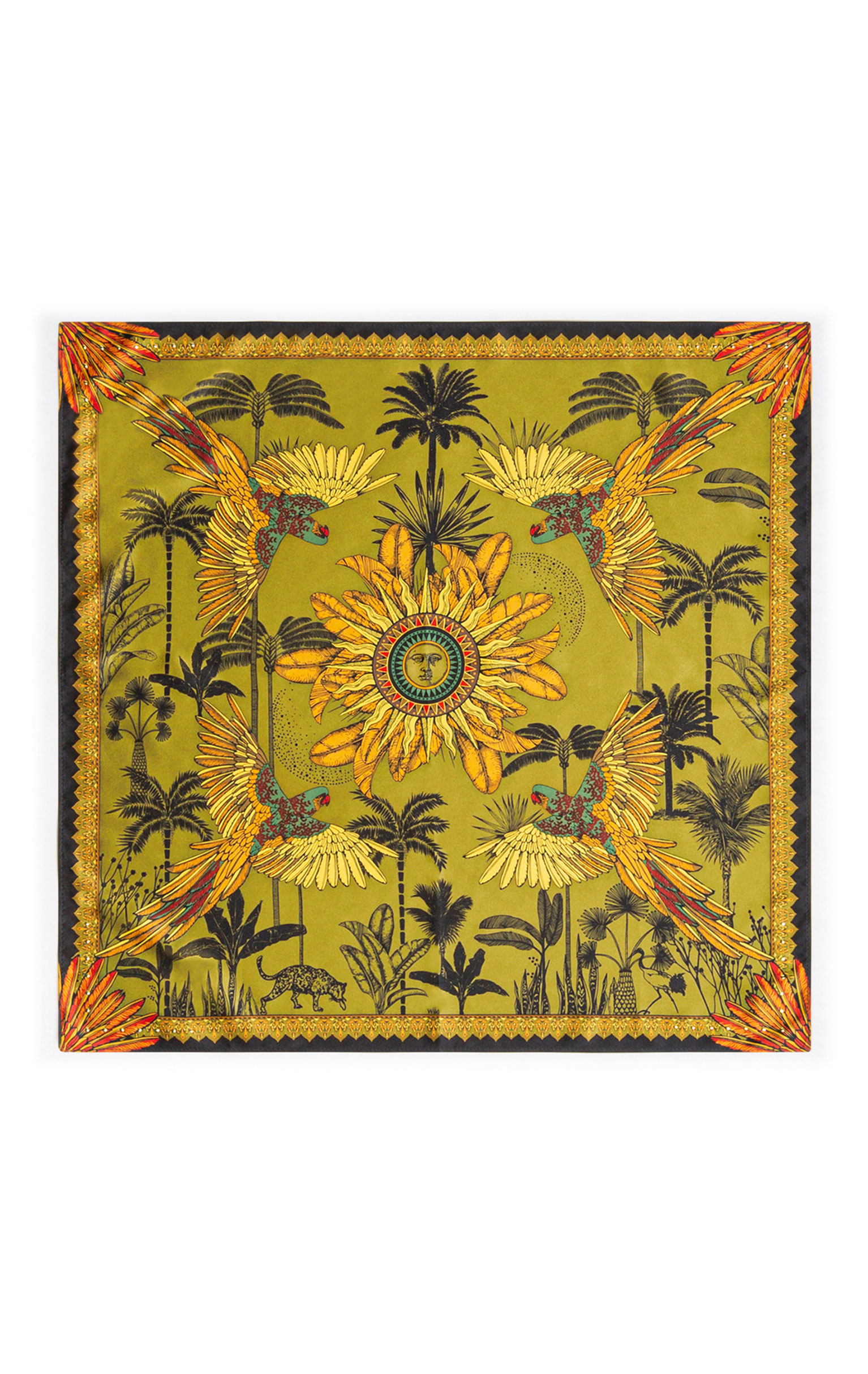 Mini-foulard représentant des perroquets jaune et vert, des oiseaux de paradis et palmiers noir et vert foncé tout autour d'un soleil sur fond pistache.